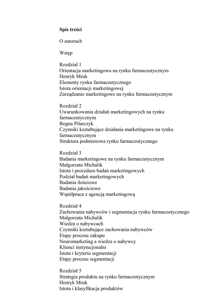 Spis treści O autorach Wstęp Rozdział 1 Orientacja marketingowa na rynku farmaceutycznym Henryk Mruk Elementy rynku farmaceutycznego Istota orientacji marketingowej Zarządzanie marketingowe na rynku farmaceutycznym Rozdział 2 Uwarunkowania działań marketingowych na rynku farmaceutycznym Bogna Pilarczyk Czynniki kształtujące działania marketingowe na rynku farmaceutycznym Struktura podmiotowa rynku farmaceutycznego Rozdział 3 Badania marketingowe na rynku farmaceutycznym Małgorzata Michalik Istota i procedura badań marketingowych Podział badań marketingowych Badania ilościowe Badania jakościowe Współpraca z agencją marketingową Rozdział 4 Zachowania nabywców i segmentacja rynku farmaceutycznego Małgorzata Michalik Wiedza o nabywcach Czynniki kształtujące zachowania nabywców Etapy procesu zakupu Neuromarketing a wiedza o nabywcy Klienci instytucjonalni Istota i kryteria segmentacji Etapy procesu segmentacji Rozdział 5 Strategia produktu na rynku farmaceutycznym Henryk Mruk Istota i klasyfikacja produktów Cykl życia produktu Zarządzanie portfelem produktów Wprowadzanie nowego produktu na rynek Błędy i bariery we wprowadzaniu nowego produktu Rola opakowania Rozdział 6 Zarządzanie marką Henryk Mruk Istota marki Marka a segmentacja i proces decyzyjny Strategie marek Pozycjonowanie marki Wartość marki i jej wycena Rozdział 7 Strategie cen i marż na rynku farmaceutycznym Henryk Mruk Cena w koncepcji marketingu mix Metody ustalania cen Strategie cenowe Ceny w świetle ekonomii behawioralnej Opusty cenowe Elastyczność cenowa popytu Marże handlowe Rozdział 8 Procesy dystrybucji na rynku farmaceutycznym Bogna Pilarczyk Istota i rodzaje kanałów dystrybucji Funkcjonowanie hurtu farmaceutycznego Pozaapteczny kanał dystrybucji leków Rozdział 9 Rola apteki na rynku farmaceutycznym Małgorzata Michalik Apteka partnerem dla producenta Wizerunek i tożsamość apteki Merchandising apteczny Usługi dodatkowe w aptece Standardy obsługi pacjenta w aptece Rozdział 10 Strategia komunikacji masowej na rynku farmaceutycznym Bogna Pilarczyk Istota komunikacji marketingowej Reklama na rynku farmaceutycznym Promocja sprzedaży na rynku farmaceutycznym Działania public relations na rynku farmaceutycznym Rozdział 11 Komunikacja indywidualna jako element marketingu mix Małgorzata Michalik Promocja osobista Promocja bezpośrednia E-pharmamarketing - nowoczesne formy komunikacji marketingowej Programy lojalnościowe Budowanie zaufania i tworzenie kultury organizacyjnej zespołu Rozdział 12 Strategie marketingowe i proces ich tworzenia na rynku farmaceutycznym Henryk Mruk, Bogna Pilarczyk Istota i proces tworzenia strategii Rodzaje strategii marketingowych Bibliografia Indeks ISBN: 978-83-264-3447-1