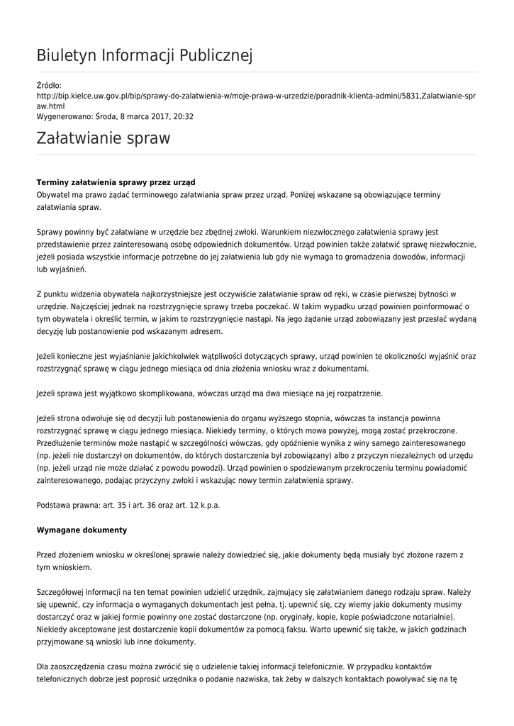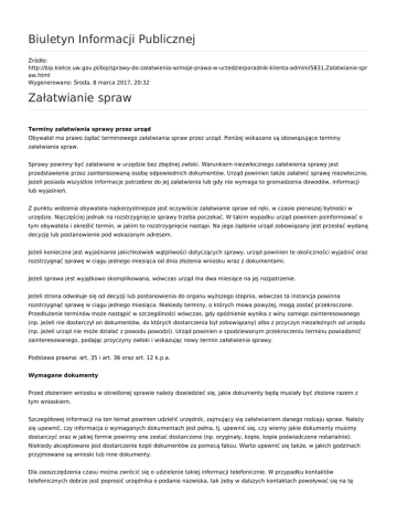 Biuletyn Informacji Publicznej Źródło: http://bip.kielce.uw.gov.pl/bip/sprawy-do-zalatwienia-w/moje-prawa-w-urzedzie/poradnik-klienta-admini/5831,Zalatwianie-spr aw.html Wygenerowano: Środa, 8 marca 2017, 20:32 Załatwianie spraw Terminy załatwienia sprawy przez urząd Obywatel ma prawo żądać terminowego załatwiania spraw przez urząd. Poniżej wskazane są obowiązujące terminy załatwiania spraw. Sprawy powinny być załatwiane w urzędzie bez zbędnej zwłoki. Warunkiem niezwłocznego załatwienia sprawy jest przedstawienie przez zainteresowaną osobę odpowiednich dokumentów. Urząd powinien także załatwić sprawę niezwłocznie, jeżeli posiada wszystkie informacje potrzebne do jej załatwienia lub gdy nie wymaga to gromadzenia dowodów, informacji lub wyjaśnień. Z punktu widzenia obywatela najkorzystniejsze jest oczywiście załatwianie spraw od ręki, w czasie pierwszej bytności w urzędzie. Najczęściej jednak na rozstrzygnięcie sprawy trzeba poczekać. W takim wypadku urząd powinien poinformować o tym obywatela i określić termin, w jakim to rozstrzygnięcie nastąpi. Na jego żądanie urząd zobowiązany jest przesłać wydaną decyzję lub postanowienie pod wskazanym adresem. Jeżeli konieczne jest wyjaśnianie jakichkolwiek wątpliwości dotyczących sprawy, urząd powinien te okoliczności wyjaśnić oraz rozstrzygnąć sprawę w ciągu jednego miesiąca od dnia złożenia wniosku wraz z dokumentami. Jeżeli sprawa jest wyjątkowo skomplikowana, wówczas urząd ma dwa miesiące na jej rozpatrzenie. Jeżeli strona odwołuje się od decyzji lub postanowienia do organu wyższego stopnia, wówczas ta instancja powinna rozstrzygnąć sprawę w ciągu jednego miesiąca. Niekiedy terminy, o których mowa powyżej, mogą zostać przekroczone. Przedłużenie terminów może nastąpić w szczególności wówczas, gdy opóźnienie wynika z winy samego zainteresowanego (np. jeżeli nie dostarczył on dokumentów, do których dostarczenia był zobowiązany) albo z przyczyn niezależnych od urzędu (np. jeżeli urząd nie może działać z powodu powodzi). Urząd powinien o spodziewanym przekroczeniu terminu powiadomić zainteresowanego, podając przyczyny zwłoki i wskazując nowy termin załatwienia sprawy. Podstawa prawna: art. 35 i art. 36 oraz art. 12 k.p.a. Wymagane dokumenty Przed złożeniem wniosku w określonej sprawie należy dowiedzieć się, jakie dokumenty będą musiały być złożone razem z tym wnioskiem. Szczegółowej informacji na ten temat powinien udzielić urzędnik, zajmujący się załatwianiem danego rodzaju spraw. Należy się upewnić, czy informacja o wymaganych dokumentach jest pełna, tj. upewnić się, czy wiemy jakie dokumenty musimy dostarczyć oraz w jakiej formie powinny one zostać dostarczone (np. oryginały, kopie, kopie poświadczone notarialnie). Niekiedy akceptowane jest dostarczenie kopii dokumentów za pomocą faksu. Warto upewnić się także, w jakich godzinach przyjmowane są wnioski lub inne dokumenty. Dla zaoszczędzenia czasu można zwrócić się o udzielenie takiej informacji telefonicznie. W przypadku kontaktów telefonicznych dobrze jest poprosić urzędnika o podanie nazwiska, tak żeby w dalszych kontaktach powoływać się na tę osobę. Jeżeli osobista wizyta w urzędzie nie jest nadmiernie uciążliwa, to wymagane informacje można uzyskać na miejscu. W wielu urzędach informacje na temat wymaganych dokumentów znajdują się w gablotach. Często udostępnione są tam również wzory prawidłowego wypełnienia formularzy. Po przyjściu do urzędu należy zatem sprawdzić, czy potrzebne nam informacje nie zostały już udostępnione w takiej formie. W wielu urzędach zostały utworzone specjalne punkty informacyjne, w których można otrzymać formularze wniosków, a także uzyskać podstawowe informacje o sposobie ich wypełnienia oraz o wymaganych dokumentach, które należy dołączyć. Wydaje się, że w przyszłości wzrastać będzie znaczenie Internetu, jako źródła pozyskiwania powyższych informacji. Należy zwrócić uwagę, że przedstawiane dokumenty muszą być autentyczne. Wykorzystywanie nieprawdziwych dokumentów jest poważnym przestępstwem, zagrożonym surowymi karami. Nie wolno dokumentów niszczyć, ani przerabiać. Nie można też wprowadzać w błąd urzędnika za pomocą dokumentów sfałszowanych. Zagrożenie karą dotyczy także urzędnika poświadczającego nieprawdę. Naruszenie tych zasad również powoduje odpowiedzialność karną. Podstawa prawna: - art. 270 kodeksu karnego: § 1. Kto, w celu użycia za autentyczny, podrabia lub przerabia dokument lub takiego dokumentu jako autentycznego używa, podlega grzywnie, karze ograniczenia wolności albo pozbawienia wolności od 3 miesięcy do lat 5. § 2. Tej samej karze podlega, kto wypełnia blankiet, opatrzony cudzym podpisem, niezgodnie z wolą podpisanego i na jego szkodę albo takiego dokumentu używa. § 3. Kto czyni przygotowania do przestępstwa określonego w § 1, podlega grzywnie, karze ograniczenia wolności albo pozbawienia wolności do lat 2. - art. 271 kodeksu karnego: § 1. Funkcjonariusz publiczny lub inna osoba uprawniona do wystawienia dokumentu, która poświadcza w nim nieprawdę co do okoliczności mającej znaczenie prawne, podlega karze pozbawienia wolności od 3 miesięcy do lat 5. § 2. W wypadku mniejszej wagi, sprawca podlega grzywnie albo karze ograniczenia wolności. § 3. Jeżeli sprawca dopuszcza się czynu określonego w § 1 w celu osiągnięcia korzyści majątkowej lub osobistej, podlega karze pozbawienia wolności od 6 miesięcy do lat 8. - art. 272 kodeksu karnego: Kto wyłudza poświadczenie nieprawdy przez podstępne wprowadzenie w błąd funkcjonariusza publicznego lub innej osoby upoważnionej do wystawienia dokumentu, podlega karze pozbawienia wolności do lat 3. - art. 273 kodeksu karnego: Kto używa dokumentu określonego w art. 271 lub 272, podlega grzywnie, karze ograniczenia wolnośc