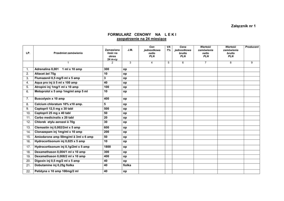 Załącznik nr 1 FORMULARZ CENOWY NA L E K I zaopatrzenie na 24 miesiące LP. Przedmiot zamówienia 1 Zamawiana ilość na okres 24 m-cy 2 J.M. 3 1. 2. 3. 4. 5. 6. Adrenalina 0,001 1 ml x 10 amp Altacet żel 75g Flumazenil 0,5 mg/5 ml x 5 amp Aqua pro inj ã 5 ml x 100 amp Atropini inj 1mg/1 ml x 10 amp Metoprolol x 5 amp 1mg/ml amp 5 ml 300 10 3 40 100 10 op op op op op op 7. Buscolysin x 10 amp 400 op 8. 9. 10. 11. 12. Calcium chloratum 10% x10 amp. Captopril 12,5 mg x 30 tabl Captopril 25 mg x 40 tabl Carbo medicinalis x 20 tabl Chlorek etylu aerozol ã 70g 5 500 50 20 30 op op op op op 13. 14. Clemastin inj 0,002/2ml x 5 amp Clonazepam inj 1mg/ml x 10 amp 600 200 op op 15. 16. Amiodarone amp 50mg/ml ã 3ml x 6 amp Hydrocortisonum inj 0,025 x 5 amp 50 10 op op 17. Hydrocortisonum inj 0,1g/2ml x 5 amp 1800 op 18. 19. 20. 21. Dexamethason 0,004/1 ml x 10 amp Dexamethason 0,008/2 ml x 10 amp Digoxin inj 0,5 mg/2 ml x 5 amp Dobutamine inj 0,25g fiolka 300 400 40 40 op op op fiolka 22. Petidyna x 10 amp 100mg/2 ml 40 op Cen jednostkowa netto PLN VA T% Cena jednostkowa brutto PLN Wartość zamówienia netto PLN Wartość zamówienia brutto PLN Producent 4 5 6 7 8 9 23. 24. 25. 26. Dopamina 0,05g/5ml x 10 amp 1% Dopamina 0,2g/5ml x 10 amp 4% Urapidil 25 mg i v. x 5 amp a 5 ml Ephedrinum h/ch/ 25mg/1ml x 10 amp 10 10 5 5 op op op op 27. 28. 29. Chlorpromazyna 25mg/5ml x 5 amp Chlorpromazyna 50mg/2mlx 10 amp Fentanyl inj 0,1 mg/2 ml 5 5 150 op op amp 30. Fraxiparine 0,3 ml x 10 amp. 6 op 31. 32. Furosemid inj 0,02/2ml x 5 amp GlucaGen 1 mg (ampułkostrzykawka) 1500 25 op 33. 34. Glukosum 20% 10 ml x 10 amp Glukosum 5% a 250 ml butelka plastikowa 300 150 op flakon 35. Glukosum 5% 500 ml butelka plastikowa Glukosum 20% 250ml butelka plastikowa Hydroxyzinum 25 mg x 30 tabl 500 flakon 800 flakon 300 op 1200 10 40 op op op 41. 42. Hydroxyzinum x 5 amp Hydroxyethylamylum 6% 250 ml Kalium effervescens gran.bezcukr. 3 g x 20 torebek Ketamina 500mg/10ml x 5 fiolek Ketonal x 10 amp 3 1600 op op 43. Norepinefrine 0,001/4ml x 5 amp 5 op 44. Lidocain aerosol ā 38 g 20 op 45. 46. 47. 48. Lidocaine 2% a 20 ml x 5 fiolek Lidocaine h/chl 2% 2 ml x 10 amp Lidocaine żel typ A a 30g Phenobarbital 0,015 x 10 czopków 15 10 100 5 op op op op 49. Magnesium Sulfuric inj doż. 2g/10ml x 10 amp Mannitol 20% a 250 ml worek plastikowy 5 op 30 flakon 36. 37. 38. 39. 40. 50. ampułkostrzykawka 51. 52. 53. Metoclopramid 10mg/2ml x 5 amp Midazolam 5 mg/1ml x 10 amp Morphini sulfas inj 0,02g/1ml x 10 amp 1800 5 30 op op op 54. Naloxonum 0,4 mg/1ml x 10 amp 10 op 55. Natr bicarbonic 8,4% 20ml x 10 amp. 20 op 56. 350 op 4500 flakon 58. Natrium chloratum 0,9 % a 10ml amp(plastik) x 100 amp Natrium chloratum 0,9% 500ml butelka palstikowa Oxycort aerosol 30g 10 op 59. 60. Nifuroxazyd tbl 0,1g x 24 tabl Nitrogliceryna aerosol x 200 dawek 40 70 op op 61. Drotaverinum tbl 0,04g x 20tabl 50 op 62. Drotaverinum 20mg/mlx5amp 2ml 700 op 63. 64. 65. Wercuronium 4 mg x 50 Oxytocin 5j x 10 amp Papaverini h/chl 0,04g/2ml x 10 amp 1 5 1200 op op op 66. Paracetamol 0,125 mg x 10 supp 50 op 67. Paracetamol a 0,250 x 10 supp. 50 op 68. Paracetamol x 30 tbl x 500 mg 200 op 69. 70. 3 400 op op 2000 flakon 72. Paracetamol 10 mg/ml fiolka i.v. 50 ml x 12szt Paski testowe do pomiaru stężenia glukozy we krwi OPTIUM XIDO x 50 szt Płyn wieloelektrolitowy a 500 ml butelka plastikowa Kwas Acetylosalicylowy 0,3g x 20 tbl 250 op 73. Tramadol 0,01/2ml x 5 amp 500 op 74. Tramadol 0,05/1ml x 5 amp 1000 op 57. 71. 75. 76. 77. 78. 79. Propranolol 0,01g x 50 tbl Propranolol inj 0,001g/1ml x 10 amp Metamizol 2.5mg/5 ml x 5 amp Pyralgin tbl x 6 tabl. 500 mg Diazepam inj 0,01g/2 ml x 50 amp 60 5 3000 500 40 op op op op 80. 30 op 81. 82. Diazepam5mg/2,5ml x 5 szt. Mikrowlewki doodbytnicze Salbutamol 0,5mg/1ml x 10 amp. Sol. Ringeri a 250 ml butelka plastikowa 10 50 op flakon 83. Spirytus salicylowy a 100g 20 butelka 84. 85. Spirytus salicylowy luzem/balon Theospirex 20 mg/ml x 5 amp 10 ml 70 800 kg op 86. 87. Thiopental 0,5 fiolka Thiethylperazine 6,5 mg/ml x 5 amp 25 150 fiolka op 88. 89. Salbutamol 0,1% 2,5mg/2,5 ml x 20 amp Rivanol 0.1 % 250ml płyn 10 5 op butelka 90. 91. 92. 93. Woda utleniona 3 % a 100g Theophyllinum 300mg/250ml Thiethylperazine 6,5 mg x 6 czopków Benzyna 800,0 100 100 5 5 butelka flakon op op R A Z E M: Słownie wartość netto ;……………………………………………………………………………… VAT……………………………………………………………………………………………………. Słownie wartość brutto :……………………………………………………………………………… Podpis, pieczęć Wykonawcy………………………………………………………………………… …………..dnia…………………………..