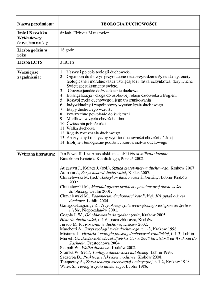 Nazwa przedmiotu: TEOLOGIA DUCHOWOŚCI Imię i Nazwisko