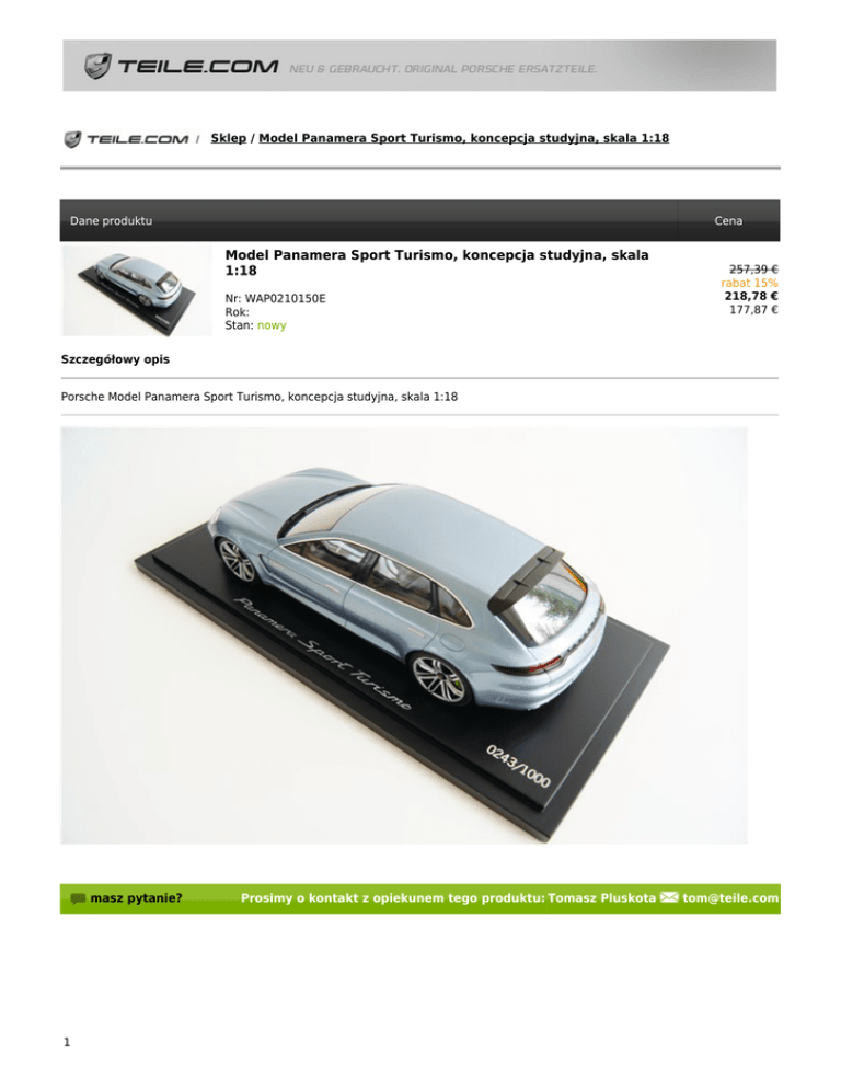 Sklep / Model Panamera Sport Turismo, koncepcja studyjna, skala 1:18 Dane produktu Cena Model Panamera Sport Turismo, koncepcja studyjna, skala 1:18 Nr: WAP0210150E Rok: Stan: nowy 257,39 € rabat 15% 218,78 € 177,87 € Szczegółowy opis Porsche Model Panamera Sport Turismo, koncepcja studyjna, skala 1:18 masz pytanie? 1 Prosimy o kontakt z opiekunem tego produktu: Tomasz Pluskota [email protected] 2 3 4 5 6