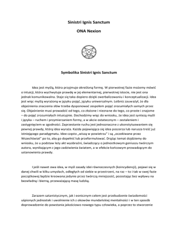 Sinistri Ignis Sanctum ONA Nexion Symbolika Sinistri Ignis Sanctum Idea jest myślą, która przyjmuje określoną formę. W pierwotnej fazie możemy mówić o intuicji, która wychwytuje prawdę w jej elementarnej, pierwotnej istocie, nie jest ona jednak komunikowalna. Staje się taka dopiero dzięki zwerbalizowaniu i konceptualizacji. Idea jest więc myślą wyrażoną w języku pojęć, języku uniwersalnym. Leibniz zauważył, że dla objaśnienia znaczenia słów trzeba dysponować zespołem pojęć zrozumiałych samych przez się. Objaśnienie musi prowadzić od tego, co złożone i nieznane do tego, co proste i znajome – do pojęć zrozumiałych intuicyjnie. Dochodzimy więc do wniosku, że idea jest syntezą myśli i języka – ruchem i przymierzaniem formy, a w akcie ostatecznym – zestaleniem i zastygnięciem w zgodności. Zaprzestanie ruchu jest jednoznaczne z ukonstytuowaniem się pewnej prawdy, którą idea wyraża. Każda pojawiająca się idea poszerza lub narusza treść już istniejącego paradygmatu. Idee często „wiszą w powietrzu” i są „oczekiwane przez Wszechświat” po to, aby go dopełnić lub przeformułować. Drążąc temat dojdziemy do wniosku, że u podstaw leży akt wyobraźni, świadczący o jednostkowym geniuszu twórczym autora, wynikającym z jego zadziwienia światem, a w efekcie końcowym prowadzącym do ustanowienia prawdy. I jeśli nawet owa idea, w myśl zasady idei równoczesnych (koincydencji), pojawi się w danej chwili w kilku umysłach, odległych od siebie w przestrzeni, na raz – to i tak w swej fazie początkowej będzie kreowana jedynie przez twórczą mniejszość, pozostając bez wpływu na bezwładną i bierną, przeważającą masę ludzką. Zarazem satanistycznym, jak i eonicznym celem jest przebudzenie świadomości uśpionych jednostek i uwolnienie ich z okowów mundańskiej mentalności i w ten sposób doprowadzenie do powstania jakościowo nowego typu człowieka, a poprzez to stworzenie i przejście do następnego Eonu. Na poziomie indywidualnym celem jest osiągnięcie stopnia Adepta, a dla nielicznych – pójście jeszcze dalej. Zmiana nie polega jednak na kosmetycznej korekcie i naciągnięciu dla satanistycznych potrzeb dotychczasowego widzenia świata, ani nie na bezmyślnym zaakceptowaniu nowej dogmatyki czy „religijnym nawróceniu” na wiarę w Szatana. Nie ma tu drogi na skróty. Osiągniecie stopnia Adepta zabiera lata, jednocześnie wymagając poświęcenia, wysiłku i maksymalnej pracy nad sobą. Na poziomie zbiorowym, gdzie celem jest zmiana eoniczna, proces trwa o wiele dłużej. Zmiana, aby stać się immanentną i realną, musi być zmianą organiczną, u podstaw. Tylko wtedy możemy mówić o ukonstytuowaniu się nowego etosu, obowiązującego w nowo tworzącym się Eonie. Obecny Eon – „Eon Cywilizacji Zachodniej” – jak wszystkie poprzednie, zmierza ku swemu końcowi. Kontynuacja procesu dezintegracji, zgodnie ze schematem ewolucyjnym zachodzącym w dotychczas zaistniałych Eonach, będzie miała swe miejsce w fazie określonej jako Imperium, następującej po Okresie Zaburzeń. Przechodzenie przez kolejne stadia cywilizacyjne zachodzi na swój sposób biernie – bez świadomego udziału większości jednostek w tym uczestniczących. Tylko nieliczni posiadają wiedzę dokonujących się zmian. Jeszcze mniej liczni są w stanie te zmiany świadomie kreować. Wiedza ta daje moc. Poprzez procesy zakłócania, herezji, rewolucji, destrukcji, walki, chaosu, kreacji i odrodzenia w nowym porządku pozwala stworzyć i osiągnąć nowy wymiar egzystencji zarówno na poziomie zbiorowym, jak i jednostkowym. Właśnie na fali „codziennych” prób przeformułowania rzeczywistości podejmowane są akty tworzenia nowych ideologii, ruchów, rytualizacja, medytacja, poszerzanie wglądu w siebie i w otaczającą rzeczywistość, a w wymiarze charakterystycznym dla ONA: zakładanie i rozwijanie struktur jakimi są Nexiony. Sinistri Ignis Sanctum (SIS) – „Sanktuarium Mrocznego Ognia”, pierwszy Nexion ONA w Polsce. SIS jest przyczynową formą skupiającą jednostki aktywnie i kreatywnie podążające Siedmiostopniową Mroczną Ścieżką (Seven-Fold Sinister Way). W zakresie ezoterycznym będzie to podejmowanie różnych form rytualizacji wspomagających prezentację Energii Bezprzyczynowej (Acausal), magiczne wzmacnianie form leworęcznych, tworzenie ideowej opozycji do walki z chorobą nazareńską, wyjście ponad ego oraz samorozwój. W zakresie egzoterycznym – świadome operowanie czynnikami budującymi bądź destabilizującymi konkretne struktury społeczne, rozwijanie aspektu drapieżnika, przygotowywanie przyszłych Adeptów, prowadzenie własnej Świątyni, samodoskonalenie zarówno intelektualne, jaki psychiczne oraz fizyczne. Wszystko po to, aby świadomie wziąć udział w kreacji nowego Eonu. Wszystko po to, by móc zatańczyć na krawędzi. W naszym logo jest Uroboros – pradawny wąż, który zwinąwszy się w kształt koła połyka własny ogon. Symbolizuje nieskończoność, sam nieskończonością będąc. Jest wiecznym odchodzeniem i wiecznym powracaniem – zjednoczeniem przeciwieństw (mistyczne Coniunctio/Unio Oppositorum). Przypomina, że zawsze i wszędzie mieszają się przeszłość, teraźniejszość i przyszłość. W każdym zdarzeniu kryje się wieczność. Jako symbol gnostyków Uroboros wyraża duchową i fizyczną jedność wszechrzeczy. Uroboros to też odpowiednik kamienia filozoficznego. W symbolice alchemicznej jest symbolem zamkniętego, stale się powtarzającego procesu przemiany materii – procesu, który ma prowadzić do sublimacji substancji. W kategoriach jednostkowych sublimacja jest tu utożsamiona z uwzniośleniem i samodoskonaleniem. Mroczni Bogowie zaklęci w symbolice Sinistri Ignis Sanctum Vindex Jest bramą do krainy Wielkich Nieśmiertelnych dla tych, którzy stali się dziełem własnej kreacji. Jest transferem ich strumienia świadomości do A