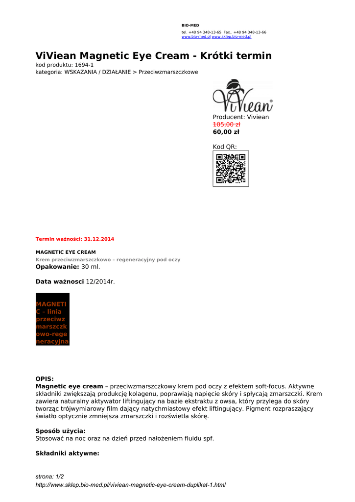BIO-MED tel. +48 94 348-13-65 Fax.. +48 94 348-13-66 www.bio-med.pl www.sklep.bio-med.pl ViViean Magnetic Eye Cream - Krótki termin kod produktu: 1694-1 kategoria: WSKAZANIA / DZIAŁANIE > Przeciwzmarszczkowe Producent: Viviean 105,00 zł 60,00 zł Kod QR: Termin ważności: 31.12.2014 MAGNETIC EYE CREAM Krem przeciwzmarszczkowo – regeneracyjny pod oczy Opakowanie: 30 ml. Data ważnosci 12/2014r. MAGNETI C – linia przeciwz marszczk owo-rege neracyjna OPIS: Magnetic eye cream – przeciwzmarszczkowy krem pod oczy z efektem soft-focus. Aktywne składniki zwiększają produkcję kolagenu, poprawiają napięcie skóry i spłycają zmarszczki. Krem zawiera naturalny aktywator liftingujący na bazie ekstraktu z owsa, który przylega do skóry tworząc trójwymiarowy film dający natychmiastowy efekt liftingujący. Pigment rozpraszający światło optycznie zmniejsza zmarszczki i rozświetla skórę. Sposób użycia: Stosować na noc oraz na dzień przed nałożeniem fluidu spf. Składniki aktywne: strona: 1/2 http://www.sklep.bio-med.pl/viviean-magnetic-eye-cream-duplikat-1.html matrixyl - peptyd otrzymywany biotechnologicznie posiadający zdolności wypełniania zmarszczek od wewnątrz. Wnikając w skórę dociera do fibroblastów, stymuluje je do produkcji kolagenu, spłyca głębokość zmarszczek i uelastycznia skórę, betaglukany - polisacharyd pozyskiwany z owsa. Aktywizuje system immunologiczny chroniąc skórę przed niekorzystnymi czynnikami zewnętrznymi. Posiada zdolność stymulowania komórek wpływając na spłycenie zmarszczek. Właściwości obronne i przeciwzmarszczkowe zawdzięczamy CM-glucan, si-matrix - spowalnia procesy starzenia się skóry i posiada zdolność restrukturyzacji tkanki łącznej. Ujędrnia i wzmacnia tkankę skóry polepszając owal twarzy oraz spłyca zmarszczki. Si-Matrix to nowa, przełomowa koncepcja łącząca dwie technologie: struktury krzemionkowych mikro gąbek ułatwiające ich rozprowadzenie do skóry oraz filmu molekularnego, który uwalania mikrogąbki organicznego krzemu w głąb skóry na miarę jej potrzeb, masło shea - działa odżywczo, regenerująco i uelastycznia skórę, olejek z nasion winogron - posiada właściwości antyoksydacyjne. MAGNETIC – linia przeciwzmarszczkowo-regeneracyjna Kosmetyki przeciwzmarszczkowo-regeneracyjne dla cer dojrzałych polepszające gęstość skóry. Zawierają aktywne składniki najnowszej generacji, których skuteczność jest potwierdzona testami. Przedłużają młodość skóry, zwiększają poziom kolagenu, spłycają zmarszczki i poprawiają owal twarzy. Polecane dla osób po 50 roku życia i 45 w przypadku utraty elastyczności skóry oraz zmarszczkach. // strona: 2/2 http://www.sklep.bio-med.pl/viviean-magnetic-eye-cream-duplikat-1.html