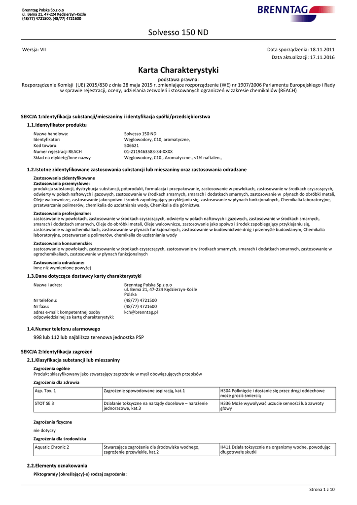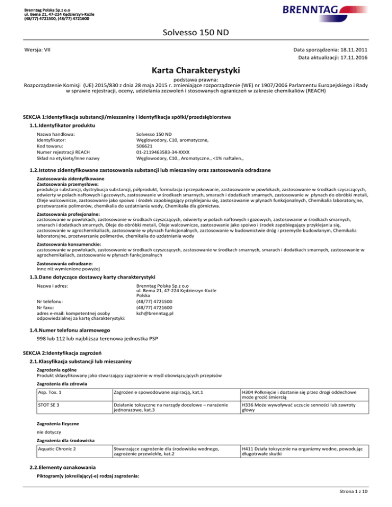 Brenntag Polska Sp.z o.o ul. Bema 21, 47-224 Kędzierzyn-Kożle (48/77) 4721500, (48/77) 4721600 Solvesso 150 ND Wersja: VII Data sporządzenia: 18.11.2011 Data aktualizacji: 17.11.2016 Karta Charakterystyki podstawa prawna: Rozporządzenie Komisji (UE) 2015/830 z dnia 28 maja 2015 r. zmieniające rozporządzenie (WE) nr 1907/2006 Parlamentu Europejskiego i Rady w sprawie rejestracji, oceny, udzielania zezwoleń i stosowanych ograniczeń w zakresie chemikaliów (REACH) SEKCJA 1:Identyfikacja substancji/mieszaniny i identyfikacja spółki/przedsiębiorstwa 1.1.Identyfikator produktu Nazwa handlowa: Identyfikator: Kod towaru: Numer rejestracji REACH Skład na etykietę/Inne nazwy Solvesso 150 ND Węglowodory, C10, aromatyczne, 506621 01-2119463583-34-XXXX Węglowodory, C10., Aromatyczne., <1% naftalen., 1.2.Istotne zidentyfikowane zastosowania substancji lub mieszaniny oraz zastosowania odradzane Zastosowania zidentyfikowane Zastosowania przemysłowe: produkcja substancji, dystrybucja substancji, półprodukt, formulacja i przepakowanie, zastosowanie w powłokach, zastosowanie w środkach czyszczących, odwierty w polach naftowych i gazowych, zastosowanie w środkach smarnych, smarach i dodatkach smarnych, zastosowanie w płynach do obróbki metali, Oleje walcownicze, zastosowanie jako spoiwo i środek zapobiegający przyklejaniu się, zastosowanie w płynach funkcjonalnych, Chemikalia laboratoryjne, przetwarzanie polimerów, chemikalia do uzdatniania wody, Chemikalia dla górnictwa. Zastosowania profesjonalne: zastosowanie w powłokach, zastosowanie w środkach czyszczących, odwierty w polach naftowych i gazowych, zastosowanie w środkach smarnych, smarach i dodatkach smarnych, Oleje do obróbki metali, Oleje walcownicze, zastosowanie jako spoiwo i środek zapobiegający przyklejaniu się, zastosowanie w agrochemikaliach, zastosowanie w płynach funkcjonalnych, zastosowanie w budownictwie dróg i przemyśle budowlanym, Chemikalia laboratoryjne, przetwarzanie polimerów, chemikalia do uzdatniania wody Zastosowania konsumenckie: zastosowanie w powłokach, zastosowanie w środkach czyszczących, zastosowanie w środkach smarnych, smarach i dodatkach smarnych, zastosowanie w agrochemikaliach, zastosowanie w płynach funkcjonalnych Zastosowania odradzane: inne niż wymienione powyżej 1.3.Dane dotyczące dostawcy karty charakterystyki Nazwa i adres: Nr telefonu: Nr faxu: adres e-mail: kompetentnej osoby odpowiedzialnej za kartę charakterystyki: Brenntag Polska Sp.z o.o ul. Bema 21, 47-224 Kędzierzyn-Kożle Polska (48/77) 4721500 (48/77) 4721600 [email protected] 1.4.Numer telefonu alarmowego 998 lub 112 lub najbliższa terenowa jednostka PSP SEKCJA 2:Identyfikacja zagrożeń 2.1.Klasyfikacja substancji lub mieszaniny Zagrożenia ogólne Produkt sklasyfikowany jako stwarzający zagrożenie w myśl obowiązujących przepisów Zagrożenia dla zdrowia Asp. Tox. 1 Zagrożenie spowodowane aspiracją, kat.1 H304 Połknięcie i dostanie się przez drogi oddechowe może grozić śmiercią STOT SE 3 Działanie toksyczne na narządy docelowe – narażenie jednorazowe, kat.3 H336 Może wywoływać uczucie senności lub zawroty głowy Stwarzające zagrożenie dla środowiska wodnego, zagrożenie przewlekłe, kat.2 H411 Działa toksycznie na organizmy wodne, powodując długotrwałe skutki Zagrożenia fizyczne nie dotyczy Zagrożenia dla środowiska Aquatic Chronic 2 2.2.Elementy oznakowania Piktogram(y )określający(-e) rodzaj zagrożenia: Strona 1 z 10 Brenntag Polska Sp.z o.o ul. Bema 21, 47-224 Kędzierzyn-Kożle (48/77) 4721500, (48/77) 4721600 Solvesso 150 ND Hasło ostrzegawcze: Niebezpieczeństwo Zwrot(-y) wskazujący(-e) rodzaj zagrożenia: H304 Połknięcie i dostanie się przez drogi oddechowe może grozić śmiercią H336 Może wywoływać uczucie senności lub zawroty głowy H411 Działa toksycznie na organizmy wodne, powodując długotrwałe skutki Zwroty EUH EUH066 Powtarzające się narażenie może powodować wysuszanie lub pękanie skóry. Zwrot(-y) wskazujący(-e) środki ostrożności: P210 Przechowywać z dala od źródeł ciepła/iskrzenia/otwartego ognia/gorących powierzchni. Palenie wzbronione. P261 Unikać wdychania pyłu/dymu/gazu/mgły/par/ rozpylonej cieczy. P271 Stosować wyłącznie na zewnątrz lub w dobrze wentylowanym pomieszczeniu P273 Unikać uwolnienia do środowiska P280 Stosować rękawice ochronne/odzież ochronną/ ochronę oczu/ochronę twarzy. P301+P310 W PRZYPADKU POŁKNIĘCIA: Natychmiast skontaktować się z OŚRODKIEM ZATRUĆ lub z lekarzem. P304+P340 W PRZYPADKU DOSTANIA SIĘ DO DRÓG ODDECHOWYCH: wyprowadzić lub wynieść poszkodowanego na świeże powietrze i zapewnić warunki do odpoczynku w pozycji umożliwiającej swobodne oddychanie. P312 W przypadku złego samopoczucia skontaktować się z OŚRODKIEM ZATRUĆ lub z lekarzem. P331 NIE wywoływać wymiotów. P391 Zebrać wyciek P403+P233 Przechowywać w dobrze wentylowanym miejscu. Przechowywać pojemnik szczelnie zamknięty. P405 Przechowywać pod zamknięciem P501a Zawartość/pojemnik usuwać do licencjonowanego odbiorcy odpadów 2.3.Inne zagrożenia Materiał może kumulować ładunki statyczne, które mogą powodować zapłon. W wyniku ogrzewania mogą powstać łatwo palne pary, które mogą tworzyć mieszaninę wybuchową z powietrzem. Pary mogą tworzyć mieszniny wybuchowe z powietrzem w temperaturach powyżej temperatury zapłonu. Kontakt z oczami może powodować podrażnienie. Może powodować podrażnienie dróg oddechowych. Powtarzalne narażenie może powodować wysuszenie lub pękanie skóry Może powodować depresję centralnego systemu nerwowego. Produkt nie spełnia kryteriów PBT lub vPvB zgodnie z załącznikiem XIII Rozporzadzenia (WE) Nr 1907/2006. SEKCJA 3:Skład/informacja o składnikach 3.1.Substancje Wartość stężenia Substancja CAS 100 % Węglowodory, brak C10, aromatyczne, < 1% naftalenu 918-811- nie dotyczy 1 <1% Naftalen 202-049- 601-052-00-2 5 91-20-3 WE Numer indek