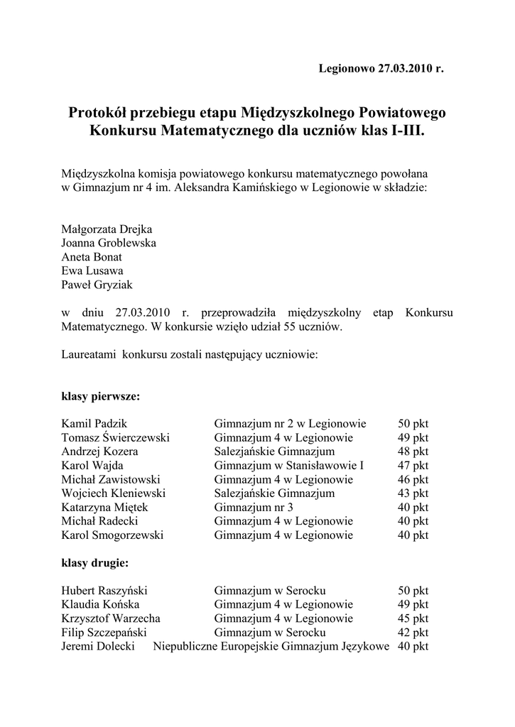 Legionowo 27.03.2010 r. Protokół przebiegu etapu Międzyszkolnego Powiatowego Konkursu Matematycznego dla uczniów klas I-III. Międzyszkolna komisja powiatowego konkursu matematycznego powołana w Gimnazjum nr 4 im. Aleksandra Kamińskiego w Legionowie w składzie: Małgorzata Drejka Joanna Groblewska Aneta Bonat Ewa Lusawa Paweł Gryziak w dniu 27.03.2010 r. przeprowadziła międzyszkolny etap Konkursu Matematycznego. W konkursie wzięło udział 55 uczniów. Laureatami konkursu zostali następujący uczniowie: klasy pierwsze: Kamil Padzik Tomasz Świerczewski Andrzej Kozera Karol Wajda Michał Zawistowski Wojciech Kleniewski Katarzyna Miętek Michał Radecki Karol Smogorzewski Gimnazjum nr 2 w Legionowie Gimnazjum 4 w Legionowie Salezjańskie Gimnazjum Gimnazjum w Stanisławowie I Gimnazjum 4 w Legionowie Salezjańskie Gimnazjum Gimnazjum nr 3 Gimnazjum 4 w Legionowie Gimnazjum 4 w Legionowie 50 pkt 49 pkt 48 pkt 47 pkt 46 pkt 43 pkt 40 pkt 40 pkt 40 pkt klasy drugie: Hubert Raszyński Gimnazjum w Serocku Klaudia Końska Gimnazjum 4 w Legionowie Krzysztof Warzecha Gimnazjum 4 w Legionowie Filip Szczepański Gimnazjum w Serocku Jeremi Dolecki Niepubliczne Europejskie Gimnazjum Językowe 50 pkt 49 pkt 45 pkt 42 pkt 40 pkt klasy trzecie: Martyna Kamola Jacek Zdziech Adam Winiarczuk Przemysław Grochowski Błażej Woźniak Maciej Markiewicz Maciej Piątek Dariusz Kałyńczak Katarzyna Kacperska Paweł Maśluch Julia Chętnicka Blanka Lutomirska Katarzyna Krzyszowska Gimnazjum w Serocku Gimnazjum 4 w Legionowie Gimnazjum 4 w Legionowie Gimnazjum 4 w Legionowie Gimnazjum nr 2 w Legionowie Salezjańskie Gimnazjum Gimnazjum 4 w Legionowie Gimnazjum w Stanisławowie I Gimnazjum w Serocku Gimnazjum w Stanisławowie I Gimnazjum w Stanisławowie I Gimnazjum w Serocku Gimnazjum nr 3 50 pkt 49 pkt 49 pkt 49 pkt 49 pkt 48 pkt 44 pkt 44 pkt 43 pkt 42 pkt 42 pkt 41 pkt 40 pkt Finalistami konkursu zostali następujący uczniowie: klasy pierwsze: Krzysztof Dulęba Bartosz Adamczewski Mateusz Delis Mateusz Przygoda Magdalena Kamola Cezary Walkowski Szymon Koperkiewicz Filip Kondej Wiktoria Ostrowska Gimnazjum w Stanisławowie I Gimnazjum 4 w Legionowie Gimnazjum w Stanisławowie I Gimnazjum 4 w Legionowie Gimnazjum w Serocku Gimnazjum w Serocku Gimnazjum 4 w Legionowie Gimnazjum w Stanisławowie I Gimnazjum w Stanisławowie I 39 pkt 39 pkt 36 pkt 35 pkt 31 pkt 30 pkt 30 pkt 30 pkt 26 pkt Salezjańskie Gimnazjum Salezjańskie Gimnazjum Gimnazjum w Stanisławowie I 37 pkt 35 pkt 27 pkt klasy drugie: Tomasz Owczarczyk Piotr Jakubowski Daniel Sienkiewicz Marta Ostaszewska Gimnazjum w Serocku 27 pkt klasy trzecie: Katarzyna Błazik Niepubliczne Europejskie Gimnazjum Językowe Bartłomiej Białas Gimnazjum w Serocku Paweł Szeląg Niepubliczne Europejskie Gimnazjum Językowe Maciej Milczarczyk Gimnazjum w Stanisławowie I Piotr Pawlak Gimnazjum w Serocku 35 pkt 33 pkt 31 pkt 31 pkt 26 pkt