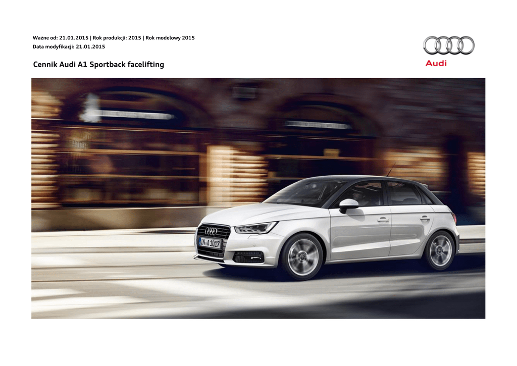Ważne od: 21.01.2015 | Rok produkcji: 2015 | Rok modelowy 2015 Data modyfikacji: 21.01.2015 Cennik Audi A1 Sportback facelifting Ważne od: 21.01.2015 | Rok produkcji: 2015 | Rok modelowy 2015 Data modyfikacji: 21.01.2015 Cennik Audi A1 Sportback facelifting Modele bazowe Silnik Moc [l] [ kW / KM ] Skrzynia biegów Kod Cena z VAT [ PLN ] Audi A1 Sportback 1.4 TFSI 92/125 6 biegów 8XFAJC 86 000 1.4 TFSI 92/125 S tronic 8XFAJG 93 800 1.4 TFSI CoD 110/150 6 biegów 8XFAKC 93 900 1.4 TFSI CoD 110/150 S tronic 8XFAKG 101 800 1.4 TDI ultra 66/90 5-biegów 8XFAR4 83 800 1.4 TDI ultra 66/90 S tronic 8XFARG 92 500 1.6 TDI 85/116 5-biegów 8XFA14 90 700 1.6 TDI 85/116 S tronic 8XFA1G 98 600 1.4 TFSI 92/125 6 biegów 8XFBJC 91 700 1.4 TFSI 92/125 S tronic 8XFBJG 99 500 1.4 TFSI CoD 110/150 6 biegów 8XFBKC 99 600 1.4 TFSI CoD 110/150 S tronic 8XFBKG 107 500 1.8 TFSI 141/192 S tronic 8XFBLG cena w uzg. Audi A1 Sportback Sport 2 Ważne od: 21.01.2015 | Rok produkcji: 2015 | Rok modelowy 2015 Data modyfikacji: 21.01.2015 Cennik Audi A1 Sportback facelifting Modele bazowe Silnik Moc Skrzynia biegów Kod Cena z VAT [l] [ kW / KM ] 1.4 TDI ultra 66/90 5-biegów 8XFBR4 89 500 1.4 TDI ultra 66/90 S tronic 8XFBRG 98 200 1.6 TDI 85/116 5-biegów 8XFB14 96 400 1.6 TDI 85/116 S tronic 8XFB1G 104 300 1.4 TFSI 92/125 6 biegów 8XFCJC 91 500 1.4 TFSI 92/125 S tronic 8XFCJG 99 300 1.4 TFSI CoD 110/150 6 biegów 8XFCKC 99 400 1.4 TFSI CoD 110/150 S tronic 8XFCKG 107 300 1.4 TDI ultra 66/90 5-biegów 8XFCR4 89 300 1.4 TDI ultra 66/90 S tronic 8XFCRG 98 000 1.6 TDI 85/116 5-biegów 8XFC14 96 200 1.6 TDI 85/116 S tronic 8XFC1G 104 000 [ PLN ] Audi A1 Sportback Design Do podanych cen należy doliczyć koszty transportu i przygotowania samochodu do wydania w łącznej kwocie 670 PLN brutto. Przedstawione informacje są aktualne w momencie publikacji. Zastrzega się możliwość wprowadzania zmian bez uprzedzenia. Cennik nie stanowi oferty w rozumieniu prawa. 3 Ważne od: 21.01.2015 | Rok produkcji: 2015 | Rok modelowy 2015 Data modyfikacji: 21.01.2015 Cennik Audi A1 Sportback facelifting A1 Sportback fl A1 Sportback sport fl A1 Sportback sport 1.8 TFSI 192KM fl A1 Sportback design fl Wyposażenie standardowe ESC • • • • Reflektory halogenowe • • • • Reflektory ksenonowe plus ze światłami do jazdy dziennej – – • – Światła tylne w technice LED – – • • Światła przeciwmgielne z przodu – • – – Układ zmywania reflektorów – – • – Servotronic • • • • Wskaźnik ciśnienia w oponach • • • • Adaptacyjne światła hamowania • • • • Immobiliser elektroniczny • • • • Asystent podjazdu (dla skrzyni S tronic) • • • • Sygnalizacja niezapiętych pasów bezpieczeństwa • • • • Isofix - uchwyty mocujące do fotelika dziecięcego dla siedzeń z tyłu • • • • Poduszki powietrzne czołowe dla kierowcy i pasażera • • • • Deaktywacja poduszki powietrznej pasażera • • • • Poduszki powietrzne boczne w oparciach przednich siedzeń • • • • Kurtyny powietrzne • • • • Śruby zabezpieczające koła przed kradzieżą • • • • Bezpieczeństwo • dostępne wyposażenie | - niedostępne wyposażenie 4 Ważne od: 21.01.2015 | Rok produkcji: 2015 | Rok modelowy 2015 Data modyfikacji: 21.01.2015 Cennik Audi A1 Sportback facelifting A1 Sportback fl A1 Sportback sport fl A1 Sportback sport 1.8 TFSI 192KM fl A1 Sportback design fl Wyposażenie standardowe Tire mobility set - zestaw naprawczy do opon • • • • Trójkąt ostrzegawczy i apteczka • • • • Klimatyzacja manualna • • • • Centralny zamek sterowny falami radiowymi • • • • Kanapa tylna ze składanym i dzielonym oparciem • • • • Radio chorus • • • • Pakiet oświetlenia wnętrza w technice LED – – • – Szyby regulowane elektrycznie • • • • Komputer pokładowy z programem efficiency – • • • Audi drive select (niedostępny dla 1.4 TDI 90KM) – • • – Fotele przednie standardowe • – – – Fotele przednie sportowe – • • • Regulacja odcinka lędźwiowego kręgosłupa – • • • Kierownica sportowa (3-ramienna) • – – – Kierownica sportowa (3 - ramienna), obszyta skórą – • • • Manualna regulacja kolumny kierowniczej • • • • Fotel kierowcy regulowany mechanicznie • • • • Komfort Wnętrze • dostępne wyposażenie | - niedostępne wyposażenie 5 Ważne od: 21.01.2015 | Rok produkcji: 2015 | Rok modelowy 2015 Data modyfikacji: 21.01.2015 Cennik Audi A1 Sportback facelifting A1 Sportback fl A1 Sportback sport fl A1 Sportback sport 1.8 TFSI 192KM fl A1 Sportback design fl Wyposażenie standardowe Tapicerka tkaninowa Basis • – – – Tapicerka tkaninowa Sport – • • – Tapicerka tkaninowa Design – – – • Podsufitka tkaninowa • • – • Podsufitka tkaninowa w kolorze czarnym – – • – Dywaniki welurowe z przodu i z tyłu • • • • Osłony dysz wentylacyjnych w kolorze czarnym, matowym • – – – Osłony dysz wentylacyjnych w kolorze czarnym z połyskiem – • • – Osłony dysz wentylacyjnych w kolorze kontrastowym – – – • Pakiet optyczny w tonacji aluminium – • • • Nakładki na pedały i podnóżek ze stali szlachetnej – – • – Listwy progowe w tonacji aluminium – • – • Listwy progowe z logo S line – – • – Obręcze ze stopu metali lekkich, 5-ramienne, 6J x 15, opony 185/60 R15 • – – – Obręcze ze stopu metali lekkich, 10 -ramienne, 7J x 16, opony 215/45 R16 (standard dla wersji 1.4 TFSI CoD) • – – – Obręcze ze stopu metali lekkich, 5 -ramienne, dynamic design, 7J x 16, opony 215/45 R16 – • – – Obręcze ze stopu metali lekkich, 5-ramienne, V - design, 7,5J x 17, opony 215/40 R17 – – • – Obręcze ze stopu metali lekkich, 5 -ramienne, 7J x 16, opony 215/45 R16 – – – • • dostępne wyposażenie | - niedostępne wyposażen