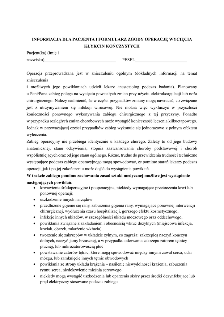 INFORMACJA DLA PACJENTA I FORMULARZ ZGODY OPERACJĘ WYCIĘCIA KŁYKCIN KOŃCZYSTYCH Pacjent(ka) (imię i nazwisko)_________________________________ PESEL________________________ Operacja przeprowadzana jest w znieczuleniu ogólnym (dokładnych informacji na temat znieczulenia i możliwych jego powikłaniach udzieli lekarz anestezjolog podczas badania). Planowany u Pani/Pana zabieg polega na wycięciu powstałych zmian przy użyciu elektrokoagulacji lub noża chirurgicznego. Należy nadmienić, że w części przypadków zmiany mogą nawracać, co związane jest z utrzymywaniem się infekcji wirusowej. Nie można więc wykluczyć w przyszłości konieczności ponownego wykonywania zabiegu chirurgicznego z tej przyczyny. Ponadto w przypadku rozległych zmian chorobowych może wystąpić konieczność leczenia kilkuetapowego. Jednak w przeważającej części przypadków zabieg wykonuje się jednorazowo z pełnym efektem wyleczenia. Zabieg operacyjny nie przebiega identycznie u każdego chorego. Zależy to od jego budowy anatomicznej, stanu odżywienia, stopnia zaawansowania choroby podstawowej i chorób współistniejących oraz od jego stanu ogólnego. Różne, trudne do przewidzenia trudności techniczne występujące podczas zabiegu operacyjnego mogą spowodować, że pomimo starań lekarzy podczas operacji, jak i po jej zakończeniu może dojść do wystąpienia powikłań. W trakcie zabiegu pomimo zachowania zasad sztuki medycznej możliwe jest wystąpienie następujących powikłań: krwawienia śródoperacyjne i pooperacyjne, niekiedy wymagające przetoczenia krwi lub ponownej operacji; uszkodzenie innych narządów przedłużone gojenie się rany, zaburzenia gojenia rany, wymagające ponownej interwencji chirurgicznej, wydłużenia czasu hospitalizacji, gorszego efektu kosmetycznego; infekcje innych układów, w szczególności układu moczowego oraz oddechowego; powikłania związane z zakładaniem i obecnością wkłuć dożylnych (miejscowa infekcja, krwiak, obrzęk, zakażenie wkłucia) tworzenie się zakrzepów w układzie żylnym, co zagraża: zakrzepicą naczyń kończyn dolnych, naczyń jamy brzusznej, a w przypadku oderwania zakrzepu zatorem tętnicy płucnej, lub mikrozatorowością płuc powstawanie zatorów tętnic, które mogą spowodować między innymi zawał serca, udar mózgu, lub zamknięcie innych tętnic obwodowych powikłania ze strony układu krążenia – nasilenie niewydolności krążenia, zaburzenia rytmu serca, niedokrwienie mięśnia sercowego niekiedy mogą wystąpić uszkodzenia lub oparzenia skóry przez środki dezynfekujące lub prąd elektryczny stosowane podczas zabiegu alergie na leki stosowane w okresie okołooperacyjnym – szczególnie leki stosowane podczas znieczulenia, antybiotyki oraz środki przeciwbólowe duże i zniekształcające blizny, które mogą powstawać w przypadku skłonności osobniczych lub powikłań w procesie gojenia zakażenie wirusem zapalenia wątroby typu B i C (tzw. żółtaczki zakaźnej) lub wirusem HIV uszkodzenia gałązek nerwów skórnych, powodujące czasowe lub stałe zaburzenia czucia okolicy blizny pooperacyjnej Zgodnie z Ustawą o zawodach lekarza i lekarza dentysty z 5.12.1996 r., (tj. DzU 2008 r., nr 136, poz. 857), lekarz ma obowiązek poinformować pacjenta o dających się przewidzieć następstwach i powikłaniach planowanych czynności medycznych. W związku z powyższym oświadczam, że wystąpienie negatywnych następstw i powikłań, których występowanie jest incydentalne i których nie da się przewidzieć w świetle aktualnej wiedzy medycznej nie będzie z mojej strony przedmiotem roszczeń z tytułu niewłaściwego wykonania badania. W razie jakichkolwiek wątpliwości prosimy o pytania. Lekarz postara się rozwiać Pani/Pana wszystkie wątpliwości. Po zapoznaniu się z powyższymi informacjami oraz po rozmowie z lekarzem wyrażam zgodę na przeprowadzenie proponowanej operacji. Oświadczam, że zostałem/am poinformowany/a w sposób wyczerpujący i niebudzący moich wątpliwości o celu, rodzaju i sposobie przeprowadzenia zabiegu oraz wszelkich możliwych do przewidzenia wiążących się z nim ryzykach, w tym ryzykach rzadko występujących, innych możliwych metodach leczenia, jak również o efekcie, jakiego mogę się spodziewać, jeżeli zabieg przebiegać będzie bez zakłóceń. Oświadczam, że udzieliłem/am pełnych i prawdziwych odpowiedzi na pytania, które lekarz zadawał mi w trakcie wywiadu lekarskiego, nie zataiłem/am żadnych istotnych informacji o moim stanie zdrowia, w tym informacji o chorobach przewlekłych, przebiegu dotychczasowego leczenia i przyjmowanych lekach. Stwierdzam, że uzyskałem/am wyczerpujące i zrozumiałe dla mnie odpowiedzi na wszystkie zadane pytania. Zapoznałem/am się i zrozumiałem/am informacje zawarte w niniejszej zgodzie. Oświadczam, że jestem wystarczająco poinformowana/ny. Rozumiem ryzyko związane z tym zabiegiem i zgadzam się na jego wykonanie. Jednocześnie wyrażam zgodę na ewentualną zmianę pierwotnie ustalonego zakresu zabiegu operacyjnego polegającą na jego zmniejszeniu lub rozszerzeniu, jeśli będzie to uzasadnione wystąpieniem nieprzewidzianych okoliczności lub koniecznością dostosowania jego zakresu do stwierdzonych śródoperacyjnie zmian chorobowych. W razie wystąpienia podczas operacji powikłań wyrażam zgodę na przetransporowanie mnie do placówki państwowej opieki zdrowotnej w celu dalszego leczenia. Warszawa, ___________, __________ Data i godzina ________________________ podpis Lekarza ________________________ podpis Pacjenta