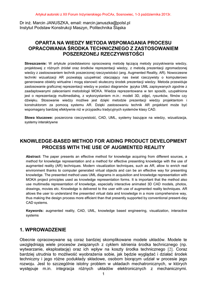 Artykuł autorski z XII Forum Inżynierskiego ProCAx, Sosnowiec, 1-3 października 2013r. Dr inż. Marcin JANUSZKA, email: [email protected] Instytut Podstaw Konstrukcji Maszyn, Politechnika Śląska OPARTA NA WIEDZY METODA WSPOMAGANIA PROCESU OPRACOWANIA ŚRODKA TECHNICZNEGO Z ZASTOSOWANIEM POSZERZONEJ RZECZYWISTOŚCI Streszczenie: W artykule przedstawiono opracowaną metodę łączącą metody pozyskiwania wiedzy, projektowej z różnych źródeł oraz środków reprezentacji wiedzy, z metodą prezentacji zgromadzonej wiedzy z zastosowaniem technik poszerzonej rzeczywistości (ang. Augmented Reality, AR). Nowoczesne techniki wizualizacji AR pozwalają uzupełniać otaczający nas świat rzeczywisty o komputerowo generowane obiekty wirtualne i mogą stanowić skuteczny środek prezentacji wiedzy. Metoda przewiduje zastosowanie graficznej reprezentacji wiedzy w postaci diagramów języka UML zapisywanych zgodnie z zaadaptowanymi zaleceniami metodologii MOKA. Wiedza reprezentowana w ten sposób, uzupełniona jest o reprezentację multimedialną, z wykorzystaniem m.in.: modeli 3D, zdjęć, rysunków, filmów czy dźwięku. Stosowanie wiedzy możliwe jest dzięki metodzie prezentacji wiedzy projektantom i konstruktorom za pomocą systemu AR. Dzięki zastosowaniu technik AR projektant może być wspomagany bardziej efektywnie niż w przypadku tradycyjnych systemów klasy CAD. Słowa kluczowe: poszerzona rzeczywistość, CAD, UML, systemy bazujące na wiedzy, wizualizacja, systemy interaktywne KNOWLEDGE-BASED METHOD FOR AIDING PRODUCT DEVELOPMENT PROCESS WITH THE USE OF AUGMENTED REALITY Abstract: The paper presents an effective method for knowledge acquiring from different sources, a method for knowledge representation and a method for effective presenting knowledge with the use of augmented reality (AR) techniques. Modern visualization techniques, such as AR, allow to enrich real environment thanks to computer generated virtual objects and can be an effective way for presenting knowledge. The presented method uses UML diagrams in acquisition and knowledge representation with MOKA project principles used as knowledge representation forms. It is important that the method also use multimedia representation of knowledge, especially interactive animated 3D CAD models, photos, drawings, movies etc. Knowledge is delivered to the user with use of augmented reality techniques. AR allows the user to understand the presented virtual data and knowledge in a more comprehensive way, thus making the design process more efficient than that presently supported by conventional present-day CAD systems. Keywords: augmented reality, CAD, UML, knowledge based engineering, visualization, interactive systems 1. WPROWADZENIE Obecnie opracowywane są coraz bardziej skomplikowane modele układów. Modele te uwzględniają wiele procesów związanych z cyklem istnienia środka technicznego (np. wytwarzanie, eksploatację) oraz ich wpływ na koszty środka technicznego [2]. Coraz bardziej utrudnia to możliwość wyobrażenia sobie, jak będzie wyglądać i działać środek techniczny i jego różne podukłady składowe, osobom biorącym udział w procesie jego rozwoju. Jest to szczególnie istotny problem w układach mechatronicznych, w których występuje m.in. integracja różnych układów elektronicznych z mechanicznymi. 1 Artykuł autorski z XII Forum Inżynierskiego ProCAx, Sosnowiec, 1-3 października 2013r. Zrozumienie sposobu sterowania układami mechanicznymi z zastosowaniem układów elektronicznych jest często skomplikowane. Odpowiednia wizualizacja wyglądu i działania środka technicznego w procesie jego opracowania jest konieczna również ze względu na nowe procesy, tj. szybkie opracowanie środków technicznych, które mają na celu skrócenie okresu pomiędzy projektowaniem i konstruowaniem środka technicznego, a jego sprzedażą. Stosując odpowiednie systemy komputerowego wspomagania bazujące na nowoczesnych technikach wizualizacji projektant może „przeprowadzać ocenę i analizę modelu bazując wyłącznie na jego reprezentacji cyfrowej” [6]. Odpowiednia wizualizacja środka technicznego w postaci cyfrowej makiety (ang. Digital Mock-Up, DMU), jak i skuteczne dostarczenie wiedzy niezbędnej do dokonania oceny i podjęcia prawidłowych decyzji przez projektantów i konstruktorów podczas opracowania środka technicznego są więc zagadnieniami bardzo istotnymi. Zastosowanie narzędzi komputerowych pozwala na zmniejszenie kosztów wytwarzania, skrócenie czasu przygotowania środka technicznego do produkcji i polepszenie jego jakości. Szacuje się, że 80 - 90% kosztów całego cyklu istnienia środka technicznego (ang. Product Lifecycle) determinowane jest już podczas fazy projektowania [6]. Do narzędzi i środków, które pozwalają już we wczesnych fazach opracowania środka technicznego na skuteczne podejmowanie decyzji wpływających w poważny sposób na proces jego wytwarzania (w tym montażu), czas wprowadzania środka technicznego na rynek, jakość środka technicznego oraz koszty produkcji, a co za tym idzie również na sukces środka technicznego na rynku należą techniki poszerzonej rzeczywistości (ang. Augmented Reality, AR). W większości obecnie prowadzonych badań w zakresie zastosowania technik AR w procesach opracowania środków technicznych autorzy nie podejmują problemu pozyskiwania i formalnej reprezentacji wiedzy, która może być stosowana do wspomagania użytkowników za pomocą opracowywanych systemów AR. W opracowywanych i stosowanych systemach korzysta się w głównej mierze z nieformalnej reprezentacji multimedialnej. Zasoby wiedzy pozyskiwane i przedstawiane są w takim przypadku głównie w postaci obiektów trójwymiarowych. Stosowanie wyłącznie takiej formy reprezentacji wiedzy jest niewystarczające. Ponadto przetwarzanie tak reprezentowanej wiedzy przez systemy bazujące na wiedzy jest niezwykle trudne, a czasem wręcz niemożliwe. Problem