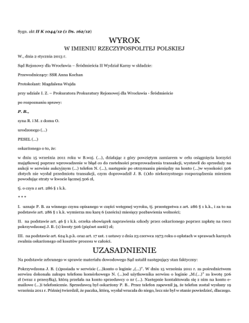 Sygn. akt II K 1044/12 (1 Ds. 162/12) WYROK W IMIENIU RZECZYPOSPOLITEJ POLSKIEJ W., dnia 2 stycznia 2013 r. Sąd Rejonowy dla Wrocławia – Śródmieścia II Wydział Karny w składzie: Przewodniczący: SSR Anna Kochan Protokolant: Magdalena Wujda przy udziale I. Z. – Prokuratora Prokuratury Rejonowej dla Wrocławia - Śródmieście po rozpoznaniu sprawy: P. B., syna R. i M. z domu O. urodzonego (...) PESEL (...) oskarżonego o to, że: w dniu 15 września 2011 roku w B.woj. (...), działając z góry powziętym zamiarem w celu osiągnięcia korzyści majątkowej poprzez wprowadzenie w błąd co do rzetelności przeprowadzenia transakcji, wystawił do sprzedaży na aukcji w serwisie aukcyjnym (...) telefon N. (...), następnie po otrzymaniu pieniędzy na konto (...)w wysokości 506 złotych nie wysłał przedmiotu transakcji, czym doprowadził J. B. (1)do niekorzystnego rozporządzenia mieniem powodując straty w kwocie łącznej 506 zł, tj. o czyn z art. 286 § 1 k.k. *** I. uznaje P. B. za winnego czynu opisanego w części wstępnej wyroku, tj. przestępstwa z art. 286 § 1 k.k., i za to na podstawie art. 286 § 1 k.k. wymierza mu karę 6 (sześciu) miesięcy pozbawienia wolności; II. na podstawie art. 46 § 1 k.k. orzeka obowiązek naprawienia szkody przez oskarżonego poprzez zapłatę na rzecz pokrzywdzonej J. B. (1) kwoty 506 (pięćset sześć) zł; III. na podstawie art. 624 k.p.k. oraz art. 17 ust. 1 ustawy z dnia 23 czerwca 1973 roku o opłatach w sprawach karnych zwalnia oskarżonego od kosztów procesu w całości. UZASADNIENIE Na podstawie zebranego w sprawie materiału dowodowego Sąd ustalił następujący stan faktyczny: Pokrzywdzona J. B. (1)posiada w serwisie (...)konto o loginie „(...)”. W dniu 15 września 2011 r. za pośrednictwem serwisu dokonała zakupu telefonu komórkowego N. (...)od użytkownika serwisu o loginie „M.(...)” za kwotę 506 zł (wraz z przesyłką), którą przelała na konto sprzedawcy o nr (...). Następnie kontaktowała się z nim na konto emailowe (...)i telefonicznie. Sprzedawcą był oskarżony P. B.. Przez telefon zapewnił ją, że telefon został wysłany 19 września 2011 r. Później twierdził, że paczka, którą, wysłał wracała do niego, lecz nie był w stanie powiedzieć, dlaczego. Pokrzywdzona ostatecznie nie otrzymała paczki, a w rozmowie z listonoszem ustaliła, że żadna paczka nie była do niej adresowana. Gdy sms-em dostała od oskarżonego numer nadania, na poczcie dowiedziała, się, że taki numer jest błędny. Zawiadomienie o przestępstwie złożyła niemal dwa miesiące od kupna telefonu - 10 listopada 2011 r. Dane oskarżonego w serwisie widnieją na serwisie (...) pod wieloma nickami. Dowód: Częściowo wyjaśnienia oskarżonego – k. 63-66, 123-124 Zeznania świadka R. B. – k. 47, 124Zeznania świadka J. B. - k. 1, 71 Zeznania świadka K. O. – k. 59 Karta płatności w serwisie internetowym – k. 5 Informacje o użytkowniku serwisu – k. 11-20 Informacja z wp.pl – k. 33-34 P. B. (ur. (...)) posiada wykształcenie średnie, na wolności pracował jako sanitariusz-opiekun. Nie ma dzieci, nie jest żonaty. Nie był leczony psychiatrycznie, neurologicznie lub odwykowo. Oskarżony był pięciokrotnie karany. Wyrokiem Sądu Rejonowego dla Wrocławia – Fabrycznej z dnia 18 lutego 2002 r. za czyn z art. 278 § 1 k.k. na karę grzywny. Wyrokiem Sądu Rejonowego dla Wrocławia - Śródmieścia z dnia 13 maja 2004 r. za czyn z art. 286 § 3 k.k. na karę grzywny. Wyrokiem Sądu Rejonowego dla Łodzi -Widzewa z dnia 24 stycznia 2008 r. za czyn z art. 286 § 1 k.k. na karę pozbawienia wolności z warunkowym zawieszeniem na okres 4 lat próby. Wyrokiem Sądu Rejonowego w Pruszkowie z dnia 6 maja 2009 r. za czyn z art. 284 § 2 k.k. na karę ograniczenia wolności. Wyrokiem Sądu Rejonowego dla Wrocławia – Fabrycznej z dnia 12 października 2009 r. za czyn z art. 286 § 1 k.k. na karę pozbawienia wolności z warunkowym zawieszeniem na okres 4 lat próby. Obecnie oskarżony odbywa karę pozbawienia wolności zarządzoną mu do wykonania. Dowód: Częściowo wyjaśnienia oskarżonego – k. 63-66, 123-124 Karta karna – k. 74 Odpisy wyroków – k. 78-80 W postępowaniu przygotowawczym oskarżony nie przyznał się do czynu i złożył wyjaśnienia. Potwierdził, że J. B. (1)kupiła od niego telefon N. (...)za kwotę 506 zł. Jak podał, było to w okresie wakacyjnym. Oskarżony wysłała inny model, a świadek go odesłała po 2-3 tygodniach. Oskarżony wysłał właściwy model i paczka do niego wróciła. Umówił się z pokrzywdzona i jej mężem, że jak będzie miał (...) to im wyśle, a jak nie – zwróci, pieniądze. Był z nimi w stałym kontakcie e-mailowym i telefonicznym. W grudniu miał oddać pieniądze, ale się to przeciągnęło do stycznia i wtedy został zatrzymany. Nie oddawał wcześniej pieniędzy, bo pokrzywdzonej zależało na telefonie i skłonna była czekać. Gdy zamieszczał ogłoszenie na portalu, nie miał N. (...), lecz (...). Ogłoszenie przygotowywał pracownik, którego danych nie chciała podawać. Jak podał, gdyby nie trafił do ZK, na pewno oddałby pieniądze pokrzywdzonej. Wyjaśnienia te mają widoczne od razu luki. Po pierwsze – terminy: nie jest prawdą, że do transakcji doszło w okresie wakacyjnym, w żadnym bowiem razie 15 września nie jest okresem wakacji. Nie jest prawdą, że pokrzywdzona po perturbacjach związanych z rzekomą wysyłką skłonna była czekać 3 miesiące, skoro w listopadzie złożyła zawiadomienie o przestępstwie. Po drugie, skoro oskarżony zamieszczając ogłoszenie nie miał telefonu N. (...), to jakże mógł ten właśnie przedmiot wysłać w drugiej paczce, która następnie do niego wróciła. Dalej, jeśli by wróciła, dlaczego nie wysłał jej ponownie, skoro był, jak twierdzi, w stałym kontakcie telefonicznym i mailowym z pokrzywdzona i jej mężem. W takim przypadku jest oczywiste, że pokrzywdzona nie musiał