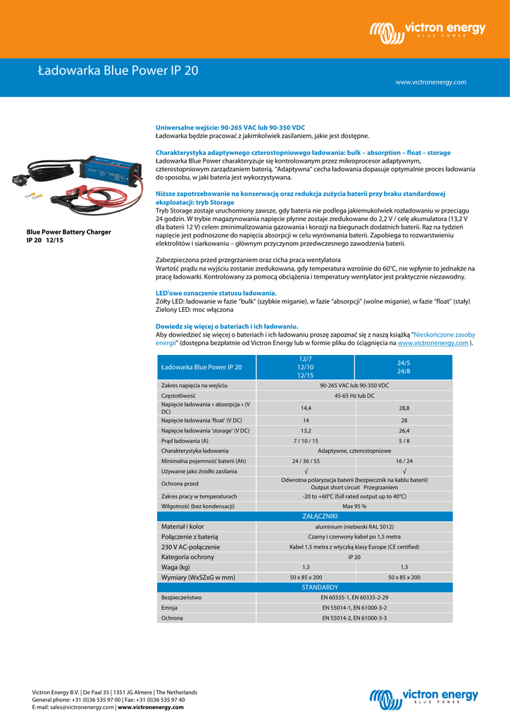 Ładowarka Blue Power IP 20 www.victronenergy.com Uniwersalne wejście: 90-265 VAC lub 90-350 VDC Ładowarka będzie pracować z jakimkolwiek zasilaniem, jakie jest dostępne. Charakterystyka adaptywnego czterostopniowego ładowania: bulk – absorption – float – storage Ładowarka Blue Power charakteryzuje się kontrolowanym przez mikroprocesor adaptywnym, czterostopniowym zarządzaniem baterią. “Adaptywna” cecha ładowania dopasuje optymalnie proces ładowania do sposobu, w jaki bateria jest wykorzystywana. Blue Power Battery Charger IP 20 12/15 Niższe zapotrzebowanie na konserwację oraz redukcja zużycia baterii przy braku standardowej eksploatacji: tryb Storage Tryb Storage zostaje uruchomiony zawsze, gdy bateria nie podlega jakiemukolwiek rozładowaniu w przeciągu 24 godzin. W trybie magazynowania napięcie płynne zostaje zredukowane do 2,2 V / celę akumulatora (13,2 V dla baterii 12 V) celem zminimalizowania gazowania i korozji na biegunach dodatnich baterii. Raz na tydzień napięcie jest podnoszone do napięcia absorpcji w celu wyrównania baterii. Zapobiega to rozwarstwieniu elektrolitów i siarkowaniu – głównym przyczynom przedwczesnego zawodzenia baterii. Zabezpieczona przed przegrzaniem oraz cicha praca wentylatora Wartość prądu na wyjściu zostanie zredukowana, gdy temperatura wzrośnie do 60°C, nie wpłynie to jednakże na pracę ładowarki. Kontrolowany za pomocą obciążenia i temperatury wentylator jest praktycznie niezawodny. LED'owe oznaczenie statusu ładowania. Żółty LED: ładowanie w fazie “bulk” (szybkie miganie), w fazie “absorpcji” (wolne miganie), w fazie “float” (stały) Zielony LED: moc włączona Dowiedz się więcej o bateriach i ich ładowaniu. Aby dowiedzieć się więcej o bateriach i ich ładowaniu proszę zapoznać się z naszą książką “Nieskończone zasoby energii” (dostępna bezpłatnie od Victron Energy lub w formie pliku do ściągnięcia na www.victronenergy.com ). Ładowarka Blue Power IP 20 12/7 12/10 12/15 24/5 24/8 Zakres napięcia na wejściu 90-265 VAC lub 90-350 VDC Częstotliwość Napięcie ładowania « absorpcja » (V DC) Napięcie ładowania 'float' (V DC) 14,4 14 28 Napięcie ładowania 'storage' (V DC) 13,2 26,4 Prąd ładowania (A) 45-65 Hz lub DC 7 / 10 / 15 Charakterystyka ładowania Minimalna pojemność baterii (Ah) Używanie jako źródło zasilania Ochrona przed Zakres pracy w temperaturach 28,8 5/8 Adaptywne, czterostopniowe 24 / 36 / 55 16 / 24 √ √ Odwrotna polaryzacja baterii (bezpiecznik na kablu baterii) Output short circuit Przegrzaniem -20 to +60°C (full rated output up to 40°C) Wilgotność (bez kondensacji) Max 95 % ZAŁĄCZNIKI Materiał i kolor Połączenie z baterią 230 V AC-połączenie Kategoria ochrony Waga (kg) Wymiary (WxSZxG w mm) aluminium (niebieski RAL 5012) Czarny i czerwony kabel po 1,5 metra Kabel 1,5 metra z wtyczką klasy Europe (CE certified) IP 20 1,3 1,3 50 x 85 x 200 50 x 85 x 200 STANDARDY Bezpieczeństwo EN 60335-1, EN 60335-2-29 Emisja EN 55014-1, EN 61000-3-2 Ochrona EN 55014-2, EN 61000-3-3 Victron Energy B.V. | De Paal 35 | 1351 JG Almere | The Netherlands General phone: +31 (0)36 535 97 00 | Fax: +31 (0)36 535 97 40 E-mail: [email protected] | www.victronenergy.com