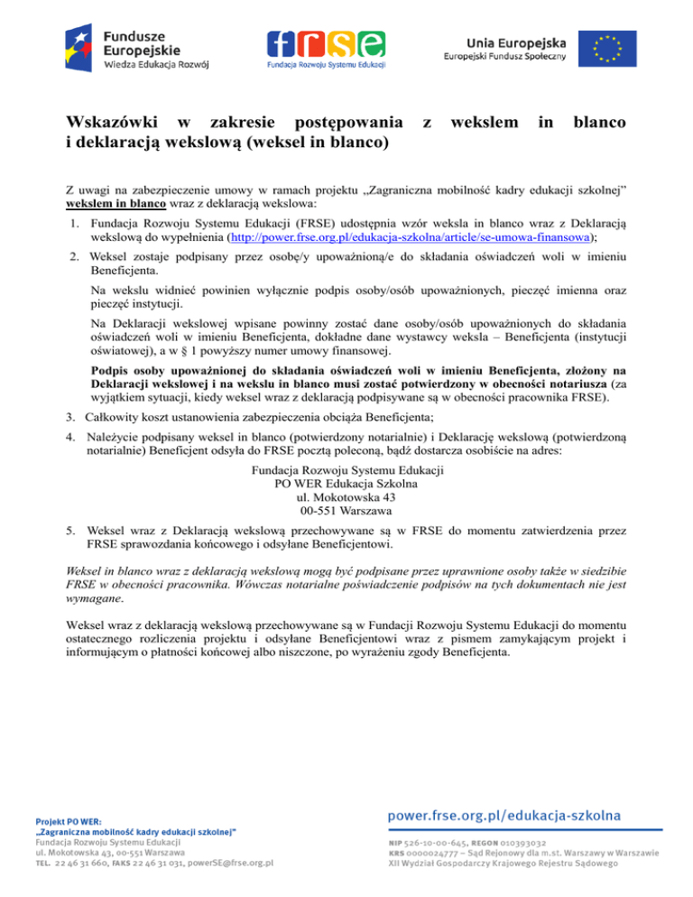 Wskazówki w zakresie postępowania i deklaracją wekslową (weksel in blanco) z wekslem in blanco Z uwagi na zabezpieczenie umowy w ramach projektu „Zagraniczna mobilność kadry edukacji szkolnej” wekslem in blanco wraz z deklaracją wekslowa: 1. Fundacja Rozwoju Systemu Edukacji (FRSE) udostępnia wzór weksla in blanco wraz z Deklaracją wekslową do wypełnienia (http://power.frse.org.pl/edukacja-szkolna/article/se-umowa-finansowa); 2. Weksel zostaje podpisany przez osobę/y upoważnioną/e do składania oświadczeń woli w imieniu Beneficjenta. Na wekslu widnieć powinien wyłącznie podpis osoby/osób upoważnionych, pieczęć imienna oraz pieczęć instytucji. Na Deklaracji wekslowej wpisane powinny zostać dane osoby/osób upoważnionych do składania oświadczeń woli w imieniu Beneficjenta, dokładne dane wystawcy weksla – Beneficjenta (instytucji oświatowej), a w § 1 powyższy numer umowy finansowej. Podpis osoby upoważnionej do składania oświadczeń woli w imieniu Beneficjenta, złożony na Deklaracji wekslowej i na wekslu in blanco musi zostać potwierdzony w obecności notariusza (za wyjątkiem sytuacji, kiedy weksel wraz z deklaracją podpisywane są w obecności pracownika FRSE). 3. Całkowity koszt ustanowienia zabezpieczenia obciąża Beneficjenta; 4. Należycie podpisany weksel in blanco (potwierdzony notarialnie) i Deklarację wekslową (potwierdzoną notarialnie) Beneficjent odsyła do FRSE pocztą poleconą, bądź dostarcza osobiście na adres: Fundacja Rozwoju Systemu Edukacji PO WER Edukacja Szkolna ul. Mokotowska 43 00-551 Warszawa 5. Weksel wraz z Deklaracją wekslową przechowywane są w FRSE do momentu zatwierdzenia przez FRSE sprawozdania końcowego i odsyłane Beneficjentowi. Weksel in blanco wraz z deklaracją wekslową mogą być podpisane przez uprawnione osoby także w siedzibie FRSE w obecności pracownika. Wówczas notarialne poświadczenie podpisów na tych dokumentach nie jest wymagane. Weksel wraz z deklaracją wekslową przechowywane są w Fundacji Rozwoju Systemu Edukacji do momentu ostatecznego rozliczenia projektu i odsyłane Beneficjentowi wraz z pismem zamykającym projekt i informującym o płatności końcowej albo niszczone, po wyrażeniu zgody Beneficjenta.