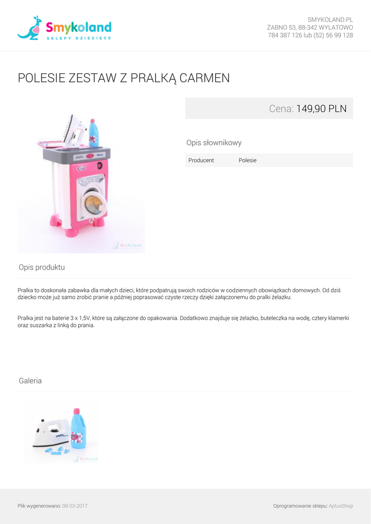 SMYKOLAND.PL ŻABNO 53, 88-342 WYLATOWO 784 387 126 lub (52) 56 99 128 POLESIE ZESTAW Z PRALKĄ CARMEN Cena: 149,90 PLN Opis słownikowy Producent Polesie Opis produktu Pralka to doskonała zabawka dla małych dzieci, które podpatrują swoich rodziców w codziennych obowiązkach domowych. Od dziś dziecko może już samo zrobić pranie a później poprasować czyste rzeczy dzięki załączonemu do pralki żelazku. Pralka jest na baterie 3 x 1,5V, które są załączone do opakowania. Dodatkowo znajduje się żelazko, buteleczka na wodę, cztery klamerki oraz suszarka z linką do prania. Galeria Plik wygenerowano: 08-03-2017 Powered by TCPDF (www.tcpdf.org) Oprogramowanie sklepu: AptusShop