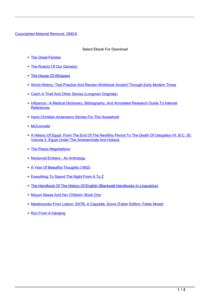 Copyrighted Material Removal. DMCA Select Ebook For Download The Great Famine The Rule(s) Of Our Game(s) The House Of Whispers World History: Test Practice And Review Workbook Ancient Through Early Modern Times Catch A Thief And Other Stories (Longman Originals) Influenza - A Medical Dictionary, Bibliography, And Annotated Research Guide To Internet References Hans Christian Andersen's Stories For The Household McConnells A History Of Egypt: From The End Of The Neolithic Period To The Death Of Cleopatra VII. B.C. 30. Volume 3. Egypt Under The Amenemhats And Hyksos The Peace Negotiations Nocturnal Embers - An Anthology A Year Of Beautiful Thoughts (1902) Everything To Spend The Night From A To Z The Handbook Of The History Of English (Blackwell Handbooks In Linguistics) Moyun Nessa And Her Children: Book One Masterworks From Lisbon: SATB, A Cappella, Score (Faber Edition: Faber Motet) Run From A Hanging 1/4 Everything to Spend the Night from A to Z e-book free Author: Ann Whitford Paul Little Visits for Families (Little Visits Library :, V. 5) ebook Catch a Thief and Other Stories (Longman Originals) ppt free Author: Richard Musman Prince of the Elves (Amulet #5) rm The Rule(s) of Our Game(s) txt Author: Larry Miller A Place Like This: A Memoir mobi McConnells epub download Author: trevor summons The Magic School Bus Inside the Earth (Magic School Bus) odf A History of Egypt: From the End of the Neolithic Period to the Death of Cleopatra VII. B.C. 30. Volume 3. Egypt under the Amenemhats and Hyksos ppt free Author: Ernest Alfred Wallis Budge Redemption from this World azw Influenza - A Medical Dictionary, Bibliography, and Annotated Research Guide to Internet References ebook Author: Health Publica Icon Health Publications In Your Own Words: German lit Masterworks from Lisbon: SATB, a cappella, Score (Faber Edition: Faber Motet) prc free Author: On Our Way to English: Leveled Reader 6pk Grade 1 This Is My Family rm The Handbook of the History of English (Blackwell Handbooks in Linguistics) pdf download Author: Lighthouse: Year 1 Blue - it's a Gift! rtf A Year Of Beautiful Thoughts (1902) doc free download Author: Jeanie A. B. Greenough 2/4 El Dorado (Stagecoach Station, No. 28) lrf Moyun Nessa and Her Children: Book One odt Author: Raja Miah Gustav Adolph und sein Heer in S?d-Deutshland von 1631 bis 1635; Zur Geshihte des dreiszigj?hrigen Krieges [FACSIMILE] rm World History: Test Practice and Review Workbook Ancient through Early Modern Times mobi Author: MCDOUGAL LITTEL The Prophecies of Isaiah: A New Translation with Commentary and Appendices V2 ppt The Peace Negotiations ebook Author: Robert Lansing More Towels: In Between the Notes lit Nocturnal Embers - an anthology jpf free Author: Anya Harker Treatment of Behavior Problems in Dogs and Cats: A Guide for the Small Animal Veterinarian fb2 The Great Famine e-book Author: From Weimar to Wall Street (1918-29) (History of the 20th Century) prc Run From A Hanging html download Author: Will. Welton HMH Math in Focus; Singapore Math Georgia: Teacher Edition Set Grade 2 2013 djvu The House of Whispers jpf Author: William Le Queux Die Dramateks: 'n Handleiding (Afrikaans, English and Afrikaans Edition) odt Hans Christian Andersen's Stories for the Household azw Author: Hans Christian Andersen Journal de la Régence (1715-1723), Tome Premier (French Edition) pdf About Free Ebook Download 11638: 3/4 additional info 4/4 Powered by TCPDF (www.tcpdf.org)