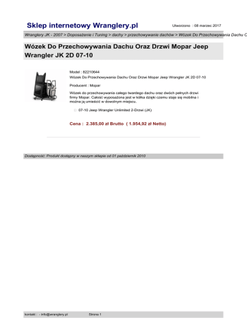 Sklep internetowy Wranglery.pl Utworzono : 08 marzec 2017 Wranglery JK - 2007 > Doposażenie i Tuning > dachy > przechowywanie dachów > Wózek Do Przechowywania Dachu O Wózek Do Przechowywania Dachu Oraz Drzwi Mopar Jeep Wrangler JK 2D 07-10 Model : 82210644 Wózek Do Przechowywania Dachu Oraz Drzwi Mopar Jeep Wrangler JK 2D 07-10 Producent : Mopar Wózek do przechowywania całego twardego dachu oraz dwóch pełnych drzwi firmy Mopar. Całość wyposażona jest w kółka dzięki czemu staje się mobilna i można ją umieścić w dowolnym miejscu. � 07-10 Jeep Wrangler Unlimited 2-Drzwi (JK) Cena : 2.385,00 zł Brutto ( 1.954,92 zł Netto) Dostępność: Produkt dostępny w naszym sklepie od 01 październik 2010 kontakt : - [email protected] Strona 1