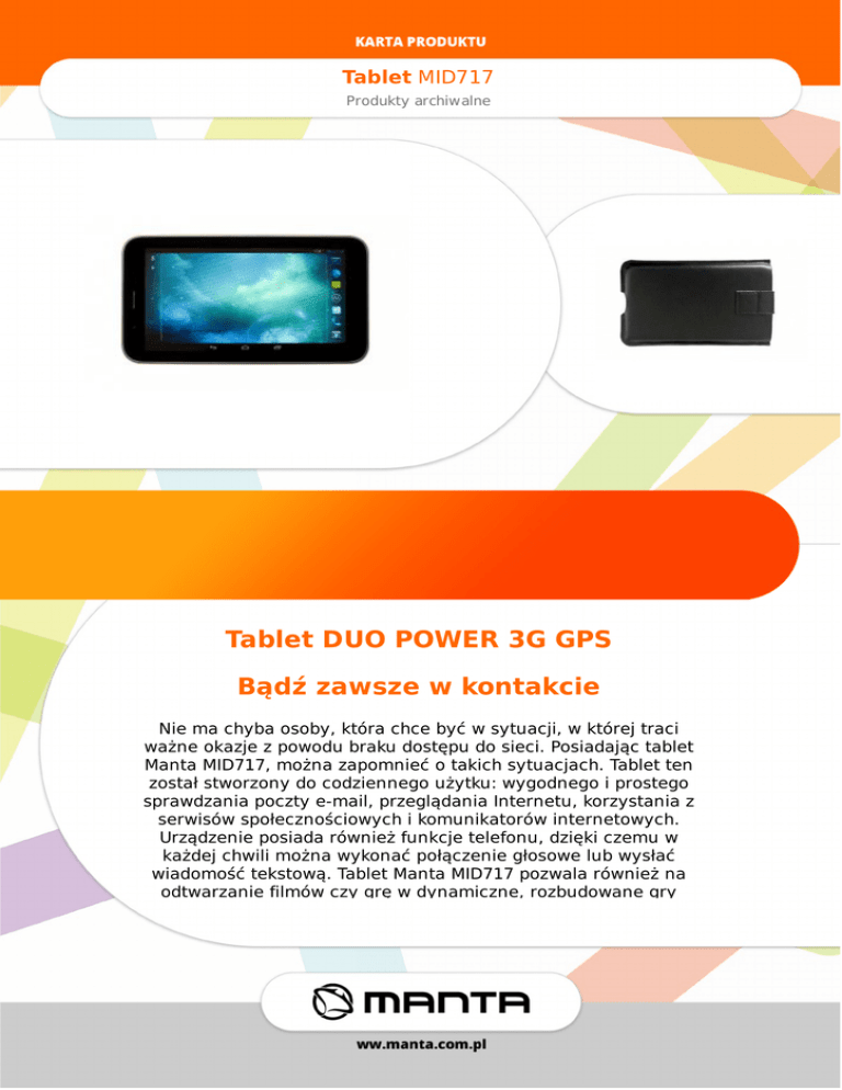 TabletMID717 Produktyarchiwalne TabletDUOPOWER3GGPS Bądźzawszewkontakcie Niemachybaosoby,którachcebyćwsytuacji,wktórejtraci ważneokazjezpowodubrakudostępudosieci.Posiadająctablet MantaMID717,możnazapomniećotakichsytuacjach.Tabletten zostałstworzonydocodziennegoużytku:wygodnegoiprostego sprawdzaniapocztye-mail,przeglądaniaInternetu,korzystaniaz serwisówspołecznościowychikomunikatorówinternetowych. Urządzenieposiadarównieżfunkcjetelefonu,dziękiczemuw każdejchwilimożnawykonaćpołączeniegłosowelubwysłać wiadomośćtekstową.TabletMantaMID717pozwalarównieżna odtwarzaniefilmówczygręwdynamiczne,rozbudowanegry TabletMID717 Produktyarchiwalne Specyfikacja Dziękiwydajnemudwurdzeniowymprocesorowi CortexA9MTK6572DualCoretaktowanemu zegarem1.2GHz,tabletpłynnieodtwarza wszystkieaplikacjestworzonepodsystem operacyjnyAndroid4.2.Tabletzachowujeszybkość istabilnośćdziałania,nawetprzykilkurównolegle otwartychprogramach,dzięki1GBpamięci operacyjnejRAM.Dziękitymparametrommożemy jednocześniepobieraćpocztę,sprawdzaćdrogęna mapieisłuchaćnaszegoulubionegozespołuwtle. Pięciopunktowymultitouchpozwalanaintuicyjne operowanieobiektaminaekranie.Prostymi gestamimożemypowiększaćizmniejszaćobrazy, atakżejeobracać.Urządzenieposiada wysokokontrastowyekranoprzekątnej7cali, wyświetlającyobrazwrozdzielczości1024x600. ŁącznośćzinternetempoprzezWi-Fioraz wbudowanymodem3GobsługującydwiekartySIM zapewniastałydostępdosieci.Tabletmoże zarównopełnićfunkcjętelefonu,dziękiczemu pozostajemywstałymkontakciezrodzinąi przyjaciółmi,jakirównieżurządzenia multimedialnego,mogącegosłużyćdopracylub rozrywki.Przechowywaniewszystkichpotrzebnych danychjestmożliwedziękiwbudowanej4GB szybkiejpamięciflash.Dodatkowo,dokupując kartypamięcimicroSD,lublokującdanena Mantaboxie–bezpłatnymwirtualnymdyskuw chmurze(ażdo5GB),możemyzwiększyć przestrzeńdyskowąnawetdo32GB. Przekątnaekranu 7” Rozdzielczość 1024x600 Wbudowanegłośniki 2 Wymiary(SxWxG) 191x108x9.7mm Waga 305g Systemoperacyjny Android4.2.2 Procesor DualCore Taktowanieprocesora 1,2GHz RAM 1GB FLASH 4GB Wi-Fi IEEE802.11B/G/N Obsługamodemów3GUSB Nie Wbudowanymodem3G Tak Dual-SIM Tak ObsługiwanepasmaGSM/WDCMA Tak Funkcjetelefoniczne Tak Bluetooth Tak GPS TAK Aparat 2–przód/tył Gniazdokartpamięci MicroSD(Max32GB) http://www.manta.com.pl/pl/mid717 EAN:5907377862109