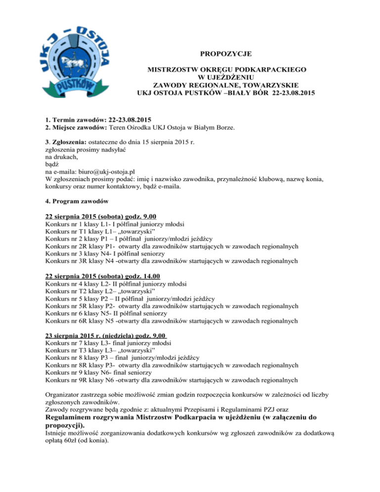 PROPOZYCJE MISTRZOSTW OKRĘGU PODKARPACKIEGO W UJEŻDŻENIU ZAWODY REGIONALNE, TOWARZYSKIE UKJ OSTOJA PUSTKÓW –BIAŁY BÓR 22-23.08.2015 1. Termin zawodów: 22-23.08.2015 2. Miejsce zawodów: Teren Ośrodka UKJ Ostoja w Białym Borze. 3. Zgłoszenia: ostateczne do dnia 15 sierpnia 2015 r. zgłoszenia prosimy nadsyłać na drukach, bądź na e-maila: [email protected] W zgłoszeniach prosimy podać: imię i nazwisko zawodnika, przynależność klubową, nazwę konia, konkursy oraz numer kontaktowy, bądź e-maila. 4. Program zawodów 22 sierpnia 2015 (sobota) godz. 9.00 Konkurs nr 1 klasy L1- I półfinał juniorzy młodsi Konkurs nr T1 klasy L1– „towarzyski” Konkurs nr 2 klasy P1 – I półfinał juniorzy/młodzi jeźdźcy Konkurs nr 2R klasy P1- otwarty dla zawodników startujących w zawodach regionalnych Konkurs nr 3 klasy N4- I półfinał seniorzy Konkurs nr 3R klasy N4 -otwarty dla zawodników startujących w zawodach regionalnych 22 sierpnia 2015 (sobota) godz. 14.00 Konkurs nr 4 klasy L2- II półfinał juniorzy młodsi Konkurs nr T2 klasy L2– „towarzyski” Konkurs nr 5 klasy P2 – II półfinał juniorzy/młodzi jeźdźcy Konkurs nr 5R klasy P2- otwarty dla zawodników startujących w zawodach regionalnych Konkurs nr 6 klasy N5- II półfinał seniorzy Konkurs nr 6R klasy N5 -otwarty dla zawodników startujących w zawodach regionalnych 23 sierpnia 2015 r. (niedziela) godz. 9,00 Konkurs nr 7 klasy L3- finał juniorzy młodsi Konkurs nr T3 klasy L3– „towarzyski” Konkurs nr 8 klasy P3 – finał juniorzy/młodzi jeźdźcy Konkurs nr 8R klasy P3- otwarty dla zawodników startujących w zawodach regionalnych Konkurs nr 9 klasy N6- finał seniorzy Konkurs nr 9R klasy N6 -otwarty dla zawodników startujących w zawodach regionalnych Organizator zastrzega sobie możliwość zmian godzin rozpoczęcia konkursów w zależności od liczby zgłoszonych zawodników. Zawody rozgrywane będą zgodnie z: aktualnymi Przepisami i Regulaminami PZJ oraz Regulaminem rozgrywania Mistrzostw Podkarpacia w ujeżdżeniu (w załączeniu do propozycji). Istnieje możliwość zorganizowania dodatkowych konkursów wg zgłoszeń zawodników za dodatkową opłatą 60zł (od konia). 5. Stajnie letnie: Boksy dla koni (20 szt.), przygotowane od dnia 21 sierpnia 2015 r. , od godz. 16,00 (rezerwacja wg kolejności zgłoszeń). Organizator zapewnia pierwszą słomę. Na terenie zawodów istnieje możliwość nabycia – słoma – 1 kostka 3 zł,/ siano 1 kostka 5 zł. Pasza , pojemniki, wiadra do pojenia we własnym zakresie. W przypadku wcześniejszego przyjazdu lub późniejszego wyjazdu opłata dodatkowa za boks wynosi 25 zł. dziennie. 6. OPŁATY: -250 zł /dwa dni startów z boksem - 200 zł/dwa dni startów bez boksu - 150 zł/ jeden dzień startów bez boksu Możliwość podłączenia do prądu – 50 zł za całe zawody. Wpłaty muszą być uregulowane na godzinę przed rozpoczęciem konkursu nr 1. W przypadku nieuregulowania opłat, do startu nie zostanie dopuszczona cała ekipa. - cisza nocna w stajni od godz. 22.00 – 6.00 - prosimy o przestrzeganie przepisów BHP i p. poż. 7. Zakwaterowanie: Zawodnicy, szefowie ekip, trenerzy, luzacy – noclegi na własny koszt. - pokoje gościnne dwuosobowe i trzyosobowe na miejscu. Cena 40 zł od osoby za dobę - Wyżywienie: We własnym zakresie. Usługi Cateringowe w Barze ( miejsc ok.50) na terenie zawodów. 8. Warunki techniczne: -zawody odbywać się będą na terenie otwartym - czworobok, wymiary: 60 x 20 [m]– podłoże piaszczyste - rozprężania, wymiary: 60 x 20 [m] – podłoże piaszczysto-trawiaste Czworobok otwarty dla zawodników w dniu 21.08.2015 w godz. 16.00-19.00 oraz 22.08.2015 r. od 7,00 -8,00. 9. Klasyfikacja ogólna: - Flots dla 25% zwycięskich koni każdego konkursu ZT i ZR, - dekoracja odbędzie się w dniu 23.08.2015 r. po zakończeniu wszystkich konkursów Do dekoracji Mistrzostw Podkarpacia wyjeżdżają wszystkie konie, które ukończyły Mistrzostwa. Organizator zapewnia dla nich flo. Przewidziane nagrody rzeczowe w konkursach mistrzowskich. 10. Zebranie techniczne: nie przewiduje się zebrania technicznego. Losowanie kolejności startów w Mistrzostwach odbędą się w dniu 22.08.2015 r. o godz. 7,30. Sprawdzanie dokumentów zawodników i koni – 22.08.2015 r. o godz. 7,30. 11. Organizator: UKJ „OSTOJA” 39-205 Pustków 230 Tel. kom. 0602588629 e-mail: [email protected] Uczestnictwo: Zawody Regionalne a) Zawodnicy i konie zarejestrowani w PZJ lub dowolnym WZJ. Zawodnicy muszą posiadać obowiązkowe ubezpieczenie NNW zawodników na czas trwania zawodów oraz aktualne badania lekarskie (lekarz sportowy). Zawodnicy poniżej 18 roku życia muszą posiadać zgodę rodziców. b) Konie muszą posiadać przynajmniej paszport hodowlany, z wpisanymi aktualnymi szczepieniami przeciwko grypie oraz udział w zawodach mogą brać konie czteroletnie i starsze. Zawody Towarzyskie a) Zawodnicy muszą posiadać obowiązkowe ubezpieczenie NNW zawodników na czas trwania zawodów oraz aktualne badania lekarskie (lekarz medycyny). Zawodnicy poniżej 18 roku życia muszą posiadać zgodę rodziców. b) Konie muszą posiadać przynajmniej paszport hodowlany, z wpisanymi aktualnymi szczepieniami przeciwko grypie oraz udział w zawodach mogą brać konie czteroletnie i starsze 12. Osoby oficjalne: Komisja sędziowska: Sędzia Główny – Katarzyna Bącal Sędzia WZJ – Małgorzata Mastalerczyk Sędzia Danuta Lusina Sekretarz –Danuta Zakrzewska Komisarz (w komisji ) zgodnie z załącznikiem Nr 1 do Przepisów o sędziach jeździeckich – wydanie 6.5 ze zmianami z dnia 21.03.2014. Lekarz zawodów – Jakub Durda Dyrektor zawodów – Ryszard Tęcza tel. 0602588629 13. Informacje ogólne: Odpowiedzialność: - Organizatorzy nie ponoszą odpowiedzialności z tytułu wypadków i zachorowań trenerów, zawodników, luzaków i koni, jak również w przypadku kradzieży, zniszczeń, pożarów i innych wydarzeń wynikłych w czasie tr