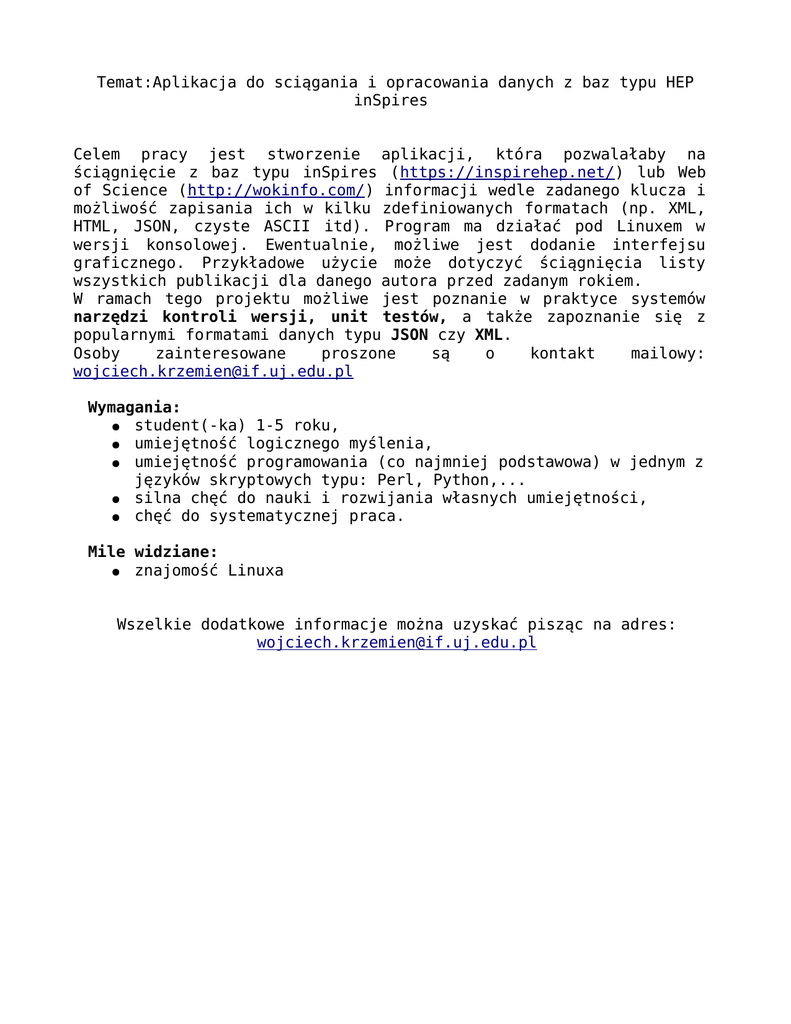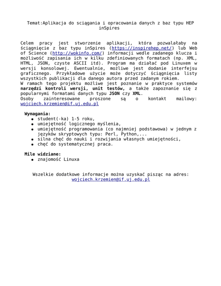 Temat:Aplikacja do sciągania i opracowania danych z baz typu HEP inSpires Celem pracy jest stworzenie aplikacji, która pozwalałaby na ściągnięcie z baz typu inSpires (https://inspirehep.net/) lub Web of Science (http://wokinfo.com/) informacji wedle zadanego klucza i możliwość zapisania ich w kilku zdefiniowanych formatach (np. XML, HTML, JSON, czyste ASCII itd). Program ma działać pod Linuxem w wersji konsolowej. Ewentualnie, możliwe jest dodanie interfejsu graficznego. Przykładowe użycie może dotyczyć ściągnięcia listy wszystkich publikacji dla danego autora przed zadanym rokiem. W ramach tego projektu możliwe jest poznanie w praktyce systemów narzędzi kontroli wersji, unit testów, a także zapoznanie się z popularnymi formatami danych typu JSON czy XML. Osoby zainteresowane proszone są o kontakt mailowy: [email protected] Wymagania: ● student(-ka) 1-5 roku, ● umiejętność logicznego myślenia, ● umiejętność programowania (co najmniej podstawowa) w jednym z języków skryptowych typu: Perl, Python,... ● silna chęć do nauki i rozwijania własnych umiejętności, ● chęć do systematycznej praca. Mile widziane: ● znajomość Linuxa Wszelkie dodatkowe informacje można uzyskać pisząc na adres: [email protected]