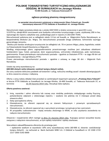 POLSKIE TOWARZYSTWO TURYSTYCZNO-KRAJOZNAWCZE ODDZIAŁ W SUWAŁKACH im.Jerzego Klimko 16-400 Suwałki, ul. Tadeusza Kościuszki 37 ogłasza przetarg pisemny nieograniczony na sprzedaż nieruchomości położonej w miejscowości Stary Folwark gm. Suwałki stanowiącej własność PTTK Oddziału w Suwałkach im. Jerzego Klimko Nieruchomość objęta sprzedażą składa się z udziału 848/10000 w działce oznaczonej nr geod.553 o pow. 3,5379 ha, obręb:0016 Leszczewek oraz budynku schroniska turystycznego o pow. użytkowej 290 m kw, wpisanego do rejestru zabytków woj. podlaskiego pod nr rejestru A-263 (KW 7544) Nieruchomość położona jest w odległości około 13 km od Suwałk, w Wigierskim Parku Narodowym, w bezpośredniej bliskości jez. Wigry. Do nieruchomości prowadzi droga asfaltowa. Schronisko wymaga generalnego remontu. Okolica jest bardzo atrakcyjna turystycznie (w odległości ok. 70 m jezioro Wigry, plaża, kąpielisko; widok na Pokamedulski Zespół Klasztorny w Wigrach). Według miejscowego planu zagospodarowania przestrzennego możliwa jest zabudowa obiektami hotelarskimi typu: hotel, pensjonat, dom wypoczynkowy, schronisko młodzieżowe, pole namiotowe, gastronomia. Prawo pierwokupu nieruchomości posiada – zgodnie ze Statutem PTTK – w ciągu 90 dni od powiadomienia – Zarząd Główny PTTK. Prawo pierwokupu nieruchomości posiada – zgodnie z ustawą, w ciągu 30 dni – Wigierski Park Narodowy. Ustala się cenę wywoławczą na: 600 000 złotych netto (słownie: sześćset tysięcy złotych netto), Do ceny zostanie doliczony podatek od towarów i usług, naliczony według zasad i stawek obowiązujących w dniu zawarcia umowy z nabywcą. Oferty z ceną należy składać (lub przesłać) w zamkniętych kopertach opisanych „Przetarg Stary Folwark” w biurze PTTK Oddziału w Suwałkach im Jerzego Klimko, 16-400 Suwałki, ul. Tadeusza Kościuszki 37, w terminie do 20 stycznia 2014 roku. Decyduje data wpływu. Oferta powinna zawierać: 1. Imię, nazwisko i adres oferenta lub nazwę oraz siedzibę podmiotu niebędącego osobą fizyczną, potwierdzone odpisem z właściwego rejestru – wydane nie później niż 3 miesiące przed datą otwarcia ofert. 2. Datę sporządzenia oferty. 3. Oświadczenie, że oferent zapoznał się ze stanem faktycznym i prawnym sprzedawanych nieruchomości. 4. Oświadczenie, że oferent zapoznał się z warunkami przetargu i przyjmuje je bez zastrzeżeń. 5. W przypadku cudzoziemców - kopię wniosku złożonego w MSW, w celu uzyskania zezwolenia na nabycie nieruchomości. Otwarcie i rozpatrzenie ofert nastąpi w dniu 21 stycznia 2014 roku. Kupujący ponosi wszystkie koszty związane z nabyciem nieruchomości, w tym opłaty notarialne i opłaty skarbowe. Warunkiem zakwalifikowania oferenta do przetargu jest: – wpłacenie wadium w wysokości 10% ceny wywoławczej netto (60 000 zł, słownie: sześćdziesiąt tysięcy złotych) - na rachunek w Bank Zachodni WBK S.A. 2 Oddział w Suwałkach nr 19 1500 1719 1217 1003 5192 0000 przy czym najpóźniej w dniu poprzedzającym otwarcie ofert pieniądze muszą faktycznie wpłynąć na podany rachunek. Wpłacone wadium podlega: – zaliczaniu na poczet ceny nabycia nieruchomości w przypadku wygrania przetargu, – przepadkowi w razie uchylenia się uczestnika, który wygrał przetarg od zawarcia umowy notarialnej, w terminie określonym przez organizatora przetargu, – przepadkowi w razie nie uzyskania zezwolenia MSW na zakup nieruchomości przez cudzoziemca w terminie ustawowym, – zwrotowi uczestnikom, którzy przetargu nie wygrają (wadium zwraca się niezwłocznie, jednak nie później niż przed upływem 3 dni od dnia: odwołania przetargu, zamknięcia przetargu, unieważnienia przetargu, zakończenia przetargu wynikiem negatywnym). Uczestnik przetargu, którego oferta zostanie przyjęta zobowiązany jest do dokonania pełnej wpłaty oferowanej w przetargu kwoty, nie później niż na dzień przed dniem podpisania notarialnej umowy o nabycie (pieniądze muszą wpłynąć na konto PTTK Oddział w Suwałkach im. J.Klimko). Niedopełnienie tego obowiązku uprawnia PTTK Oddział w Suwałkach im. J.Klimko do sprzedaży nieruchomości kolejnym oferentom. PTTK Oddział w Suwałkach im. J.Klimko zastrzega sobie prawo do unieważnienia przetargu bez wyboru oferty, bez podania przyczyn i bez ponoszenia jakichkolwiek skutków prawnych i finansowych tego unieważnienia. Dodatkowych informacji w sprawie przetargu oraz możliwości obejrzenia przeznaczonej do sprzedaży nieruchomości udzielają pracownicy biura Oddziału PTTK w Suwałkach im. J.Klimko ul. T. Kościuszki 37, tel. 87 566 59 61, 603 093 723, e-mail: [email protected].