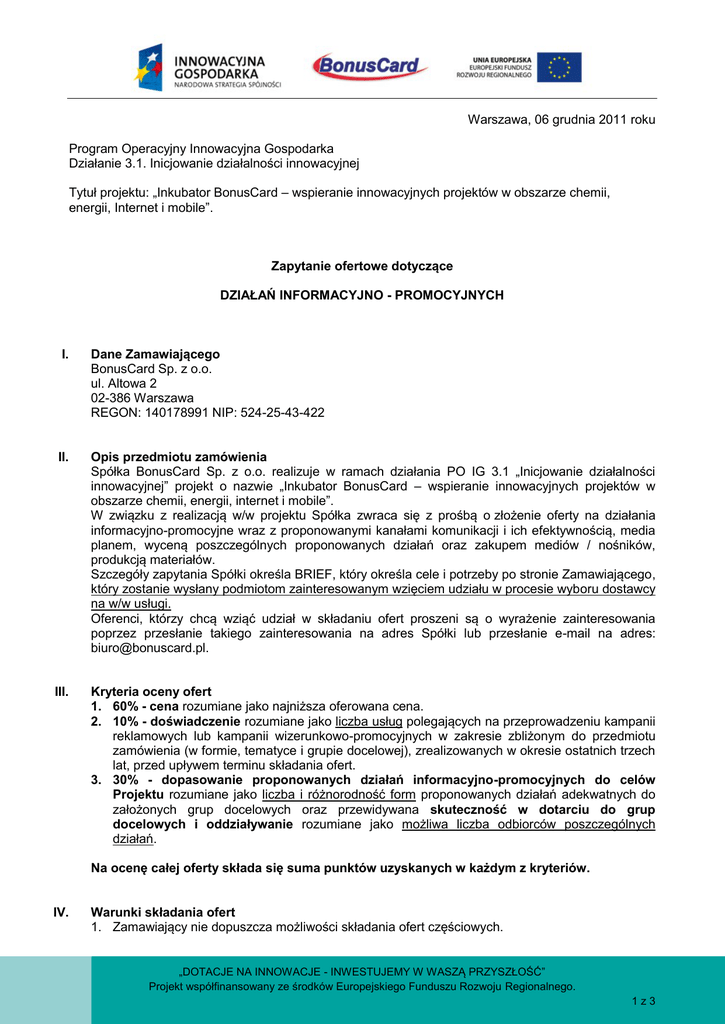 Warszawa, 06 grudnia 2011 roku Program Operacyjny Innowacyjna Gospodarka Działanie 3.1. Inicjowanie działalności innowacyjnej Tytuł projektu: „Inkubator BonusCard – wspieranie innowacyjnych projektów w obszarze chemii, energii, Internet i mobile”. Zapytanie ofertowe dotyczące DZIAŁAŃ INFORMACYJNO - PROMOCYJNYCH I. Dane Zamawiającego BonusCard Sp. z o.o. ul. Altowa 2 02-386 Warszawa REGON: 140178991 NIP: 524-25-43-422 II. Opis przedmiotu zamówienia Spółka BonusCard Sp. z o.o. realizuje w ramach działania PO IG 3.1 „Inicjowanie działalności innowacyjnej” projekt o nazwie „Inkubator BonusCard – wspieranie innowacyjnych projektów w obszarze chemii, energii, internet i mobile”. W związku z realizacją w/w projektu Spółka zwraca się z prośbą o złożenie oferty na działania informacyjno-promocyjne wraz z proponowanymi kanałami komunikacji i ich efektywnością, media planem, wyceną poszczególnych proponowanych działań oraz zakupem mediów / nośników, produkcją materiałów. Szczegóły zapytania Spółki określa BRIEF, który określa cele i potrzeby po stronie Zamawiającego, który zostanie wysłany podmiotom zainteresowanym wzięciem udziału w procesie wyboru dostawcy na w/w usługi. Oferenci, którzy chcą wziąć udział w składaniu ofert proszeni są o wyrażenie zainteresowania poprzez przesłanie takiego zainteresowania na adres Spółki lub przesłanie e-mail na adres: [email protected]. III. Kryteria oceny ofert 1. 60% - cena rozumiane jako najniższa oferowana cena. 2. 10% - doświadczenie rozumiane jako liczba usług polegających na przeprowadzeniu kampanii reklamowych lub kampanii wizerunkowo-promocyjnych w zakresie zbliżonym do przedmiotu zamówienia (w formie, tematyce i grupie docelowej), zrealizowanych w okresie ostatnich trzech lat, przed upływem terminu składania ofert. 3. 30% - dopasowanie proponowanych działań informacyjno-promocyjnych do celów Projektu rozumiane jako liczba i różnorodność form proponowanych działań adekwatnych do założonych grup docelowych oraz przewidywana skuteczność w dotarciu do grup docelowych i oddziaływanie rozumiane jako możliwa liczba odbiorców poszczególnych działań. Na ocenę całej oferty składa się suma punktów uzyskanych w każdym z kryteriów. IV. Warunki składania ofert 1. Zamawiający nie dopuszcza możliwości składania ofert częściowych. „DOTACJE NA INNOWACJE - INWESTUJEMY W WASZĄ PRZYSZŁOŚĆ” Projekt współfinansowany ze środków Europejskiego Funduszu Rozwoju Regionalnego. 1z3 2. Wszelkie parametry określone przez Spółkę, mają charakter orientacyjny i informacyjny. Spółka nie odpowiada za prawidłowe skonfigurowanie oferty. 3. Oferta powinna zawierać: a) Wycenę działań promocyjno-informacyjnych w postaci ciągłej obsługi (opłata miesięczna), zawierających następujące działania: Prowadzenie biura prasowego, Marketing szeptany, e-Public Relations, Działania z zakresu media relations, Trendsetting, Media społecznościowe (social media), Inne formy promocji – influencer strategy, polecenia, Obsługa 3 konferencji, Obsługa 8 spotkań informacyjnych, Obsługa 9 konkursów na uczelniach, Przygotowanie wszelkich treści wymaganych do działań (np. treści serwisu, baza wiedzy, itp.), Zaplanowanie i koordynacja kampanii mailingowej, Koordynacja działań PR w połączeniu z obraną strategią reklamową (prasa, Internet etc.), Koordynacja pracy innych podwykonawców, b) Wycenę poszczególnych wydarzeń specjalnych: Organizacja i przeprowadzenie 3 konferencji (w stawkach za jedno wydarzenie bez produkcji materiałów promocyjnych), Organizacja i przeprowadzenie 9 konkursu (w stawkach za jedno wydarzenie bez produkcji materiałów promocyjnych), Organizacja i przeprowadzenie 8 spotkań informacyjnych (w stawkach za jedno wydarzenie bez produkcji materiałów promocyjnych), Należy podać zakładaną liczbę uczestników wydarzeń. c) Wycenę druku i produkcji materiałów eksperckich (budżet miesięcznie) Materiały drukowane, publikacje własne Inkubatora związane z codzienna działalnością Inkubatora i realizacja procesu Preselekcji, Selekcji, Preinkubacji, Wejścia kapitałowe, d) Należy podać ilości i zakładane parametry materiałów. Wycenę projektowania i produkcji materiałów promocyjnych (budżet miesięcznie) m.in. ulotki, foldery reklamowe, plakaty, teczki, długopisy, smycze, prezentacje i informacje w formie notatek prasowych, płyty CD. Należy podać ilości i zakładane parametry materiałów. e) Wycenę prowadzenia kampanii reklamowo-informacyjnej w mediach: prasa i Internet (budżet miesięcznie) Reklamy, artykuły sponsorowane, wywiady w pismach branżowych i fachowych, mające na celu dotarcie do środowisk związanych z branżami Inkubatora BonusCard, tj. chemią, energią, Internetem i Mobile. Koordynacja ma dotyczyć realizacji działań informujących, że powstała możliwość realizacji pomysłów biznesowych w oparciu o Inkubator BonusCard, Należy podać ilości i zakładane parametry materiałów. f) Media Plan w podziale na Etapy i okresy miesięczne. Określający wybrane narzędzia i kanały komunikacji z uwzględnieniem jej natężenia i efektywności, Należy podać parametry efektywności takie jak ilość wyświetleń banerów, ilość odsłon strony internetowej, ilość użytkowników, konwersja, itp. g) Wykaz wykonanych, a w przypadku świadczeń okresowych lub ciągłych również wykonywanych, dostaw lub usług w zakresie niezbędnym do wykazania spełniania warunku wiedzy i doświadczenia w okresie ostatnich trzech lat przed upływem terminu składania ofert z podaniem ich wartości, przedmiotu, dat wykonania i odbiorców, oraz załączeniem „DOTACJE NA INNOWACJE - INWESTUJEMY W WASZĄ PRZYSZŁOŚĆ” Projekt współfinansowany ze środków Europejskiego Funduszu Rozwoju Regionalnego. 2z3 dokumentu potwierdzającego, że te dostawy lub usługi zostały wykonane lub są wykonywan