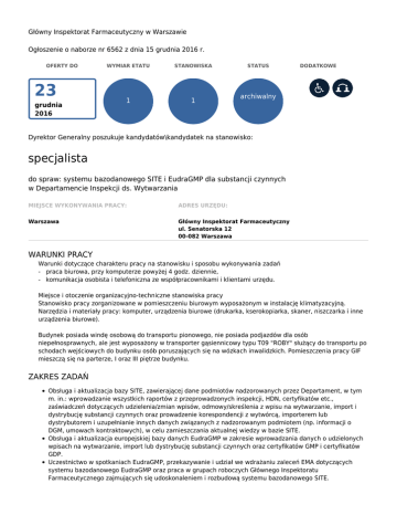 Główny Inspektorat Farmaceutyczny w Warszawie Ogłoszenie o naborze nr 6562 z dnia 15 grudnia 2016 r. OFERTY DO 23 grudnia 2016 WYMIAR ETATU STANOWISKA 1 1 STATUS DODATKOWE archiwalny Dyrektor Generalny poszukuje kandydatów\kandydatek na stanowisko: specjalista do spraw: systemu bazodanowego SITE i EudraGMP dla substancji czynnych w Departamencie Inspekcji ds. Wytwarzania MIEJSCE WYKONYWANIA PRACY: ADRES URZĘDU: Warszawa Główny Inspektorat Farmaceutyczny ul. Senatorska 12 00-082 Warszawa WARUNKI PRACY Warunki dotyczące charakteru pracy na stanowisku i sposobu wykonywania zadań - praca biurowa, przy komputerze powyżej 4 godz. dziennie, - komunikacja osobista i telefoniczna ze współpracownikami i klientami urzędu. Miejsce i otoczenie organizacyjno-techniczne stanowiska pracy Stanowisko pracy zorganizowane w pomieszczeniu biurowym wyposażonym w instalację klimatyzacyjną. Narzędzia i materiały pracy: komputer, urządzenia biurowe (drukarka, kserokopiarka, skaner, niszczarka i inne urządzenia biurowe). Budynek posiada windę osobową do transportu pionowego, nie posiada podjazdów dla osób niepełnosprawnych, ale jest wyposażony w transporter gąsiennicowy typu T09 "ROBY" służący do transportu po schodach wejściowych do budynku osób poruszających się na wózkach inwalidzkich. Pomieszczenia pracy GIF mieszczą się na parterze, I oraz III piętrze budynku. ZAKRES ZADAŃ Obsługa i aktualizacja bazy SITE, zawierającej dane podmiotów nadzorowanych przez Departament, w tym m. in.: wprowadzanie wszystkich raportów z przeprowadzonych inspekcji, HDN, certyfikatów etc., zaświadczeń dotyczących udzielenia/zmian wpisów, odmowy/skreślenia z wpisu na wytwarzanie, import i dystrybucję substancji czynnych oraz prowadzenie korespondencji z wytwórcą, importerem lub dystrybutorem i uzupełnianie innych danych związanych z nadzorowanym podmiotem (np. informacji o DGM, umowach kontraktowych), w celu zamieszczania aktualnej wiedzy w bazie SITE. Obsługa i aktualizacja europejskiej bazy danych EudraGMP w zakresie wprowadzania danych o udzielonych wpisach na wytwarzanie, import lub dystrybucję substancji czynnych oraz certyfikatów GMP i certyfikatów GDP. Uczestnictwo w spotkaniach EudraGMP, przekazywanie i udział we wdrażaniu zaleceń EMA dotyczących systemu bazodanowego EudraGMP oraz praca w grupach roboczych Głównego Inspektoratu Farmaceutycznego zajmujących się udoskonaleniem i rozbudową systemu bazodanowego SITE. Prowadzenie dokumentów wewnętrznych departamentu oraz dokumentacji otrzymanej od przedsiębiorców zajmujących się wytwarzaniem, importem lub dystrybucją substancji czynnych w tym m. in.: tworzenie teczek podmiotów zawierających pełną dokumentację związaną z prowadzoną działalnością tj. zaświadczeń, raportów i korespondencji poinspekcyjnej, decyzji; bieżąca aktualizacja przesłanej dokumentacji i korespondencji. Przygotowywanie na podpis GIF projektów certyfikatów: GMP- API (Good Manufacturing Practice for Active Pharmaceutical Ingredients), GDP-API (Good Distribution Practice for Active Pharmaceutical Ingredients),GMP Non-compliance. WYMAGANIA NIEZBĘDNE Wykształcenie: wyższe doświadczenie zawodowe: 1 rok i 6 miesięcy roku doświadczenia zawodowego w administracji lub 1 rok w obszarze związanym z przetwarzaniem danych w systemach informatycznych. dobra znajomość obsługi komputera (MS Excel, MS Word, bazy danych) komunikatywna znajomość j. angielskiego Posiadanie obywatelstwa polskiego Korzystanie z pełni praw publicznych Nieskazanie prawomocnym wyrokiem za umyślne przestępstwo lub umyślne przestępstwo skarbowe WYMAGANIA DODATKOWE znajomość przepisów ustawy Prawo farmaceutyczne komunikatywność dobra organizacja pracy odpowiedzialność przeszkolenie w zakresie przetwarzania danych DOKUMENTY I OŚWIADCZENIA NIEZBĘDNE Życiorys/CV i list motywacyjny Kopie dokumentów potwierdzających spełnienie wymagania niezbędnego w zakresie wykształcenia Kopie dokumentów potwierdzających spełnienie wymagania niezbędnego w zakresie doświadczenia zawodowego / stażu pracy Oświadczenie o posiadaniu obywatelstwa polskiego albo kopia dokumentu potwierdzającego posiadanie polskiego obywatelstwa Oświadczenie o wyrażeniu zgody na przetwarzanie danych osobowych do celów naboru Oświadczenie o korzystaniu z pełni praw publicznych Oświadczenie o nieskazaniu prawomocnym wyrokiem za umyślne przestępstwo lub umyślne przestępstwo skarbowe DOKUMENTY I OŚWIADCZENIA DODATKOWE kopia dokumentu potwierdzającego niepełnosprawność - w przypadku kandydatek/kandydatów, zamierzających skorzystać z pierwszeństwa w zatrudnieniu w przypadku, gdy znajdą się w gronie najlepszych kandydatek/kandydatów kopie dokumentów potwierdzających odbycie przeszkolenia w zakresie przetwarzania danych w systemach komputerowych TERMINY I MIEJSCE SKŁADANIA DOKUMENTÓW Dokumenty należy złożyć do: 23 grudnia 2016 r. Decyduje data: wpływu oferty do urzędu Miejsce składania dokumentów: Główny Inspektorat Farmaceutyczny ul. Senatorska 12 00-082 Warszawa z dopiskiem „Specjalista ds. Systemu Bazodanowego SITE i EudraGMP dla substancji czynnych w Departamencie Inspekcji ds. Wytwarzania” INNE INFORMACJE: W miesiącu poprzedzającym datę upublicznienia ogłoszenia wskaźnik zatrudnienia osób niepełnosprawnych w urzędzie, w rozumieniu przepisów o rehabilitacji zawodowej i społecznej oraz zatrudnianiu osób niepełnosprawnych, nie wynosi co najmniej 6%. Nasz urząd jest pracodawcą równych szans i wszystkie aplikacje są rozważane z równą uwagą bez względu na płeć, wiek, niepełnosprawność, rasę, narodowość, przekonania polityczne, przynależność związkową, pochodzenie etniczne, wyznanie, orientację seksualną czy też jakąkolwiek inną cechę prawnie chronioną. Oferty otrzymane po terminie nie będą rozpatrywane. W przypadku przesłania oferty drogą pocztową decyduje data wpływu do urzędu. Przed złoże