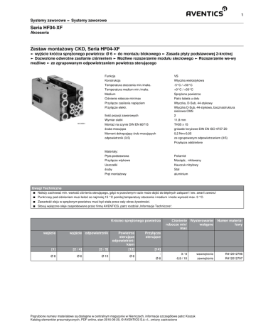 1 Systemy zaworowe ► Systemy zaworowe Seria HF04-XF Akcesoria Zestaw montażowy CKD, Seria HF04-XF ► wyjście króćca sprężonego powietrza: Ø 6 ► do montażu blokowego ► Zasada płyty podstawowej 2-krotnej ► Dozwolone odwrotne zasilanie ciśnieniem ► Możliwe rozszerzenie modułu sieciowego ► Rozszerzenie we-wy możliwe ► ze zgrupowanym odpowietrzaniem powietrza sterującego 00135551 Funkcja VS Konstrukcja Wtyczka wielostykowa Temperatura otoczenia min./maks. -5°C / +50°C Temperatura medium min./maks. +0°C / +50°C Medium Sprężone powietrze Ciśnienie robocze min/max Patrz tabela u dołu Przyłącze zasilania napięciem Wtyczka, D-Sub, 44-stykowy Przyłącze elektr. Wtyczka D-Sub, 44-stykowa, bocznastruktura sieciowa CMS Ilość pozycji zaworowych 2 Wymiar siatki 11,8 mm Montaż na szynie DIN EN 60715 TH35 x 15 śruba mocująca gniazdo krzyżowe DIN EN ISO 4757-Z0 Moment dokręcający śrub mocujących 0,2 Nm+0,05 odpowietrznik (3,5) ze zgrupowanym odpowietrzaniem (3/5) Przyłącza oddzielone Materiały: Płyta podstawowa Poliamid Przyłącze wtykowe Mosiądz, niklowany Uszczelki Kauczuk nitrylowy śruby Stal Pręt montażowy aluminium Uwagi Techniczne ■ Należy zachować min. wartość ciśnienia sterującego, gdyż w przeciwnym razie może dojść do błędnych załączeń i ew. awarii zaworu! ■ Punkt rosy pod ciśnieniem musi leżeć co najmniej 15 °C poniżej temperatury otoczenia i medium i może wynosić max. 3 °C. ■ Zawartość oleju w sprężonym powietrzu musi być stała przez cały okres żywotności. ■ Stosuj wyłączne oleje zaaprobowane przez firmę AVENTICS, patrz rozdział „Informacje Techniczne“. Króciec sprężonego powietrza wejście wyjście odpowietrznik [1] [2 / 4] [3 / 5] Powietrze sterujące odpowietrznikiem [12] Ø8 Ø6 Ø 10 Ø6 Przyłącze sterujące [14] Ciśnienie Wysterowanie robocze min/ wstępne max Numer materiałowy - 3/8 wewnętrznie R412012796 Ø6 -0,9 / 10 zewnętrznie R412012797 Pogrubione numery materiałowe są dostępne w centralnym magazynie w Niemczech, informacje szczegółowe patrz Koszyk Katalog elementów pneumatycznych, PDF online, stan 2016-09-20, © AVENTICS S.à r.l., zmiany zastrzeżone 2 Systemy zaworowe ► Systemy zaworowe Seria HF04-XF Akcesoria Numer materiałowy Napięcie robocze DC Tolerancja napięcia DC [V] R412012796 R412012797 24 V -10% / +10% 1 = złącze wtykowe Ø 8 mm 2 i 4 = złącze wtykowe Ø 6 mm lub przyłącze gwintowane M7 3 i 5 = złącze wtykowe Ø 10 mm R = wychwycone spaliny wysterowania, złącze wtykowe Ø 6 mm X = sterowanie zewnętrzne, złącze wtykowe Ø 6 mm, przyłącze X zamknięte przy sterowaniu własnym Pogrubione numery materiałowe są dostępne w centralnym magazynie w Niemczech, informacje szczegółowe patrz Koszyk Katalog elementów pneumatycznych, PDF online, stan 2016-09-20, © AVENTICS S.à r.l., zmiany zastrzeżone
