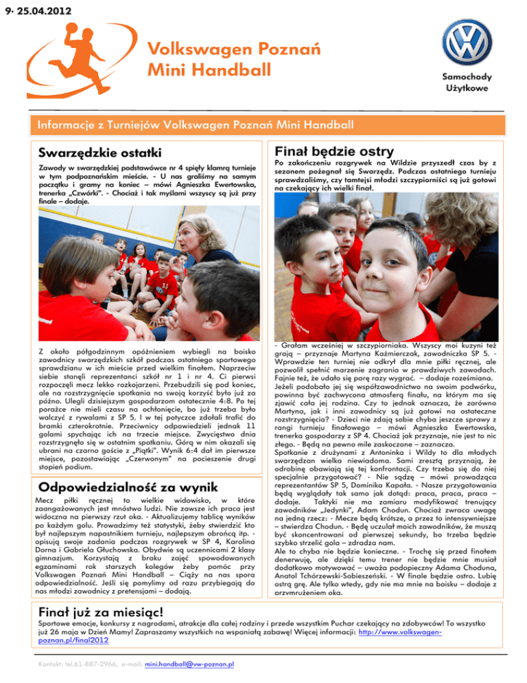 9· 25.04.2012 Informacje z Turniejów Volkswagen Poznań Mini Handball Swarzędzkie ostatki Zawody w swarzędzkiej podstawówce nr 4 spięły klamrą turnieje w tym podpoznańskim mieście. - U nas graliśmy na samym początku i gramy na koniec – mówi Agnieszka Ewertowska, trenerka „Czwórki”. - Chociaż i tak myślami wszyscy są już przy finale – dodaje. Z około półgodzinnym opóźnieniem wybiegli na boisko zawodnicy swarzędzkich szkół podczas ostatniego sportowego sprawdzianu w ich mieście przed wielkim finałem. Naprzeciw siebie stanęli reprezentanci szkół nr 1 i nr 4. Ci pierwsi rozpoczęli mecz lekko rozkojarzeni. Przebudzili się pod koniec, ale na rozstrzygnięcie spotkania na swoją korzyść było już za późno. Ulegli dzisiejszym gospodarzom ostatecznie 4:8. Po tej porażce nie mieli czasu na ochłonięcie, bo już trzeba było walczyć z rywalami z SP 5. I w tej potyczce zdołali trafić do bramki czterokrotnie. Przeciwnicy odpowiedzieli jednak 11 golami spychając ich na trzecie miejsce. Zwycięstwo dnia rozstrzygnęło się w ostatnim spotkaniu. Górą w nim okazali się ubrani na czarno goście z „Piątki”. Wynik 6:4 dał im pierwsze miejsce, pozostawiając „Czerwonym” na pocieszenie drugi stopień podium. Odpowiedzialność za wynik Mecz piłki ręcznej to wielkie widowisko, w które zaangażowanych jest mnóstwo ludzi. Nie zawsze ich praca jest widoczna na pierwszy rzut oka. - Aktualizujemy tablicę wyników po każdym golu. Prowadzimy też statystyki, żeby stwierdzić kto był najlepszym napastnikiem turnieju, najlepszym obrońcą itp. opisują swoje zadania podczas rozgrywek w SP 4, Karolina Dorna i Gabriela Głuchowska. Obydwie są uczennicami 2 klasy gimnazjum. Korzystają z braku zajęć spowodowanych egzaminami rok starszych kolegów żeby pomóc przy Volkswagen Poznań Mini Handball – Ciąży na nas spora odpowiedzialność. Jeśli się pomylimy od razu przybiegają do nas młodzi zawodnicy z pretensjami – dodają. Finał będzie ostry Po zakończeniu rozgrywek na Wildzie przyszedł czas by z sezonem pożegnał się Swarzędz. Podczas ostatniego turnieju sprawdzaliśmy, czy tamtejsi młodzi szczypiorniści są już gotowi na czekający ich wielki finał. - Grałam wcześniej w szczypiorniaka. Wszyscy moi kuzyni też grają – przyznaje Martyna Kaźmierczak, zawodniczka SP 5. Wprawdzie ten turniej nie odkrył dla mnie piłki ręcznej, ale pozwolił spełnić marzenie zagrania w prawdziwych zawodach. Fajnie też, że udało się parę razy wygrać. – dodaje roześmiana. Jeżeli podobało jej się współzawodnictwo na swoim podwórku, powinna być zachwycona atmosferą finału, na którym ma się zjawić cała jej rodzina. Czy to jednak oznacza, że zarówno Martyna, jak i inni zawodnicy są już gotowi na ostateczne rozstrzygnięcia? - Dzieci nie zdają sobie chyba jeszcze sprawy z rangi turnieju finałowego – mówi Agnieszka Ewertowska, trenerka gospodarzy z SP 4. Chociaż jak przyznaje, nie jest to nic złego. - Będą na pewno mile zaskoczone – zaznacza. Spotkanie z drużynami z Antoninka i Wildy to dla młodych swarzędzan wielka niewiadoma. Sami zresztą przyznają, że odrobinę obawiają się tej konfrontacji. Czy trzeba się do niej specjalnie przygotować? - Nie sądzę – mówi prowadząca reprezentantów SP 5, Dominika Kapała. - Nasze przygotowania będą wyglądały tak samo jak dotąd: praca, praca, praca – dodaje. Taktyki nie ma zamiaru modyfikować trenujący zawodników „Jedynki”, Adam Chodun. Chociaż zwraca uwagę na jedną rzecz: - Mecze będą krótsze, a przez to intensywniejsze – stwierdza Chodun. - Będę uczulał moich zawodników, że muszą być skoncentrowani od pierwszej sekundy, bo trzeba będzie szybko strzelić gola – zdradza nam. Ale to chyba nie będzie konieczne. - Trochę się przed finałem denerwuję, ale dzięki temu trener nie będzie mnie musiał dodatkowo motywować – uważa podopieczny Adama Choduna, Anatol Tchórzewski-Sobieszeński. - W finale będzie ostro. Lubię ostrą grę. Ale tylko wtedy, gdy nie ma mnie na boisku – dodaje z przymrużeniem oka. Finał już za miesiąc! Sportowe emocje, konkursy z nagrodami, atrakcje dla całej rodziny i przede wszystkim Puchar czekający na zdobywców! To wszystko już 26 maja w Dzień Mamy! Zapraszamy wszystkich na wspaniałą zabawę! Więcej informacji: http://www.volkswagenpoznan.pl/final2012 Kontakt: tel.61-887-2966, e-mail: [email protected]