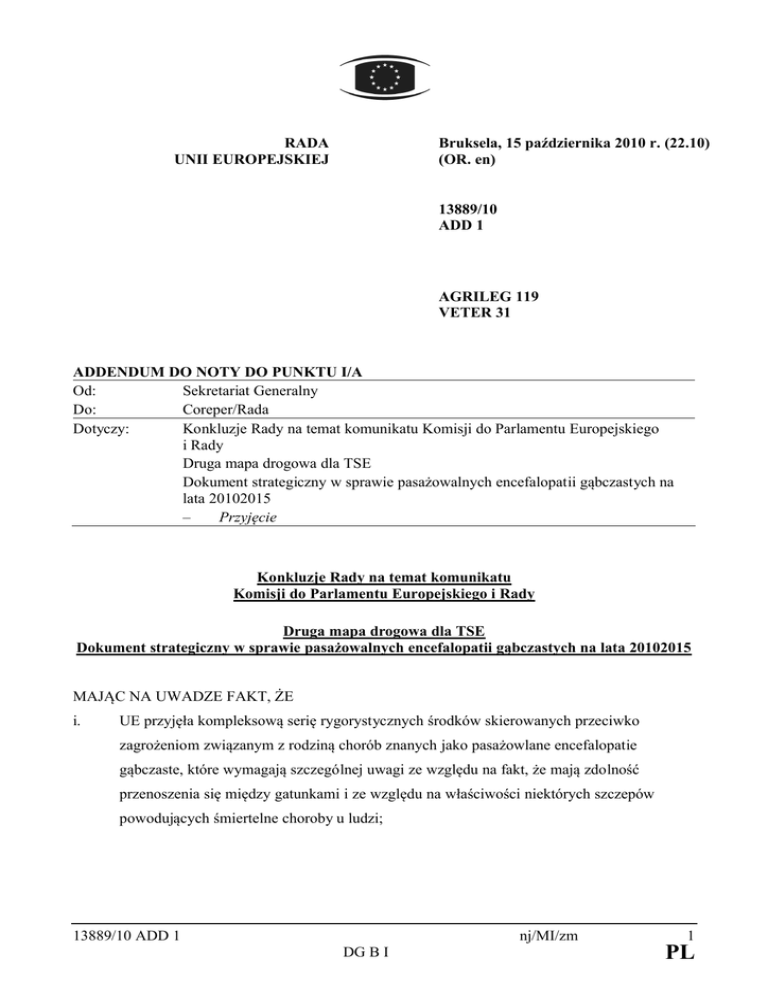 RADA UNII EUROPEJSKIEJ Bruksela, 15 października 2010 r. (22.10) (OR. en) 13889/10 ADD 1 AGRILEG 119 VETER 31 ADDENDUM DO NOTY DO PUNKTU I/A Od: Sekretariat Generalny Do: Coreper/Rada Dotyczy: Konkluzje Rady na temat komunikatu Komisji do Parlamentu Europejskiego i Rady Druga mapa drogowa dla TSE Dokument strategiczny w sprawie pasażowalnych encefalopatii gąbczastych na lata 20102015 – Przyjęcie Konkluzje Rady na temat komunikatu Komisji do Parlamentu Europejskiego i Rady Druga mapa drogowa dla TSE Dokument strategiczny w sprawie pasażowalnych encefalopatii gąbczastych na lata 20102015 MAJĄC NA UWADZE FAKT, ŻE i. UE przyjęła kompleksową serię rygorystycznych środków skierowanych przeciwko zagrożeniom związanym z rodziną chorób znanych jako pasażowlane encefalopatie gąbczaste, które wymagają szczególnej uwagi ze względu na fakt, że mają zdolność przenoszenia się między gatunkami i ze względu na właściwości niektórych szczepów powodujących śmiertelne choroby u ludzi; 13889/10 ADD 1 nj/MI/zm DG B I 1 PL ii. Środki te, wynikające z rozporządzenia (WE) nr 999/2001 Parlamentu Europejskiego i Rady z dnia 22 maja 2001 r. ustanawiającego zasady dotyczące zapobiegania, kontroli i zwalczania niektórych przenośnych gąbczastych encefalopatii1 przyczyniły się do znacznego ograniczenia występowania TSE. Jednocześnie wydaje się, że wpływ gąbczastej encefalopatii bydła (BSE) na zdrowie ludzi jest mniejszy, niż się pierwotnie obawiano; iii. W dniu 15 lipca 2005 r., podsumowując rozwój sytuacji epidemiologicznej i coraz lepszą wiedzę naukową, Komisja przekazała Parlamentowi Europejskiemu i Radzie dokument zwierający spostrzeżenia zatytułowany „Mapa drogowa dla TSE”2; iv. Pierwsza mapa drogowa została dogłębnie przeanalizowana w sprawozdaniu z postępów skierowanym do Rady3; v. W dniu 16 lutego 2010 r. Komisja przedłożyła Parlamentowi Europejskiemu i Radzie „Druga mapę drogową dla TSE”. Podobnie jak w przypadku pierwszej mapy drogowej sprzed pięciu lat, celem tego dokumentu jest przedstawienie w zarysie przyszłych potencjalnych zmian, tak by możliwe było dokonanie przeglądu środków pod kątem dostosowania ich do sytuacji, w której UE jest już bliska wyeliminowaniu BSE ze swej populacji bydła; vi. Podczas prezydencji belgijskiej Grupa Robocza Ekspertów Weterynaryjnych (zdrowie publiczne) omówiła w Radzie komunikat Komisji i określiła obszary priorytetowe dalszych prac4. 1 2 3 4 Rozporządzenie Parlamentu Europejskiego i Rady (WE) nr 999/2001 z dnia 22 maja 2001 r. ustanawiające zasady dotyczące zapobiegania, kontroli i zwalczania niektórych przenośnych gąbczastych encefalopatii Dz.U. L 147 z 31.5.2001, s. 1. Dok. 11408/05 – COM(2005) 322 wersja ostateczna. Dok. 15537/05 + ADD 1. Dok. 13888/10. 13889/10 ADD 1 nj/MI/zm DG B I 2 PL RADA UNII EUROPEJSKIEJ, Uwzględniając podejście ogólne 1. Z dużym ZADOWOLENIEM PRZYJMUJE inicjatywę Komisji, by pięć lat po poprzednim dokumencie przedstawić nową „Mapę drogową dla TSE” jako podstawę do przyszłych dostosowań istniejących środków; 2. ZAUWAŻA, że większość działań zapowiedzianych w pierwszej „Mapie drogowej dla TSE” z 2005 roku została zrealizowana. 3. UWAŻA, że stosowanie obowiązującego ustawodawstwa dotyczącego TSE okazało się skuteczne w zakresie profilaktyki, zapobiegania tej chorobie i jej zwalczania. 4. POTWIERDZA, że celem na najbliższe lata jest kontynuacja przeglądu środków z myślą o ich proporcjonalności i opłacalności, przy jednoczesnym gwarantowaniu wysokiego poziomu bezpieczeństwa żywności. Przegląd ten powinien opierać się przede wszystkim na zaleceniach naukowych i kwestiach technicznych odnoszących się do kontroli i egzekwowania nowych środków; należy też w pełni uwzględnić wzajemne powiązania między różnymi środkami nadzoru i kontroli. 5. WZYWA do stopniowego wprowadzania zmian przepisów dotyczących TSE na podstawie odpowiedniej oceny ewentualnych zagrożeń dla zdrowia ludzi i zwierząt i z uwzględnieniem istniejących danych i innowacji naukowych. 6. PRZYWOŁUJE w tym kontekście kluczowe cele ochrony konsumentów oraz zapobiegania i zwalczania TSE, które to cele wymagają czujności, tak by kontynuować monitorowanie sytuacji również w przypadku potencjalnego ponownego wystąpienia BSE lub wystąpienia nowych czynników TSE w populacjach. 7. PRZYPOMINA, że zasadniczą rolę przy rozpatrywaniu strategicznych opcji na przyszłość w dalszym ciągu powinny odgrywać konsultacje naukowe z Europejskim Urzędem ds. Bezpieczeństwa Żywności (EFSA). 13889/10 ADD 1 nj/MI/zm DG B I 3 PL 8. UWAŻA, że niezmiernie ważna jest ponadto kontynuacja badań w tych obszarach, w których brakuje informacji lub występują luki uniemożliwiające podjęcie wiążących decyzji. 9. PODKREŚLA znaczenie istnienia solidnych i wiarygodnych ram międzynarodowych, w szczególności w kontekście Światowej Organizacji Zdrowia Zwierząt (OIE), które gwarantowałyby, że handel może przebiegać w sposób bezpieczny i sprawiedliwy. UE musi przyjąć wiodąca rolę w międzynarodowych organizacjach standaryzacyjnych, promując standardy i politykę UE oraz dostosowując w możliwie największym zakresie swoje prawodawstwo do standardów międzynarodowych przy jednoczesnym utrzymywaniu wysokiego poziomu ochrony sanitarnej. W odniesieniu do konkretnych opcji kierunków polityki 10. POPIERA cel Komisji, by kontynuować dostosowywanie systemu monitorowania BSE u bydła z myślą o lepszym ukierunkowaniu działań, oraz UWAŻA, że należy to zrobić zaraz po otrzymaniu koniecznych uzasadniających opinii naukowych na ten temat. 11. ZGADZA SIĘ, że takie dostosowanie powinno opierać się na ocenie ryzyka i służyć temu, by system monitorowania UE był bardziej ukierunkowany, skuteczny i opłacalny dla wszystkich państw członkowskich. Jednocześnie dostosowania te będą musiały być zgodne