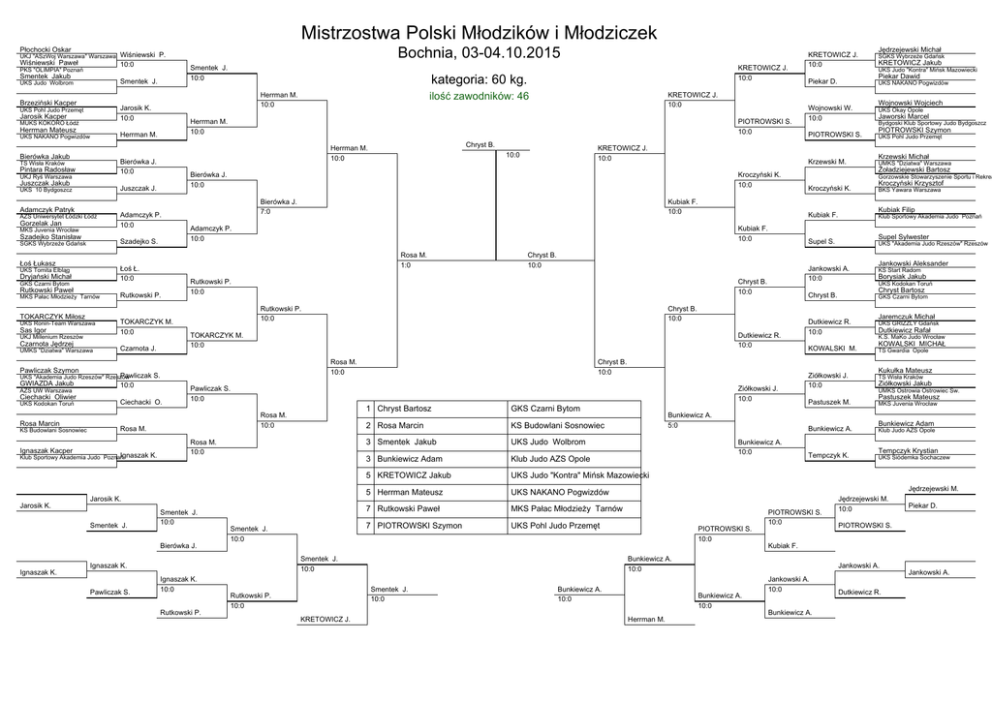 Mistrzostwa Polski Młodzików i Młodziczek Płochocki Oskar UKJ "ASzWoj Warszawa" Warszawa Wiśniewski Paweł PKS "OLIMPIA" Poznań Smentek Jakub Smentek J. UKS Judo Wolbrom Brzeziński Kacper Jarosik Kacper MUKS KOKORO Łódź Herrman Mateusz Bierówka Jakub Pintara Radosław UKJ Ryś Warszawa Juszczak Jakub Adamczyk Patryk AZS Uniwersytet Łódzki Łódź Gorzelak Jan MKS Juvenia Wrocław Szadejko Stanisław Adamczyk P. 10:0 Szadejko S. SGKS Wybrzeże Gdańsk Łoś Łukasz Dryjański Michał GKS Czarni Bytom Rutkowski Paweł MKS Pałac Młodzieży Tarnów TOKARCZYK Miłosz UKS Ronin-Team Warszawa Sas Igor UKJ Millenium Rzeszów UMKS "Dziatwa" Warszawa Rutkowski P. TOKARCZYK M. 10:0 Czarnota J. Pawliczak Szymon Pawliczak UKS "Akademia Judo Rzeszów" Rzeszów GWIAZDA Jakub AZS UW Warszawa Ciechacki Oliwier UKS Kodokan Toruń Rosa Marcin KS Budowlani Sosnowiec Jarosik K. TOKARCZYK M. 10:0 Dutkiewicz R. 10:0 Pawliczak S. 10:0 Ziółkowski J. 10:0 Rosa M. 10:0 Jarosik K. Smentek J. 10:0 Smentek J. 10:0 2 Rosa Marcin KS Budowlani Sosnowiec 3 Smentek Jakub UKS Judo Wolbrom 3 Bunkiewicz Adam Klub Judo AZS Opole 5 KRETOWICZ Jakub UKS Judo "Kontra" Mińsk Mazowiecki 5 Herrman Mateusz UKS NAKANO Pogwizdów 7 Rutkowski Paweł MKS Pałac Młodzieży Tarnów 7 PIOTROWSKI Szymon UKS Pohl Judo Przemęt Smentek J. 10:0 Ignaszak K. Pawliczak S. Chryst B. 10:0 GKS Czarni Bytom Ignaszak K. 10:0 Rutkowski P. KRETOWICZ J. Bunkiewicz A. 5:0 UKS Judo "Kontra" Mińsk Mazowiecki Wojnowski Wojciech UKS Okay Opole Jaworski Marcel Bydgoski Klub Sportowy Judo Bydgoszcz PIOTROWSKI Szymon UKS Pohl Judo Przemęt Krzewski Michał UMKS "Dziatwa" Warszawa Gorzowskie Stowarzyszenie Sportu i Rekrea Kroczyński K. Kroczyński Krzysztof BKS Yawara Warszawa Kubiak Filip Klub Sportowy Akademia Judo Poznań Supel Sylwester UKS "Akademia Judo Rzeszów" Rzeszów Jankowski Aleksander KS Start Radom Borysiak Jakub UKS Kodokan Toruń Chryst Bartosz GKS Czarni Bytom Dutkiewicz R. 10:0 KOWALSKI M. Ziółkowski J. 10:0 Pastuszek M. Bunkiewicz A. Bunkiewicz A. 10:0 KRETOWICZ Jakub Żoładziejewski Bartosz Tempczyk K. Jaremczuk Michał UKS GRIZZLY Gdańsk Dutkiewicz Rafał K.S. MaKo Judo Wrocław KOWALSKI MICHAŁ TS Gwardia Opole Kukułka Mateusz TS Wisła Kraków Ziółkowski Jakub UMKS Ostrowia Ostrowiec Św. Pastuszek Mateusz MKS Juvenia Wrocław Bunkiewicz Adam Klub Judo AZS Opole Tempczyk Krystian UKS Siódemka Sochaczew Jędrzejewski M. PIOTROWSKI S. 10:0 PIOTROWSKI S. 10:0 Bunkiewicz A. 10:0 Piekar D. PIOTROWSKI S. Jankowski A. Bunkiewicz A. 10:0 Herrman M. Jędrzejewski M. 10:0 Kubiak F. Bunkiewicz A. 10:0 Smentek J. 10:0 Rutkowski P. 10:0 PIOTROWSKI S. Chryst B. Chryst B. 10:0 1 Chryst Bartosz Wojnowski W. 10:0 Jankowski A. 10:0 Chryst B. 10:0 SGKS Wybrzeże Gdańsk UKS NAKANO Pogwizdów Supel S. Chryst B. 10:0 Jędrzejewski Michał Piekar Dawid Piekar D. Kubiak F. Kubiak F. 10:0 Rutkowski P. 10:0 Bierówka J. Ignaszak K. Kubiak F. 10:0 Rutkowski P. 10:0 KRETOWICZ J. 10:0 Krzewski M. Adamczyk P. 10:0 Rosa M. Smentek J. 10:0 Bierówka J. 7:0 Rosa M. 10:0 K. KRETOWICZ J. 10:0 Kroczyński K. 10:0 S. Ciechacki O. Ignaszak Klub Sportowy Akademia Judo Poznań Chryst B. Rosa M. 10:0 10:0 Ignaszak Kacper KRETOWICZ J. 10:0 PIOTROWSKI S. 10:0 Rosa M. 1:0 Łoś Ł. 10:0 UKS Tomita Elbląg ilość zawodników: 46 Bierówka J. 10:0 Juszczak J. UKS 10 Bydgoszcz kategoria: 60 kg. Herrman M. 10:0 Bierówka J. 10:0 TS Wisła Kraków KRETOWICZ J. 10:0 Herrman M. 10:0 Herrman M. UKS NAKANO Pogwizdów Bochnia, 03-04.10.2015 Smentek J. 10:0 Herrman M. 10:0 Jarosik K. 10:0 UKS Pohl Judo Przemęt Czarnota Jędrzej Wiśniewski P. 10:0 Jankowski A. 10:0 Bunkiewicz A. Dutkiewicz R. Jankowski A.