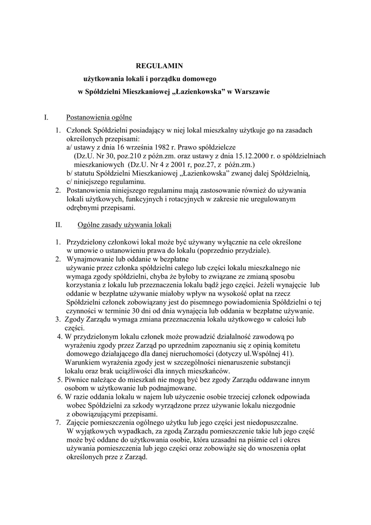 REGULAMIN uŜytkowania lokali i porządku domowego w Spółdzielni Mieszkaniowej „Łazienkowska” w Warszawie I. Postanowienia ogólne 1. Członek Spółdzielni posiadający w niej lokal mieszkalny uŜytkuje go na zasadach określonych przepisami: a/ ustawy z dnia 16 września 1982 r. Prawo spółdzielcze (Dz.U. Nr 30, poz.210 z późn.zm. oraz ustawy z dnia 15.12.2000 r. o spółdzielniach mieszkaniowych (Dz.U. Nr 4 z 2001 r, poz.27, z późn.zm.) b/ statutu Spółdzielni Mieszkaniowej „Łazienkowska” zwanej dalej Spółdzielnią, c/ niniejszego regulaminu. 2. Postanowienia niniejszego regulaminu mają zastosowanie równieŜ do uŜywania lokali uŜytkowych, funkcyjnych i rotacyjnych w zakresie nie uregulowanym odrębnymi przepisami. II. Ogólne zasady uŜywania lokali 1. Przydzielony członkowi lokal moŜe być uŜywany wyłącznie na cele określone w umowie o ustanowieniu prawa do lokalu (poprzednio przydziale). 2. Wynajmowanie lub oddanie w bezpłatne uŜywanie przez członka spółdzielni całego lub części lokalu mieszkalnego nie wymaga zgody spółdzielni, chyba Ŝe byłoby to związane ze zmianą sposobu korzystania z lokalu lub przeznaczenia lokalu bądź jego części. JeŜeli wynajęcie lub oddanie w bezpłatne uŜywanie miałoby wpływ na wysokość opłat na rzecz Spółdzielni członek zobowiązany jest do pisemnego powiadomienia Spółdzielni o tej czynności w terminie 30 dni od dnia wynajęcia lub oddania w bezpłatne uŜywanie. 3. Zgody Zarządu wymaga zmiana przeznaczenia lokalu uŜytkowego w całości lub części. 4. W przydzielonym lokalu członek moŜe prowadzić działalność zawodową po wyraŜeniu zgody przez Zarząd po uprzednim zapoznaniu się z opinią komitetu domowego działającego dla danej nieruchomości (dotyczy ul.Wspólnej 41). Warunkiem wyraŜenia zgody jest w szczególności nienaruszenie substancji lokalu oraz brak uciąŜliwości dla innych mieszkańców. 5. Piwnice naleŜące do mieszkań nie mogą być bez zgody Zarządu oddawane innym osobom w uŜytkowanie lub podnajmowane. 6. W razie oddania lokalu w najem lub uŜyczenie osobie trzeciej członek odpowiada wobec Spółdzielni za szkody wyrządzone przez uŜywanie lokalu niezgodnie z obowiązującymi przepisami. 7. Zajęcie pomieszczenia ogólnego uŜytku lub jego części jest niedopuszczalne. W wyjątkowych wypadkach, za zgodą Zarządu pomieszczenie takie lub jego część moŜe być oddane do uŜytkowania osobie, która uzasadni na piśmie cel i okres uŜywania pomieszczenia lub jego części oraz zobowiąŜe się do wnoszenia opłat określonych prze z Zarząd. III. Uprawnienia i obowiązki mieszkańców w zakresie napraw i remontów w lokalach (tekst do wglądu w Administracji). IV. Zmiany, przebudowa i wprowadzanie dodatkowego wyposaŜenia w lokalu i pomieszczeniach ogólnego uŜytku (tekst do wglądu w Administracji) V. Ogólne przepisy porządkowe. Obowiązki mieszkańców w zakresie sanitarnoPorządkowym Członkowie Spółdzielni oraz inne osoby uŜytkujące lokale winny dbać o poszanowanie mienia Spółdzielni. W szczególności utrzymywać lokale i pomieszczenia do nich przynaleŜne we właściwym stanie technicznym i sanitarnym oraz dbać i chronić przed uszkodzeniem i dewastacją części budynku przeznaczone do wspólnego korzystania, jak: windy, klatki schodowe, korytarze, inne pomieszczenia gospodarcze oraz otoczenie budynku. Osoby zamieszkujące w budynkach Spółdzielni winny korzystać z lokalu i pomieszczeń przynaleŜnych oraz urządzeń wspólnych, w sposób nie utrudniający korzystania z nich innym osobom. 1. W godzinach nocnych od godz. 22ºº do 7ºº rano obowiązuje ograniczenie hałasów. W ciągu dnia nie naleŜy nastawiać zbyt głośno odbiorników radiowych i telewizyjnych. 2. Członkowie posiadający w mieszkaniu zwierzęta obowiązani są zagwarantować im odpowiednią opiekę, przestrzegać wymogów sanitarno-porządkowych oraz usuwać zanieczyszczenia spowodowane przez nie na klatce schodowej lub innych pomieszczeniach budynku słuŜących do wspólnego uŜytku oraz naprawiać szkody spowodowane przez zwierzęta w zieleni osiedlowej. 3 Śmieci komunalne i inne drobne odpadki naleŜy wyrzucać wyłącznie do zsypu , zaś odpady pozagabarytowe, wyłącznie do pojemników do tego celu przeznaczonych. Zabrania się wyrzucania do zsypów odpadków powodujących moŜliwość zapychania przewodów zsypowyh. Niedopuszczalne jest równieŜ wrzucanie jakichkolwiek odpadów i przedmiotów do misek klozetowych, co powoduje zapychanie się pionów i zalewanie lokali połoŜonych na niŜszych piętrach. Zabrania się wykorzystywania zsypów i śmietników do gromadzenia gruzu i innych przedmiotów nie związanych z uŜytkowaniem lokalu do celów niemieszkalnych. Przedmioty te i gruz członkowie mają obowiązek wywieźć na wysypisko miejskie na własny koszt. 4. Na strychach i w piwnicach nie wolno przechowywać materiałów łatwopalnych. W korytarzach piwnicznych nie wolno przechowywać Ŝadnych przedmiotów. Zabrania się palenia papierosów i uŜywania otwartego ognia w piwnicach, na strychu, w kabinach dźwigów i w przedsionkach komór zsypowych. Zabrania się mieszkańcom jakichkolwiek manipulacji czy napraw bezpieczników i instalacji elektrycznych poza obrębem mieszkania. W przypadku stwierdzenia tego typu uszkodzeń naleŜy niezwłocznie zawiadomić dozorcę lub administrację. W przypadku stwierdzenia ulatniania się gazu naleŜy natychmiast zamknąć zawór dopływu gazu przy kuchence lub przy gazomierzu, po czym powiadomić pogotowie gazowe i Administrację (poza godzinami pracy Administracji – dozorcę domu). 5. Estetyka wokół bydynku Zabrania się: a/ wyrzucania przez okna jakichkolwiek przedmiotów, odpadków, itp., b/ trzepania dywanów w miejscach na ten cel nie przeznaczonych. Niedopuszczalne jest zaśmiecanie (zanieczyszczanie) pomieszczeń ogólnego uŜytku oraz dewastowanie urządzeń stanowiących wyposaŜenie budynku. Szkody te b