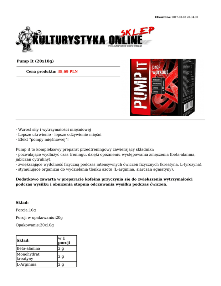 Utworzono: 2017-03-08 20:34:00 Pump It (20x10g) Cena produktu: 38,69 PLN - Wzrost siły i wytrzymałości mięśniowej - Lepsze ukrwienie - lepsze odżywienie mięśni - Efekt "pompy mięśniowej"! Pump it to kompleksowy preparat przedtreningowy zawierający składniki: - pozwalające wydłużyć czas treningu, dzięki opóźnieniu występowania zmęczenia (beta-alanina, jabłczan cytruliny), - zwiększające wydolność fizyczną podczas intensywnych ćwiczeń fizycznych (kreatyna, L-tyrozyna), - stymulujące organizm do wydzielania tlenku azotu (L-arginina, siarczan agmatyny). Dodatkowo zawarta w preparacie kofeina przyczynia się do zwiększenia wytrzymałości podczas wysiłku i obniżenia stopnia odczuwania wysiłku podczas ćwiczeń. Skład: Porcja:10g Porcji w opakowaniu:20g Opakowanie:20x10g Skład: w1 porcji Beta-alanina 2g Monohydrat kreatyny 2g L-Arginina 2g Siarczan agmatyny 1g Jabłczan cytruliny 1g L-Tyrozyna 500 mg Kofeina 200 mg Niacyna 48 mg Dawkowanie: Stosować 1 porcję przed treningiem. Adres: http://www.ko.sklep.pl/ Telefon: kom. 782 010 880 Email: [email protected]