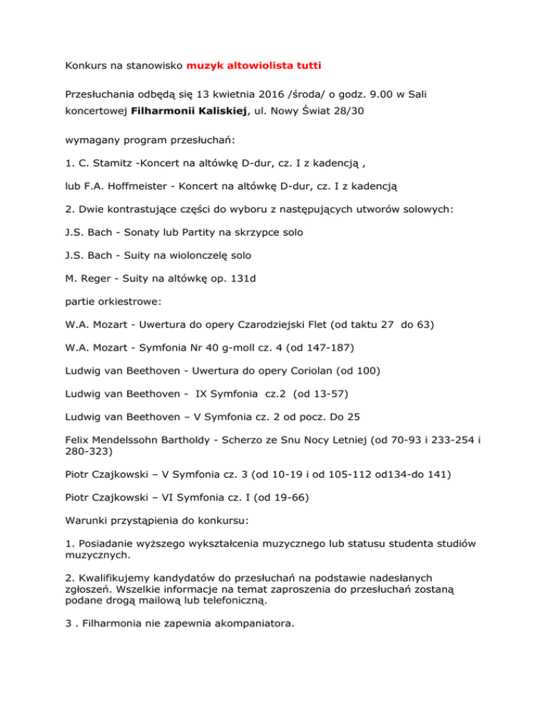 Konkurs na stanowisko muzyk altowiolista tutti Przesłuchania odbędą się 13 kwietnia 2016 /środa/ o godz. 9.00 w Sali koncertowej Filharmonii Kaliskiej, ul. Nowy Świat 28/30 wymagany program przesłuchań: 1. C. Stamitz -Koncert na altówkę D-dur, cz. I z kadencją , lub F.A. Hoffmeister - Koncert na altówkę D-dur, cz. I z kadencją 2. Dwie kontrastujące części do wyboru z następujących utworów solowych: J.S. Bach - Sonaty lub Partity na skrzypce solo J.S. Bach - Suity na wiolonczelę solo M. Reger - Suity na altówkę op. 131d partie orkiestrowe: W.A. Mozart - Uwertura do opery Czarodziejski Flet (od taktu 27 do 63) W.A. Mozart - Symfonia Nr 40 g-moll cz. 4 (od 147-187) Ludwig van Beethoven - Uwertura do opery Coriolan (od 100) Ludwig van Beethoven - IX Symfonia cz.2 (od 13-57) Ludwig van Beethoven – V Symfonia cz. 2 od pocz. Do 25 Felix Mendelssohn Bartholdy - Scherzo ze Snu Nocy Letniej (od 70-93 i 233-254 i 280-323) Piotr Czajkowski – V Symfonia cz. 3 (od 10-19 i od 105-112 od134-do 141) Piotr Czajkowski – VI Symfonia cz. I (od 19-66) Warunki przystąpienia do konkursu: 1. Posiadanie wyższego wykształcenia muzycznego lub statusu studenta studiów muzycznych. 2. Kwalifikujemy kandydatów do przesłuchań na podstawie nadesłanych zgłoszeń. Wszelkie informacje na temat zaproszenia do przesłuchań zostaną podane drogą mailową lub telefoniczną. 3 . Filharmonia nie zapewnia akompaniatora. 4. Filharmonia nie zwraca kosztów podróży oraz zakwaterowania. 5. Filharmonia zastrzega sobie prawo nierozstrzygnięcia, a także odwołania lub unieważnienia przesłuchań bez podania przyczyny. 6. ostateczny termin nadsyłania zgłoszeń upływa 4 kwietnia 2016. Zgłoszenia należy przesłać pocztą na adres instytucji lub mailem na adres [email protected] (w temacie maila proszę wpisać przesłuchania na stanowisko altowiolisty)