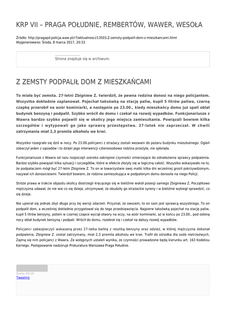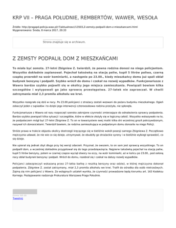 KRP VII – PRAGA POŁUDNIE, REMBERTÓW, WAWER, WESOŁA Źródło: http://pragapd.policja.waw.pl/r7/aktualnosci/13503,Z-zemsty-podpalil-dom-z-mieszkancami.html Wygenerowano: Środa, 8 marca 2017, 20:33 Strona znajduje się w archiwum. Z ZEMSTY PODPALIŁ DOM Z MIESZKAŃCAMI To miała być zemsta. 27-letni Zbigniew Z. twierdził, że pewna rodzina donosi na niego policjantom. Wszystko dokładnie zaplanował. Pojechał taksówką na stację paliw, kupił 5 litrów paliwa, czarną czapkę przerobił na wzór kominiarki, a następnie po 23.00., kiedy mieszkańcy domu już spali oblał budynek benzyną i podpalił. Szybko wrócił do domu i czekał na rozwój wypadków. Funkcjonariusze z Wawra bardzo szybko pojawili się w okolicy jego miejsca zamieszkania. Powiązali bowiem kilka szczegółów i wytypowali go jako sprawcę przestępstwa. 27-latek nie zaprzeczał. W chwili zatrzymania miał 2,3 promila alkoholu we krwi. Wszystko rozegrało się dziś w nocy. Po 23.00.policjanci z strażacy zostali wezwani do pożaru budynku mieszkalnego. Ogień zobaczył jeden z sąsiadów i to dzięki jego interwencji czteroosobowa rodzina przeżyła, nie spłonęła. Funkcjonariusze z Wawra od razu rozpoczęli szeroko zakrojone czynności zmierzające do odnalezienia sprawcy podpalenia. Bardzo szybko powiązali kilka sytuacji i szczegółów, które w efekcie złożyły się w logiczną całość. Wszystko wskazywało na to, że podpalaczem mógł być 27-letni Zbigniew Z. To on w towarzystwie swej matki kilka dni wcześniej groził pokrzywdzonym, nazywał ich donosicielami. Twierdził bowiem, że rodzina zamieszkująca w podpalonym domu donosiła na niego Policji. Stróże prawa w trakcie objazdu okolicy dostrzegli kręcącego się w bieliźnie wokół posesji samego Zbigniewa Z. Początkowo mężczyzna udawał, że nie wie co się dzieje, utrzymywał, że obudziły go strażackie syreny i w bieliźnie wybiegł sprawdzić, co się dzieje. Nie upierał się jednak zbyt długo przy tej wersji zdarzeń. Przyznał, że owszem, to on sam jest sprawcą wszystkiego. To on podpalił dom, a wcześniej dokładnie przygotował się do tego przedsięwzięcia. Najpierw taksówką pojechał na stację paliw, kupił 5 litrów benzyny, potem w czarnej czapce wyciął otwory na oczy, na wzór kominiarki, aż w końcu po 23.00., pod osłoną nocy oblał budynek benzyną i podpali. Wrócił do domu, rozebrał się i czekał na dalszy rozwój wypadków. Policjanci zabezpieczyli wskazaną przez 27-latka bańkę z resztką benzyny oraz odzież, w której mężczyzna dokonał podpalenia. Zbigniew Z. został zatrzymany, miał 2,3 promila alkoholu we krwi. Trafił do ośrodka dla osób nietrzeźwych. Zajmą się nim policjanci z Wawra. Ze wstępnych ustaleń wynika, że czynności prowadzone będą kierunku art. 163 Kodeksu Karnego. Postępowanie nadzoruje Prokuratura Warszawa Praga Południe. Ocena: 0/5 (0) Tweetnij