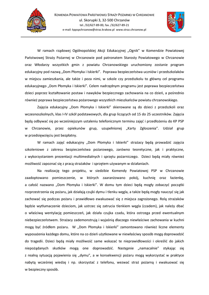 KOMENDA POWIATOWA PAŃSTWOWEJ STRAŻY POŻARNEJ W CHRZANOWIE ul. Skorupki 3, 32-500 Chrzanów tel. /32/627-89-00, fax. /32/627-89-21 e-mail: [email protected] www.straz.chrzanow.pl W ramach rządowej Ogólnopolskiej Akcji Edukacyjnej „Ognik” w Komendzie Powiatowej Państwowej Straży Pożarnej w Chrzanowie pod patronatem Starosty Powiatowego w Chrzanowie oraz Włodarzy wszystkich gmin z powiatu Chrzanowskiego uruchomiony zostanie program edukacyjny pod nazwą „Dom Płomyka i Iskierki”. Poprawa bezpieczeństwa uczniów i przedszkolaków w miejscu zamieszkania, ale także i poza nimi, w szkole czy przedszkolu to główny cel programu edukacyjnego „Dom Płomyka i Iskierki”. Celem nadrzędnym programu jest poprawa bezpieczeństwa dzieci poprzez kształtowanie postaw i nawyków bezpiecznego zachowania na co dzień, a pośrednio również poprawa bezpieczeństwa pożarowego wszystkich mieszkańców powiatu chrzanowskiego. Zajęcia edukacyjny „Dom Płomyka i Iskierki” skierowane są do dzieci z przedszkoli oraz wczesnoszkolnych, klas I-IV szkół podstawowych, dla grup liczących od 15 do 25 uczestników. Zajęcia będą odbywać się po wcześniejszym ustaleniu telefonicznym terminu zajęć i przedłożeniu do KP PSP w Chrzanowie, przez opiekunów grup, uzupełnionej „Karty Zgłoszenia”. Udział grup w przedsięwzięciu jest bezpłatny. W ramach zajęć edukacyjny „Dom Płomyka i Iskierki” strażacy będą prowadzić zajęcia szkoleniowe z zakresu bezpieczeństwa pożarowego, zarówno teoretyczne, jak i praktyczne, z wykorzystaniem prezentacji multimedialnych i sprzętu pożarniczego. Dzieci będą miały również możliwość zapoznać się z pracą strażaków i sprzętem używanym w działaniach. Na realizację tego projektu, w siedzibie Komendy Powiatowej PSP w Chrzanowie zaadoptowano pomieszczenie, w których zaaranżowano pokój, kuchnię oraz łazienkę, a całość nazwano „Dom Płomyka i Iskierki”. W domu tym dzieci będą mogły zobaczyć początki rozprzestrzenia się pożaru, jak działają czujki dymu i tlenku węgla, a także będą mogły nauczyć się jak zachować się podczas pożaru i prawidłowo ewakuować się z miejsca zagrożonego. Rolą strażaków będzie wytłumaczenie dzieciom, jak ustrzec się zatrucia tlenkiem węgla (czadem), jak należy dbać o właściwą wentylację pomieszczeń, jak działa czujka czadu, która ostrzega przed ewentualnym niebezpieczeństwem. Strażacy zademonstrują i wyjaśnią dlaczego niewłaściwe zachowania w kuchni mogą być źródłem pożaru. W „Dom Płomyka i Iskierki” zamontowano również liczne elementy wyposażenia każdego domu, które na co dzień użytkowane w niewłaściwy sposób mogą doprowadzić do tragedii. Dzieci będą miały możliwość same wskazać te nieprawidłowości i określić do jakich niepożądanych skutków mogą one doprowadzić. Następnie „namacalnie” stykając się z realną sytuacją pojawienia się „dymu”, a w konsekwencji pożaru mogą wykorzystać w praktyce nabytą wcześniej wiedzę i np. skorzystać z telefonu, wezwać straż pożarną i ewakuować się w bezpieczny sposób. KOMENDA POWIATOWA PAŃSTWOWEJ STRAŻY POŻARNEJ W CHRZANOWIE ul. Skorupki 3, 32-500 Chrzanów tel. /32/627-89-00, fax. /32/627-89-21 e-mail: [email protected] www.straz.chrzanow.pl W filmie wystąpili: Milena Skowrońska (córka) , Izabella Prochal Kuchcińska (mama) oraz strażacy zmiany II JRG w Chrzanowie (strażacy)