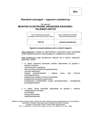 2 9 /c S ta n d a r d w y m a g a ń –e g z a m in c z e la d n ic z y M O N T E R dla zawodu E L E K T R O N IK U R Z Ą D Z E Ń T E L E W IZ Y J N Y C H R A D IO W O - K o d z k la s y f ik a c ji z a w o d ó w i s p e c ja ln o ś c i d la p o tr z e b r y n k u p r a c y K o d z k la s y f ik a c ji z a w o d ó w s z k o ln ic t w a z a w o d o w e g o 725110 z a w ó d p o z a s z k o ln y E g z a m in p r z e p r o w a d z a n y je s t w d w ó c h e ta p a c h : e t ap p r ak t y c zn y : p ole g a n a s am odzi e ln y m wy k on an i u p r ze z k an dy dat a zadań e g zam i n ac y j n y c h s p r awdzaj ą c y c h um i e j ę t n oś c i p r ak t y c zn e e t ap t e or e t y c zn y : e t ap p i s e m n e j i us t n e j t e or e t y c zn y odb y wa s i ę w dwó c h c zę ś c i ac h ; 1 . w c zę ś c i p i s e m n e j k an dy dat udzi e la odp owi e dzi n a p y t an i a z zak r e s u t e m at ó w: - r ac h un k owoś ć zawodowa - dok um e n t ac j a dzi ał aln oś c i g os p odar c ze j - r y s un e k zawodowy - zas ady b e zp i e c ze ń s t wa i h ig ie n y p r ac y or az oc h r on y p r ze c i wp oż ar owe j - p ods t awowe zas ady oc h r on y ś r odowi s k a - p ods t awowe p r ze p i s y p r awa p r ac y - p ods t awowa p r ob le m at y k a p r awa g os p odar c ze g o i zar zą dzan i a p r ze ds i ę b i or s t we m 2 . w c zę ś c i us t n e j k an dy dat n as t ę p uj ą c y c h t e m at ó w: - t e c h n olog i a - m as zy n ozn aws t wo - m at e r i ał ozn aws t wo Z a d a n ia d o e ta p u p r a k t y s ta n d a rd (U s D z . U . Z 2 0 0 2 c z n u w ta w r N e g o i p y y m a g a ń a o rz e m r 1 1 2 , p o t a n ia d o u s ta lo n io ś le z z . 9 7 9 , e ta e g o d n ia z p ó p u te p rz e 2 2 m ź n . z o re z Z a r m . odp owi ada n a p y t an i a z zak r e s u ty c w ią c a D z z n z e 1 9 . U e g o k R 8 9 , . z p z e te 2 0 rz y g o m io s k s t je 0 3 N to w ła P d n o r 1 3 y w o ls lit y 7 , a n e s ą n a p o d s ta w ie k ie g o : p o z . 1 3 0 4 ) Zawód: monter elektronik urządzeń radiowo- telewizy j ny ch I. E t a p t e o r e t y c z n y ( c z ę ś ć p i s e m n a i u s t n a ) e g z a m i n u o b e j m u j e : Zakres wiadomoś ci i umiej ę tnoś ci wł aś ciwy ch zawodzie dla klas y f ikacj i w K a n d y d a t p o w in ie n u m ie ć : 1. C z y t a r y s u n s z c z e 1.1. 1.2 . 1.3 . 1.4 . 1.5 . 1.6 . 1.7 . ć z e z r o z u m ie n ie m in fo r m a c je p r z e d s ta w io n e w fo r m ie o p is ó w , in s tr u k c ji, k ó w , s z k ic ó w , w y k r e s ó w , d o k u m e n ta c ji te c h n ic z n y c h i te c h n o lo g ic z n y c h , a w g ó ln o ś c i: r o z p o z n a w a ć n a s c h e m a ta c h id e o w y c h , b lo k o w y c h i m o n ta ż o w y c h s y m b o le g r a f ic z n e e le m e n tó w , u k ła d ó w i u r z ą d z e ń e le k tr o n ic z n y c h o r a z p o łą c z e n ia e le k tr y c z n e m ię d z y n im i; s to s o w a ć p o d s ta w o w e p o ję c ia , o k r e ś le n ia , w ie lk o ś c i i z a le ż n o ś c i c h a r a k te r y z u ją c e p o le e le k tr y c z n e , m a g n e ty c z n e , e le k tr o m a g n e ty c z n e o r a z o b w o d y e le k tr y c z n e ; s to s o w a ć p o d s ta w o w e p ra w a e le k t r o t e c h n ik i o p is u ją c e z a le ż n o ś c i m ię d z y w ie lk o ś c ia m i e le k t r y c z n y m i, p r z e k s z t a łc e n ia w z o r ó w p r a w e le k t r o t e c h n ik i, ro z p o z n a w a ć i r o z r ó ż n ia ć w ie lk o ś c i i je d n o s tk i m ia r o w e w y s tę p u ją c e w e le k tr o n ic e o r a z ic h p o c h o d n e ; r o z p o z n a w a ć i r o z r ó ż n ia ć e le m e n ty , p o d z e s p o ły , u k ła d y i u r z ą d z e n ia e le k tr o n ic z n e n a p o d s ta w ie ic h w y g lą d u , p a r a m e tr ó w k a ta lo g o w y c h i o z n a c z e ń n a n ic h u m ie s z c z o n y c h ; r o z u m ie ć i s to s o w a ć p o d s ta w o w e s f o r m u ło w a n ia s p e c ja lis ty c z n e z a w a rte w d o k u m e n ta c ji te c h n ic z n e j o b s łu g i, m o n ta ż u i s e r w is u u rz ą d z e ń r a d io te le w iz y jn y c h , u r z ą d z e ń n a g r y w a ją c y c h i o d tw a r z a ją c y c h s y g n a ł w iz y jn y i f o n ic z n y ; r o z r ó ż n ia ć e le m e n ty i d z ia ła n ie o d b io r n ik ó w r a d io w y c h , te le w iz y jn y c h o r a z m a g n e to fo n ó w ; 2. P r z e t w a r z a ć d a n e l i c z b o w e i o p e r a c y j n e , a w 2 .1. a n a l i z o o r a z in 2 .2 . s t o s o w i p o d z e 2 .3 . s t o s o w n a w a r 2 .4 . s t o s o w p o d s ta w a ć i s to s o w a ć s c h e m s tr u k c ji s e r w is o w y c h ; a ć o d p o w ie d n ie m e to d y s p o łó w w u r z ą d z e n ia c h a ć o d p o w ie d n ie z a s a d y to ś c i z a s tę p c z e d la e le m a ć n ie z b ę d n e p r a c e ś lu w ie s c h e m a tó w . s z c z e g ó ln o ś c i: a ty , r y s u n k i te c h n ic z n e , c h a r a k te r y s ty k , k a ta lo g ó w p o m ia r ó w r a d i o w o -t e z a m ie n n o ś e n tó w p o łą s a r s k ie i m , n a p ra le w iz y jn c i e le m c z o n y c e to d y w , m o n ta y c h ; e n tó w e le h s z e re g o lu to w a n ia ż u , w y m ia n y e le m e n tó w k tr o n ic z n y c h o r a z n o r m y w o i r ó w n o le g le ; o b w o d ó w i u k ła d ó w n a 3 . B e z p ie c z n ie w y k o n y w a ć z a d a n ia z a w o d o w e z g o d n ie z p r z e p is a m i b e z p ie c z e ń s tw a i h ig ie n y p r a c y , o c h r o n y p r z e c iw p o ż a r o w e j o r a z o c h r o n y ś r o d o w is k a , a w s z c z e g ó ln o ś c i: 3 .1. d o b i e r a ć ś r o d k i o c h r o n y i n d y w i d u a l n e j p o d c z a s p r a c m o n t e r s k i c h i i n s t a l a c y j n y c h ; 3 .2 . s t o s o w a ć p r z e p i s y b e z p i e c z e ń s t w a i h i g i e n y p r a c y , o c h r o n y p r z e c i w p o ż a r o w e o c h r o n y ś r o d o w is k a o 