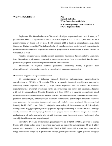 Wrocław, 26 października 2015 roku WK.WR.40.39.2015.215 Pan Henryk Babuśka Wójt Gminy Legnickie Pole ul. Kiliana Ignacego Dientzenhofera 1 59-241 Legnickie Pole Regionalna Izba Obrachunkowa we Wrocławiu, działając na podstawie art. 1 ust. 1 ustawy z 7 października 1992 r. o regionalnych izbach obrachunkowych (Dz.U. z 2012 r. poz. 1113 ze zm.) przeprowadziła w okresie od 13 lipca do 24 września 2015 r. kontrolę kompleksową gospodarki finansowej Gminy Legnickie Pole. Zakres zbadanych zagadnień, okres objęty kontrolą oraz ustalenia przedstawiono szczegółowo w protokole kontroli, podpisanym i przekazanym Wójtowi Gminy 24 września 2015 roku. Ponadto, przeprowadzona została kontrola gospodarki finansowej Zespołu Szkół w Legnickim Polu. Na podstawie jej ustaleń, zawartych w odrębnym protokole, Izba skierowała do Dyrektora tej jednostki wystąpienie pokontrolne przekazane Panu do wiadomości. Stwierdzone w wyniku kontroli gospodarki finansowej Gminy Legnickie Pole nieprawidłowości i uchybienia wystąpiły w zakresie niżej wskazanych zagadnień. W zakresie księgowości i sprawozdawczości W obowiązujących w jednostce zasadach (polityce) rachunkowości, wprowadzonych zarządzeniem nr 68/2014 z 31 grudnia 2014 r. w sprawie instrukcji regulujących gospodarkę finansową Gminy Legnickie Pole (…), Wójt Gminy Legnickie Pole nie określił dla wartości niematerialnych i prawnych wysokości stawki amortyzacyjnej oraz okresu ich umarzania. Zgodnie z § 6 ust. 2 rozporządzenia Ministra Finansów z 5 lipca 2010 r. w sprawie szczególnych zasad rachunkowości oraz planów kont dla budżetu państwa, budżetów jednostek samorządu terytorialnego, jednostek budżetowych, samorządowych zakładów budżetowych, państwowych funduszy celowych oraz państwowych jednostek budżetowych mających siedzibę poza granicami Rzeczypospolitej Polskiej (Dz.U. z 2013 r. poz. 289) ,,(…) Odpisów umorzeniowych lub amortyzacyjnych dokonuje się według zasad przyjętych przez jednostkę zgodnie z przepisami ustawy o rachunkowości. Ustalając zasady umarzania lub amortyzacji, jednostka może przyjąć stawki określone w przepisach o podatku dochodowym od osób prawnych albo stawki określone przez dysponenta części budżetowej albo zarząd jednostki samorządu terytorialnego”. Przyjęta w 2015 r. na kwitariuszach przychodowych nr 1502484-1502490 gotówka w łącznej kwocie 268 zł nie została ujęta w raportach kasowych, co stanowiło naruszenie art. 24 ust. 5 pkt 3 ustawy z 29 września 1994 r. o rachunkowości (Dz.U. z 2013 r. poz. 330 ze zm.), który stanowi, że księgi rachunkowe uznaje się za prowadzone bieżąco, jeżeli ujęcie wpłat i wypłat gotówką następuje w tym samym dniu, w którym zostały dokonane. W latach 2013 – 2014 nie prowadzono na koncie 980 „Plan finansowy wydatków budżetowych” ewidencji planu finansowego wydatków budżetowych, a zapisów na koncie 998 „Zaangażowanie wydatków budżetowych roku bieżącego” dokonywano na koniec kwartałów na podstawie wykonanych wydatków. Zgodnie z opisami kont 980 oraz 998 zawartymi w obowiązujących w jednostce zasadach (polityce) rachunkowości, wprowadzonych zarządzeniem nr 69/2008 z 31 grudnia 2008 r. w sprawie instrukcji regulujących gospodarkę finansową Gminy Legnickie Pole (…) oraz załączniku nr 3 do powołanego rozporządzenia w sprawie szczególnych zasad rachunkowości (…), konto 980 ,,Plan finansowy wydatków budżetowych” służy do ewidencji planu finansowego wydatków budżetowych dysponenta środków budżetowych. Na stronie Wn konta 980 ujmuje się plan finansowy wydatków budżetowych oraz jego zmiany. Na stronie Ma konta 980 ujmuje się: równowartość zrealizowanych wydatków budżetu (…), konto 998 ,,Zaangażowanie wydatków budżetowych roku bieżącego” służy do ewidencji prawnego zaangażowania wydatków budżetowych ujętych w planie finansowym jednostki budżetowej danego roku budżetowego oraz w planie finansowym niewygasających wydatków budżetowych ujętych do realizacji w danym roku budżetowym. Na stronie Wn konta 998 ujmuje się: równowartość sfinansowanych wydatków budżetowych w danym roku budżetowym, równowartość zaangażowanych wydatków, które będą obciążały wydatki roku następnego. Na stronie Ma konta 998 ujmuje się zaangażowanie wydatków, czyli wartość umów, decyzji i innych postanowień, których wykonanie spowoduje konieczność dokonania wydatków budżetowych w roku bieżącym. W latach 2013 – 2014 zapłaty odsetek od kredytów i pożyczek zaciągniętych przez Gminę Legnickie Pole dokonywano z rachunku Budżetu, ewidencjonując w księgach Ma 133 ,,Rachunek budżetu”, Wn 902 ,,Wydatki budżetu”. Zapłaty odsetek nie ujęto dodatkowo na kontach Urzędu 130 ,,Rachunek bieżący jednostki” oraz 751 ,,Koszty finansowe” stosownie do opisów tych kont zawartych w załączniku nr 3 do powołanego rozporządzenia w sprawie szczególnych zasad rachunkowości (…) (Dz.U. z 2010 r. Nr 128, poz. 861 ze zm. oraz Dz.U. z 2013 r. poz. 289) zgodnie z którymi: ,,Konto 130 służy do ewidencji stanu środków pieniężnych oraz obrotów na rachunku bankowym z tytułu wydatków i dochodów (wpływów) budżetowych objętych planem finansowym (…) Na stronie Ma konta 130 ujmuje się: zrealizowane wydatki budżetowe zgodnie z planem finansowym jednostki, jak również środki pobrane do kasy na realizację wydatków budżetowych (ewidencja szczegółowa według podziałek klasyfikacji wydatków budżetowych), w korespondencji z właściwymi kontami zespołów: 1, 2, 3, 4, 7 lub 8 (…)”, ,,Konto 751 służy do ewidencji kosztów finansowych. Na stronie Wn konta 751 ujmuje się w szczególności wartość sprzedanych udziałów, akcji i innych papierów wartościowych, odsetki od obligacji, odsetki od kredytów i pożyczek (…)”. W 2014 r. odsetki od kredytów i pożyczek sklasyfikowano w § 807 ,,Odsetki, dyskonto i in