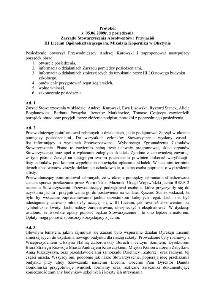 Protokół z 05.06.2009r. z posiedzenia Zarządu Stowarzyszenia Absolwentów i Przyjaciół III Liceum Ogólnokształcącego im. Mikołaja Kopernika w Olsztynie Posiedzenie otworzył Przewodniczący Andrzej Kurowski i zaproponował następujący porządek obrad: 1. otwarcie posiedzenia, 2. informacja o działaniach Zarządu pomiędzy posiedzeniami, 3. informacja o działaniach zmierzających do uzyskania przez III LO nowego budynku szkolnego, 4. omówienie przygotowań regat żeglarskich, 5. wolne wnioski, 6. zakończenie posiedzenia. Ad. 1. Zarząd Stowarzyszenia w składzie: Andrzej Kurowski, Ewa Lisowska, Ryszard Stanek, Alicja Bogdanowicz, Barbara Powązka, Ireneusz Markiewicz, Tomasz Czajczyc zatwierdzili porządek obrad oraz przyjęli, przez złożenie podpisu, protokół z poprzedniego posiedzenia. Ad. 2 Przewodniczący poinformował zebranych o działaniach, jakie podejmował Zarząd w okresie pomiędzy posiedzeniami. Do wszystkich członków Stowarzyszenia wysłany został list informujący o wynikach Sprawozdawczo– Wyborczego Zgromadzenia Członków Stowarzyszenia. Pismo to zawierało pełną treść uchwały programowej, skład organów Stowarzyszenia oraz apel o wpłacanie zaległych składek. Zgodnie z zapowiedzią zawartą w tym piśmie Zarząd na następnym swoim posiedzeniu powinien dokonać weryfikacji listy członków pod kontem wypełniania obowiązku opłacania składek. W ostatnim terminie dwóch absolwentów złożyło deklaracje członkowskie, a jedna osoba poprosiła o wykreślenie z listy. Przewodniczący poinformował zebranych, że w okresie pomiędzy zebraniami sfinalizowana została sprawa przekazania przez Warmińsko– Mazurski Urząd Wojewódzki jachtu BEZA 2 naszemu Stowarzyszeniu. Przewodniczący podziękował osobom, które przyczyniły się do uzyskania jachtu i przygotowania go do postawienia na wodzie. Ryszard Stanek wskazał, że było by wskazane zaprezentowanie jachtu uczestnikom kolejnych regat. Jacht ma być udostępniany zarówno młodzieży uczącej się w III Liceum, jak również absolwentom za symboliczne kwoty. Jacht należy zarejestrować, ubezpieczyć i eksploatować. W dyskusji ustalono, że wszelkie opłaty ponosić będzie Stowarzyszenie i to ono będzie armatorem. Opłaty mogą ponosić sponsorzy korzystający z jachtu. Ad. 3 Głównym tematem, jakim zajmował się Zarząd było wspieranie działań Dyrekcji Liceum zmierzających do uzyskania nowego budynku dla naszej szkoły. Prowadzone były rozmowy z Wiceprezydentem Olsztyna Haliną Zaborowską- Boruch i Jerzym Szmitem, Dyrektorem Biura Strategii Rozwoju Miasta Andrzejem Krawczykiem, Miejski Konserwatorem Zabytków Anną Juszczyszyn, oraz przedstawicielami samorządu Dzielnicy „Zatorze” oraz radnymi tej części miasta. Wszyscy oni, podobnie jak nasze Stowarzyszenie, popierają ideę przekazania budynku przy ulicy Szewczenki naszemu Liceum. Obecnie Pani Dyrektor Danuta Gomolińska przygotowuje wniosek formalny oraz rozliczne załączniki dokumentujące konieczność zamiany budynków szkolnych i koszty ich utrzymania. Ad. 4 Przechodząc do regat żeglarskich przypomniano, że odbędą się one już po raz ósmy. Przez pierwsze cztery lata w wyścigach na Omegach uczestniczyli jedynie uczniowie i absolwenci trzech najstarszych liceów Miasta Olsztyn. Od piątych zawodów współzawodnictwo ma charakter otwarty. Młodzież ze szkół ponadgimnazjalnych walczy o puchar Prezydenta Olsztyna, a absolwenci o puchar ofiarowany przez Żeglarza Jana Jakowickiego. Ustalono, że w bieżącym roku nasze Liceum będzie reprezentowane przez następujących absolwentów Mirosława Witkowskiego- sternika, Ryszarda Stanka, Jerzego Kurowskiego oraz Jacka Michalca. Ciesząc się ze współzawodnictwa należy dążyć zwycięstwa. Ustalono, że Tomek Czajczyc wraz z ojcem przy wsparcia Przewodniczącego w dniu zawodów przygotują jacht i już bez tego ostatniego dopłyną do plaży miejskiej. Pozwoli to na zaprezentowanie naszego nowego nabytku i zachęci młodzież do korzystania z BEZA 2. Ad. 5-6 W wolnych wnioskach zaproponowano, aby podobnie jak w latach poprzednich nie rezygnować ze spotkań w okresie wakacji. Powinny one mieć miejsce przy okazji odwiedzin naszego miasta przez zaprzyjaźnionych absolwentów, którzy wykażą zainteresowanie spotkaniem z dawnymi kolegami i przyjaciółmi. Ostatnią poruszoną sprawą był rejs żeglarski, jaki planowany jest na ostatni weekend wakacji. Tym razem planujemy żeglować po Jezioraku z możliwością nocowania w Kurce Wodnej. Mamy nadzieję, że w tym roku liczba uczestników będzie wyższa, a do wyjazdu przyłączą się nowe osoby. Zapraszamy! Na zgłoszenia oczekujemy do końca lipca 2009r. Przewodniczący Wiceprzewodniczący Sekretarz Skarbik Andrzej Kurowski Ewa Lisowska Barbara Powązka Alicja Bogdanowicz Członkowie Tomasz Czajczyc Ireneusz Markiewicz Ryszard Stanek