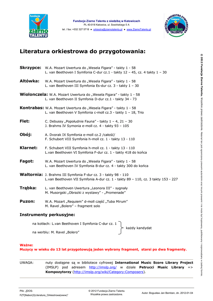 Fundacja Ziarno Talentu z siedzibą w Katowicach PL 40-018 Katowice, ul. Sowińskiego 5 A tel. / fax: +032 327 5718 ● [email protected] ● www.ZiarnoTalentu.pl Skrzypce: W.A. Mozart Uwertura do „Wesela Figara” - takty 1 - 58 L. van Beethoven I Symfonia C-dur cz.1 - takty 12 – 45, cz. 4 takty 1 – 30 Altówka: W.A. Mozart Uwertura do „Wesela Figara” - takty 1 - 58 L. van Beethoven III Symfonia Es-dur cz. 3 - takty 1 – 30 Wiolonczela: W.A. Mozart Uwertura do „Wesela Figara” - takty 1 - 58 L. van Beethoven II Symfonia D-dur cz.1 - takty 34 - 73 Kontrabas: W.A. Mozart Uwertura do „Wesela Figara” - takty 1 - 58 L. van Beethoven V Symfonia c-moll cz.3 - takty 1 – 18, Trio Flet: C. Debussy „Popołudnie Fauna” - takty 1 – 4, 21 – 30 J. Brahms IV Symonia e-moll cz. 4 - takty 93 – 105 Obój: A. Dvorak IX Symfonia e-moll cz.2 /całość/ F. Schubert VIII Symfonia h-moll cz. 1 - takty 13 - 110 Klarnet: F. Schubert VIII Symfonia h-moll cz. 1 - takty 13 - 110 L.van Beethoven VI Symfonia F-dur cz. 1 - takty 418 do końca Fagot: W.A. Mozart Uwertura do „Wesela Figara” - takty 1 - 58 L. van Beethoven IV Symfonia B-dur cz. 4 - takty 300 do końca Waltornia: J. Brahms III Symfonia F-dur cz. 3 - takty 98 - 110 L.van Beethoven VII Symfonia A-dur cz. 1 - takty 89 – 110, cz. 3 takty 153 - 227 Trąbka: L. van Beethoven Uwertura „Leonora III” - sygnały M. Musorgski „Obrazki z wystawy” - „Promenade” Puzon: W.A. Mozart „Requiem” d-moll część „Tuba Mirum” M. Ravel „Bolero” – fragment solo Instrumenty perkusyjne: na kotłach: L.van Beethoven I Symfonia C-dur cz. 1 każdy kandydat na werblu: M. Ravel „Bolero” Ważne: Muzycy w wieku do 13 lat przygotowują jeden wybrany fragment, starsi po dwa fragmenty. UWAGA: nuty dostępne są w bibliotece cyfrowej International Music Score Library Project (IMSLP) pod adresem http://imslp.org/ w dziale Petrucci Music Library => Kompozytorzy (http://imslp.org/wiki/Category:Composers). Plik: „[DOSFZT]Nabor(2)Literatura_Orkiestrowa(www)” © 2012 Fundacja Ziarno Talentu Wszelkie prawa zastrzeżone. Autor: Bogusław Jan Bemben, dn. 2012-01-04 © 2012 Fundacja Ziarno Talentu. Wszelkie prawa zastrzeżone. Materiał ten jest ograniczony prawami autorskimi oraz innymi prawami i nie może być kopiowany, publikowany i rozprowadzany w żadnej formie. Literatura orkiestrowa do przygotowania: