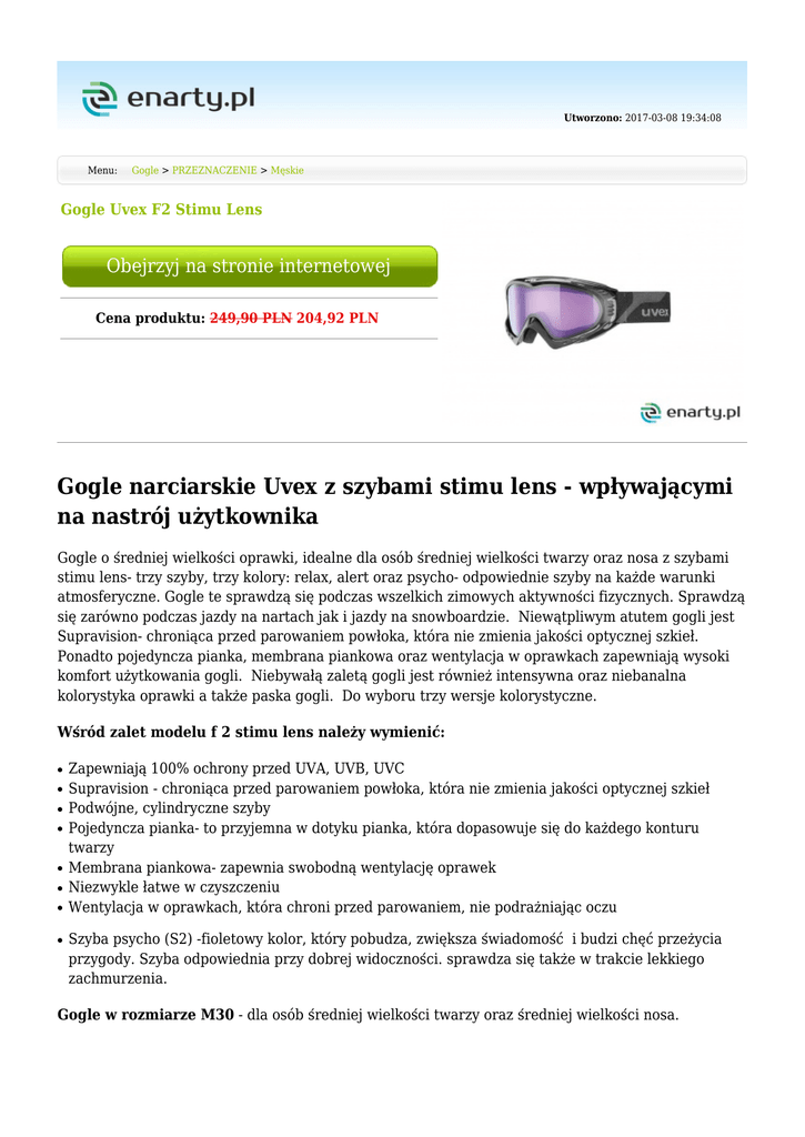 Utworzono: 2017-03-08 19:34:08 Menu: Gogle > PRZEZNACZENIE > Męskie Gogle Uvex F2 Stimu Lens Obejrzyj na stronie internetowej Cena produktu: 249,90 PLN 204,92 PLN Gogle narciarskie Uvex z szybami stimu lens - wpływającymi na nastrój użytkownika Gogle o średniej wielkości oprawki, idealne dla osób średniej wielkości twarzy oraz nosa z szybami stimu lens- trzy szyby, trzy kolory: relax, alert oraz psycho- odpowiednie szyby na każde warunki atmosferyczne. Gogle te sprawdzą się podczas wszelkich zimowych aktywności fizycznych. Sprawdzą się zarówno podczas jazdy na nartach jak i jazdy na snowboardzie. Niewątpliwym atutem gogli jest Supravision- chroniąca przed parowaniem powłoka, która nie zmienia jakości optycznej szkieł. Ponadto pojedyncza pianka, membrana piankowa oraz wentylacja w oprawkach zapewniają wysoki komfort użytkowania gogli. Niebywałą zaletą gogli jest również intensywna oraz niebanalna kolorystyka oprawki a także paska gogli. Do wyboru trzy wersje kolorystyczne. Wśród zalet modelu f 2 stimu lens należy wymienić: ● ● ● ● ● ● ● ● Zapewniają 100% ochrony przed UVA, UVB, UVC Supravision - chroniąca przed parowaniem powłoka, która nie zmienia jakości optycznej szkieł Podwójne, cylindryczne szyby Pojedyncza pianka- to przyjemna w dotyku pianka, która dopasowuje się do każdego konturu twarzy Membrana piankowa- zapewnia swobodną wentylację oprawek Niezwykle łatwe w czyszczeniu Wentylacja w oprawkach, która chroni przed parowaniem, nie podrażniając oczu Szyba psycho (S2) -fioletowy kolor, który pobudza, zwiększa świadomość i budzi chęć przeżycia przygody. Szyba odpowiednia przy dobrej widoczności. sprawdza się także w trakcie lekkiego zachmurzenia. Gogle w rozmiarze M30 - dla osób średniej wielkości twarzy oraz średniej wielkości nosa. Producent Uvex Przeznaczenie Ochrona UV Męskie, Damskie S2 Rodzaj Snowboardowe, Narciarskie Kolor Czarny_#000000 Adres: www.erowery.pl [email protected] Adres: www.enarty.pl Telefon: 605 515 185, 34 361 16 71 Email: [email protected] Email: