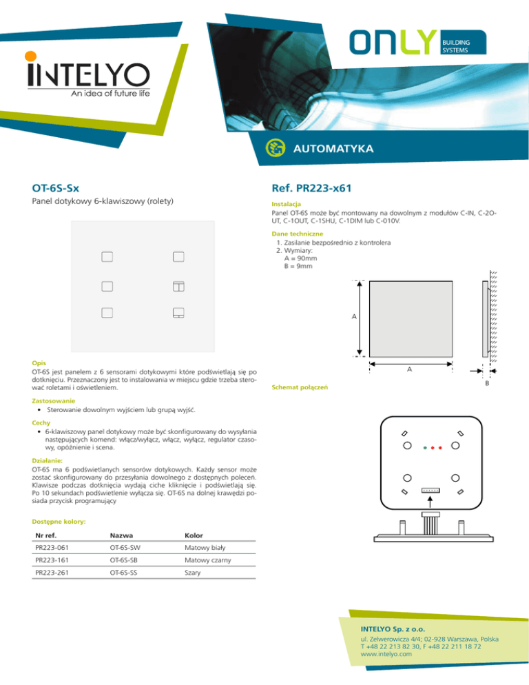 AUTOMATYKA OT-6S-Sx Ref. PR223-x61 Panel dotykowy 6-klawiszowy (rolety) Instalacja Panel OT-6S może być montowany na dowolnym z modułów C-IN, C-2OUT, C-1OUT, C-1SHU, C-1DIM lub C-010V. Dane techniczne 1.Zasilanie bezpośrednio z kontrolera 2.Wymiary: A = 90mm B = 9mm A Opis OT-6S jest panelem z 6 sensorami dotykowymi które podświetlają się po dotknięciu. Przeznaczony jest to instalowania w miejscu gdzie trzeba sterować roletami i oświetleniem. A B Schemat połączeń Zastosowanie • Sterowanie dowolnym wyjściem lub grupą wyjść. Cechy • 6-klawiszowy panel dotykowy może być skonfigurowany do wysyłania następujących komend: włącz/wyłącz, włącz, wyłącz, regulator czaso wy, opóźnienie i scena. Działanie: OT-6S ma 6 podświetlanych sensorów dotykowych. Każdy sensor może zostać skonfigurowany do przesyłania dowolnego z dostępnych poleceń. Klawisze podczas dotknięcia wydają ciche kliknięcie i podświetlają się. Po 10 sekundach podświetlenie wyłącza się. OT-6S na dolnej krawędzi posiada przycisk programujący …… Dostępne kolory: Nr ref. Nazwa Kolor PR223-061 OT-6S-SW Matowy biały PR223-161 OT-6S-SB Matowy czarny PR223-261 OT-6S-SS Szary INTELYO Sp. z o.o. ul. Zelwerowicza 4/4; 02-928 Warszawa, Polska T +48 22 213 82 30, F +48 22 211 18 72 www.intelyo.com