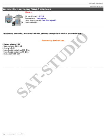Informacje o produkcie Utworzono 08-03-2017 Wzmacniacz antenowy SWA-9 obudowa Cena : Nr katalogowy : 4134 Dostępność : Dostępny Stan magazynowy : bardzo wysoki Średnia ocena : IO Zabudowany wzmacniacz antenowy SWA-9ob, polecany szczególnie do odbioru programów DVB-T. Parametry techniczne ● ● ● ● SA T- ST U ● Kanały odbioru 1-69 Wzmocnienie 22-30 dB Szumy 1,6 dB Impedancja wejściowa 300 Ohm Impedancja wyjściowa 75 Ohm Zasilanie DC 10-15 V D ● Wygenerowano w programie www.oscGold.com