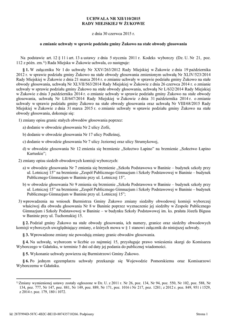 UCHWAŁA NR XII/110/2015 RADY MIEJSKIEJ W ŻUKOWIE z dnia 30 czerwca 2015 r. o zmianie uchwały w sprawie podziału gminy Żukowo na stałe obwody głosowania Na podstawie art. 12 § 11 i art. 13 a ustawy z dnia 5 stycznia 2011 r. Kodeks wyborczy (Dz. U. Nr 21, poz. 112 z późn. zm.1)) Rada Miejska w Żukowie uchwala, co następuje: § 1. W załączniku Nr 1 do uchwały Nr XXV/263/2012 Rady Miejskiej w Żukowie z dnia 19 października 2012 r. w sprawie podziału gminy Żukowo na stałe obwody głosowania zmienionym uchwałą Nr XLIV/523/2014 Rady Miejskiej w Żukowie z dnia 21 marca 2014 r. o zmianie uchwały w sprawie podziału gminy Żukowo na stałe obwody głosowania, uchwałą Nr XLVII/563/2014 Rady Miejskiej w Żukowie z dnia 26 czerwca 2014 r. o zmianie uchwały w sprawie podziału gminy Żukowo na stałe obwody głosowania, uchwałą Nr L/632/2014 Rady Miejskiej w Żukowie z dnia 3 października 2014 r. o zmianie uchwały w sprawie podziału gminy Żukowo na stałe obwody głosowania, uchwałą Nr LII/647/2014 Rady Miejskiej w Żukowie z dnia 31 października 2014 r. o zmianie uchwały w sprawie podziału gminy Żukowo na stałe obwody głosowania oraz uchwałą Nr VIII/68/2015 Rady Miejskiej w Żukowie z dnia 31 marca 2015 r. o zmianie uchwały w sprawie podziału gminy Żukowo na stałe obwody głosowania, dokonuje się: 1) zmiany opisu granic stałych obwodów głosowania poprzez: a) dodanie w obwodzie głosowania Nr 2 ulicy Zofii, b) dodanie w obwodzie głosowania Nr 17 ulicy Podleśnej, c) dodanie w obwodzie głosowania Nr 7 ulicy Jeziornej oraz ulicy Strumykowej, d) w obwodzie głosowania Nr 12 zmienia się brzmienie „Sołectwo Łapino” na brzmienie „Sołectwo Łapino Kartuskie”; 2) zmiany opisu siedzib obwodowych komisji wyborczych: a) w obwodzie głosowania Nr 7 zmienia się brzmienie „Szkoła Podstawowa w Baninie – budynek szkoły przy ul. Lotniczej 15” na brzmienie „Zespół Publicznego Gimnazjum i Szkoły Podstawowej w Baninie – budynek Publicznego Gimnazjum w Baninie przy ul. Lotniczej 15”, b) w obwodzie głosowania Nr 9 zmienia się brzmienie „Szkoła Podstawowa w Baninie – budynek szkoły przy ul. Lotniczej 15” na brzmienie „Zespół Publicznego Gimnazjum i Szkoły Podstawowej w Baninie – budynek Publicznego Gimnazjum w Baninie przy ul. Lotniczej 15”; 3) wprowadzenia na wniosek Burmistrza Gminy Żukowo zmiany siedziby obwodowej komisji wyborczej właściwej dla obwodu głosowania Nr 8 w Baninie poprzez wyznaczenie jej siedziby w Zespole Publicznego Gimnazjum i Szkoły Podstawowej w Baninie – w budynku Szkoły Podstawowej im. ks. prałata Józefa Bigusa w Baninie przy ul. Tuchomskiej 15. § 2. Podział gminy Żukowo na stałe obwody głosowania, ich numery, granice oraz siedziby obwodowych komisji wyborczych uwzględniający zmiany, o których mowa w § 1 stanowi załącznik do niniejszej uchwały. § 3. Wprowadzone zmiany nie powodują zmiany granic obwodów głosowania. § 4. Na uchwałę, wyborcom w liczbie co najmniej 15, przysługuje prawo wniesienia skargi do Komisarza Wyborczego w Gdańsku, w terminie 5 dni od daty jej podania do publicznej wiadomości. § 5. Wykonanie uchwały powierza się Burmistrzowi Gminy Żukowo. § 6. Po jednym egzemplarzu uchwały przekazuje się Wojewodzie Pomorskiemu oraz Komisarzowi Wyborczemu w Gdańsku. 1) Zmiany wymienionej ustawy zostały ogłoszone w Dz. U. z 2011 r. Nr 26, poz. 134, Nr 94, poz. 550, Nr 102, poz. 588, Nr 134, poz. 777, Nr 147, poz. 881, Nr 149, poz. 889, Nr 171, poz. 1016 i Nr 217, poz. 1281; z 2012 r. poz. 849, 951 i 1529, z 2014 r. poz. 179, 180 i 1072. Id: 287F994D-587C-4B2C-BE1D-807435710266. Podpisany Strona 1 § 7. Uchwała wchodzi w życie z dniem podjęcia i podlega ogłoszeniu w Dzienniku Urzędowym Województwa Pomorskiego oraz podaniu do publicznej wiadomości w Biuletynie Informacji Publicznej i na gminnych tablicach ogłoszeń. Przewodniczący Rady Miejskiej w Żukowie Witold Szmidtke Id: 287F994D-587C-4B2C-BE1D-807435710266. Podpisany Strona 2 Załącznik do Uchwały Nr XII/110/2015 Rady Miejskiej w Żukowie z dnia 30 czerwca 2015 r. Podział gminy Żukowo na stałe obwody głosowania, ich numery, granice oraz siedziby obwodowych komisji wyborczych Numer obwodu głosowania 1 Granice obwodu głosowania Siedziba Obwodowej Komisji Wyborczej Zespół Publicznego Gimnazjum w Chwaszczynie i Szkoły Podstawowej w Chwaszczynie ul. Mickiewicza 16 3 Część SOŁECTWA CHWASZCZYNO: Część miejscowości CHWASZCZYNO – ulice: Abrahama, Boczna, Brylantowa, Bursztynowa, Ceynowy, Dąbrówki, Diamentowa, Dobrzewińska, Ekologiczna, Gdyńska, Jeziorna, Juliana Tuwima, część ul. Kaszubska Droga numery nieparzyste od nr 1 do nr 23 i numery parzyste od nr 2 do nr 22, Krótka, ks. Kuppera, ks. Sarnowskiego, Kwiatowa, Lisia, Łąkowa, Ogrodowa, Oliwska, Orzeszkowej, Polna, Poprzeczna, Prusa, Radarowa, Rewerenda, Rubinowa, Rzemieślników, Szafirowa, Szmaragdowa, św. Wojciecha, Telesfora, Telewizyjna, Teodora, Tuchomska, Węglowa, Wiczlińska, Wiejska, Wybickiego, Zbożowa, Złota, Zofii Nałkowskiej. Część SOŁECTWA CHWASZCZYNO: Część miejscowości CHWASZCZYNO – ulice: Adama Asnyka, Akacjowa, Białe Żagle, Błażeja, Błotna, Bogusława, Bolesława Leśmiana, Brzechwy, Brzozowa, Chopina, Cicha, Damroki, Derdowskiego, Dookoła Świata, Fredry, Jadwigi, Jana Pawła II, Jaromira, Jarzębinowa, K.I.Gałczyńskiego, Kamienna, Kasztanowa, część ul. Kaszubska Droga numery nieparzyste od nr 25 do końca i numery parzyste od nr 24 do końca, Katarzyny, Kawelska, Klonowa, Kochanowskiego, Konopnickiej, Kopalniana, Krasickiego, ks. Sychty, Leopolda Staffa, Leśna, Majkowskiego, Makuszyńskiego, Małgorzaty, Mickiewicza, Miła, Mirosławy, Moniuszki, Mściwoja I, Norwida, Olimpijska, Piaskowa, Podleśna, Przemysława, Racibora, Reja, Sambora I, Sienkiewicza, Słoneczna, Słowackiego, Sobiesława I, Spacerowa, Spokojna, Szczęśliwa, Szymanowskiego, Świerkowa, Świętobora, Świ