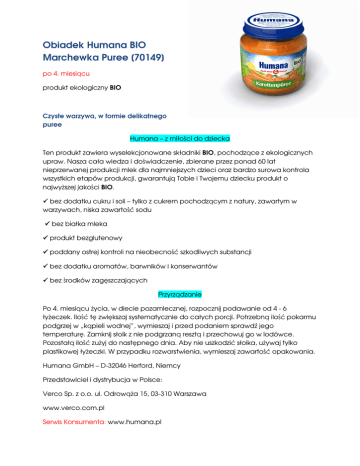 Obiadek Humana BIO Marchewka Puree [70149] po 4. miesi cu produkt ekologiczny BIO Czyste warzywa, w formie delikatnego puree Humana – z miło ci do dziecka Ten produkt zawiera wyselekcjonowane składniki BIO, pochodz ce z ekologicznych upraw. Nasza cała wiedza i do wiadczenie, zbierane przez ponad 60 lat nieprzerwanej produkcji mlek dla najmniejszych dzieci oraz bardzo surowa kontrola wszystkich etapów produkcji, gwarantuj Tobie i Twojemu dziecku produkt o najwy szej jako ci BIO. bez dodatku cukru i soli – tylko z cukrem pochodz cym z natury, zawartym w warzywach, niska zawarto sodu bez białka mleka produkt bezglutenowy poddany ostrej kontroli na nieobecno szkodliwych substancji bez dodatku aromatów, barwników i konserwantów bez rodków zag szczaj cych Przyrz dzanie Po 4. miesi cu ycia, w diecie pozamlecznej, rozpocznij podawanie od 4 - 6 ły eczek. Ilo t zwi kszaj systematycznie do całych porcji. Potrzebn ilo pokarmu podgrzej w „k pieli wodnej”, wymieszaj i przed podaniem sprawd jego temperatur . Zamknij słoik z nie podgrzan reszt i przechowuj go w lodówce. Pozostał ilo zu yj do nast pnego dnia. Aby nie uszkodzi słoika, u ywaj tylko plastikowej ły eczki. W przypadku rozwarstwienia, wymieszaj zawarto opakowania. Humana GmbH – D-32046 Herford, Niemcy Przedstawiciel i dystrybucja w Polsce: Verco Sp. z o.o. ul. Odrow a 15, 03-310 Warszawa www.verco.com.pl Serwis Konsumenta: www.humana.pl [email protected] tel. 22 523 23 33 Skład rednia zawarto Warto energetyczna na 100 g kJ 120 na słoik 150 kcal 29 36 Białko g 0,9 1,1 W glowodany g 4,2 5,2 w tym cukry g 4,2 5,2 Tłuszcz g 0,2 0,2 w tym nasycone kwasy tłuszczowe g 0,04 0,04 Błonnik pokarmowy g 3,2 3,9 Sód g 0,05 0,07 Składniki: 87% marchew*, woda * z biologicznie kontrolowanych upraw, kontrolowane stanowisko ekologiczne - DE-007 Przechowywa w chłodnym i suchym miejscu Nale y spo y do: patrz brzeg pokrywki Zawarto 125 g e