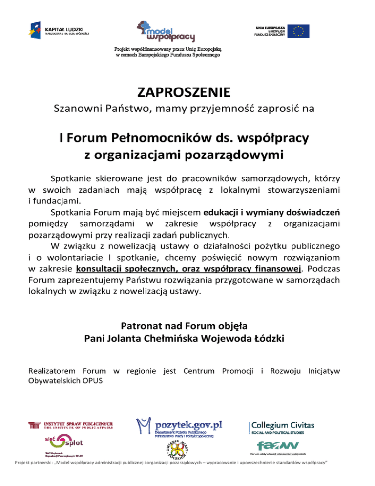 ZAPROSZENIE Szanowni Państwo, mamy przyjemność zaprosić na I Forum Pełnomocników ds. współpracy z organizacjami pozarządowymi Spotkanie skierowane jest do pracowników samorządowych, którzy w swoich zadaniach mają współpracę z lokalnymi stowarzyszeniami i fundacjami. Spotkania Forum mają być miejscem edukacji i wymiany doświadczeń pomiędzy samorządami w zakresie współpracy z organizacjami pozarządowymi przy realizacji zadań publicznych. W związku z nowelizacją ustawy o działalności pożytku publicznego i o wolontariacie I spotkanie, chcemy poświęcić nowym rozwiązaniom w zakresie konsultacji społecznych, oraz współpracy finansowej. Podczas Forum zaprezentujemy Państwu rozwiązania przygotowane w samorządach lokalnych w związku z nowelizacją ustawy. Patronat nad Forum objęła Pani Jolanta Chełmińska Wojewoda Łódzki Realizatorem Forum w regionie jest Centrum Promocji i Rozwoju Inicjatyw Obywatelskich OPUS Projekt partnerski: „Model współpracy administracji publicznej i organizacji pozarządowych – wypracowanie i upowszechnienie standardów współpracy” Program Forum Pełnomocników ds. współpracy z organizacjami pozarządowymi Łódź, 23 czerwca 2010 r. Łódzki Dom Kultury, ul. Gen R.Traugutta 18 10.00 – 10.15: Powitanie uczestników- p. Jolanta Chełmińska Wojewoda Łódzki 10.15 -10.30: Przedstawienie działań i celów projektu systemowego „Model współpracy administracji publicznej i organizacji pozarządowych – wypracowanie i upowszechnienie standardów współpracy” 10.30 – 11.00: w woj. łódzkim – pozarządowymi Współpraca administracji rządowej z organizacjami pozarządowymi przedstawienie załoŜeń współpracy Urzędu Wojewódzkiego z organizacjami 11.00 – 11.10: przerwa kawowa 11.10 – 11.30: prezentacja filmu pt. „Forum Pełnomocników” (powstałego w ramach projektu „Na rzecz aktywnej współpracy” realizowanego przez Elbląskie Stowarzyszenie Wspierania Inicjatyw Pozarządowych) 11.30 – 12.30: Zmiany w ustawie o działalności poŜytku publicznego i wolontariacie: praktyczne konstruowanie aktów prawnych cz. I - konsultacje społeczne, jak prowadzić konsultacje społeczne z organizacjami pozarządowymi – prezentacja rozwiązań lokalnych na bazie zapisów ustawy o działalności poŜytku publicznego i o wolontariacie 12.30 – 13.00: poczęstunek 13.00 – 14.00: Zmiany w ustawie o działalności poŜytku publicznego i wolontariacie: praktyczne konstruowanie aktów prawnych cz. II - współpraca finansowa przy realizacji zadań publicznych: tryb uproszczony i konkursowy, udział organizacji w komisjach konkursowych, inicjatywa lokalna 14.00 – 14.15: podsumowanie warsztatów – dyskusja 14.15 – 14.30: Oferta działań wspierających Forum w ramach projektu „MOJA POLIS interaktywny system monitoringu partnerstwa lokalnego i aktywnych wspólnot lokalnych”. 14.30: zakończenie Forum Realizatorzy działań w regionie: Centrum Promocji i Rozwoju Inicjatyw Obywatelskich OPUS Patronat honorowy nad Forum objęła p. Jolanta Chełmińska Wojewoda Łódzki Projekt partnerski: „Model współpracy administracji publicznej i organizacji pozarządowych – wypracowanie i upowszechnienie standardów współpracy” Zgłoszenie na I Forum Pełnomocników ds. współpracy z organizacjami pozarządowymi Dane osobowe Imię i nazwisko Imię i nazwisko Dane teleadresowe urzędu Nazwa: Adres: Adres i nazwa urzędu Miejscowość: Powiat: Województwo: Stacjonarny: Telefon kontaktowy Komórkowy: Faks (z nr kierunkowym) Bezpośredni adres e-mail W razie pytań prosimy o kontakt z p. Natalią Świniarską z biura Centrum OPUS w Sieradzu pod nr(043) 43 678-64-14 lub e-mail: [email protected] Zgłoszenia prosimy przesyłać do 18 czerwca 2010 r. na adres e-mail: [email protected] lub faxem na nr 042 231-31-02 Projekt partnerski: „Model współpracy administracji publicznej i organizacji pozarządowych – wypracowanie i upowszechnienie standardów współpracy”