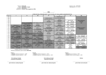 Wydział : Studia : Kierunek : Specjalność : Uchwała z dnia : 22.05.2013 Obowiązuje od : 01.10.2013 Elektroniki Stacjonarne I stopnia Informatyka Systemy i Sieci Komputerowe (ISK) ISK STRUKTURA PROGRAMU NAUCZANIA W UKŁADZIE GODZINOWYM h\sem. 27 26 25 24 23 22 21 20 19 18 17 16 15 14 13 12 11 10 9 8 7 6 5 4 3 2 1 I II III IV Struktury danych i złożoność obliczeniowa 11020 INEK006 Logika układów cyfrowych Podstawy AIR 10200 E 10100 AREW001 INEK001 Teoria systemów Kursy wybieralne grupa A 11000 ETEW008 Programowanie 3h INEK001BK obiektowe Języki programowania 20200 10100 INEK004 N.i d.u.c. 1 10000 INEK005 INEW002 Alg. Lin.2 10000 MAP1152 Podstawy telekomunikacji Fizyka 1.1A 20000 ETEW004 21000 E Podstawy przetwarzania sygnałów FZP1060 Rach.pr. 10000 MAP1151 20100 ETEW010 Matematyka Inżynierskie zastosowania dyskretna statystyki 22000 12000 ETEW009 Fizyka 3.1 00100 FZP2079 MAP3019 Analiza matematyczna Język obcy Blok 1/Blok 2 20000 E MAP1149 Zajecia sportowe 4h 2h Miernictwo 2 00100 ETEW002 Miernictwo 1 20000 ETEW001 Podstawy programowania 21100 INEW001 Grafika inżynierska 11000 ETEW003 Technologie informacyjne 10100 ETEW007 *Wł. 10000 PREW002 Etyka inż.10000 PSEW001 Algebra liniowa z analityczną A 21000 MAP3046 Analiza matematyczna 1.2A 21000 E MAP3045 Filozofia 20000 FLEW001 Kursy wybieralne grupa B 5h E INEK002BK Niez.i diag.ukł.cyfr. 2 00020 INEK007 Bazy danych 1 20200 E INEK008 Technologie sieciowe 1 20200 E INEK009 Podstawy techniki mikroprocesorowej 1 20100 ETEW006 Język obcy Blok 3/Blok 4 4h V Projektowanie efektywnych algorytmów 20110 INEK010 Inżynieria oprogramowania 20200 E INEK011 Grafika komputerowa i komunikacja człowiek – komputer 20200 INEK012 Bazy danych 2 00021 INEK013 Technologie sieciowe 2 10110 INEK014 Urządzenia peryferyjne 10200 INEK015 Systemy operacyjne 1 20000 INEK016 Układy cyfrowe i systemy wbudowane 1 10300 INEK017 VI VII Sieci TCP/IP 00200 INES415 Transmisja danych 10001 INES417 Rozległe sieci komp. 10010 INES416 Zarządzanie projektem informatycznym 10002 E INES404 Bezprzewodowe sieci komputerowe 10110 INES412 Kursy wybieralne grupa C 3h INEK003BK Systemy operacyjne 2 00200 E INEK019 Układy cyfrowe i systemy wbudowane 2 10020 E INEK020 Projekt zespołowy 00040 INES406 Praca dyplomowa INES410 10h Praktyka zawodowa * INEP001Q Techniki światłowodowe 10100 INES407 Projektowanie systemów internetowych i mobilnych 10020 INES405 Bezpieczeństwo sieci komputerowych 20100 INES414 Seminarium dyplomowe 00002 INES409 Podst. zarządz. jakością 20000 ZMZ0340 * Praktyki zawodowe po II lub III roku *Własność intelektualna i prawo autorskie PREW002 Grupa A: 1. INEK002 Architektura komputerów 1 12000 2. INEK023 Arytmetyka komputerów 12000 Grupa B: 1. INEK003 Architektura komputerów 2 20210 2. INEK022 Organizacja i architektura komputerów 20210 Grupa C: 1. INEK018 Sztuczna inteligencja 21000 2. INEK021 Metody sztucznej inteligencji 21000 Przewodniczący Komisji Programowej Specjalności Przewodniczący Komisji Programowej Kierunku Dziekan .................................................................. ................................................................... ............................................................... prof. dr hab. inż. Andrzej Kasprzak prof. dr hab. inż. Andrzej Kasprzak prof. dr hab. inż. Jan Zarzycki Wydział : Studia : Kierunek : Specjalność : Uchwała z dnia : 22.05.2013 Obowiązuje od : 01.10.2013 Elektroniki Stacjonarne I stopnia Informatyka Systemy i Sieci Komputerowe (ISK) ISK STRUKTURA PROGRAMU NAUCZANIA W UKŁADZIE PUNKTOWYM ECTS\ sem. 30 29 28 27 26 25 24 23 22 21 20 19 18 17 16 15 14 13 12 11 10 9 8 7 6 5 4 3 2 1 I Miernictwo 1 4 Podstawy programowania 4 II III IV Podstawy automatyki i robotyki 2 Miernictwo 2 2 Teoria systemów 3 Logika układów cyfrowych 4 Struktury danych i złożoność obliczeniowa 4 Kursy wybieralne grupa A 5 Kursy wybieralne grupa B Programowanie obiektowe Języki programowania 3 Grafika inżynierska 4 6 Technologie informacyjne 2 Własn. int.i praw. aut. 1 Etyka inżynierska 1 Algebra liniowa z geometrią analityczną A 4 Algebra liniowa 2 Niez. i diagn. ukł. cyfr. 1 2 1 5 Matematyka dyskretna 4 Analiza matematyczna 1.2A Rach. Prawdopodob. 1 8 Filozofia 2 Bazy danych 1 Podstawy przetwarzania sygnałów 5 Analiza matematyczna 2.3A 5 Zajęcia sportowe Grupa A: 1. Architektura komputerów 1 2. Arytmetyka komputerów 1 Inżynierskie zastosowania statystyki 5 Fizyka 3.1 2 Język obcy Blok 1/Blok 2 2 Inżynieria oprogramowania 6 Niezawod.i i diagnostyka układów cyfrowych 2 3 Fizyka 1.1 A 5 Projektowanie efektywnych algorytmów 5 6 Podstawy telekomunikacji 2 V Technologie sieciowe 1 6 Podstawy techniki mikroprocesorowej 1 3 Język obcy Blok 3/Blok 4 3 Grupa B: 1. Architektura komputerów 2 2. Organizacja i architektura komputerów Grafika komputerowa i komunikacja człowiek – komputer 4 Bazy danych 2 2 Technologie sieciowe 2 4 Urządzenia peryferyjne 3 Systemy operacyjne 1 3 Układy cyfrowe i systemy wbudowane 1 3 VI VII Sieci TCP/IP 2 Transmisja danych 2 Rozległe sieci komputerowe 2 Zarządzanie projektem informatycznym 5 Bezprzewodowe sieci komputerowe 3 Kursy wybieralne grupa C 3 Systemy operacyjne 2 4 Układy cyfrowe i systemy wbudowane 5 Projekt zespołowy 4 Praca dyplomowa 10 Praktyka zawodowa 6 Techniki światłowodowe 3 Projektowanie systemów internetowych i mobilnych 4 Bezpieczeństwo sieci komputerowych 3 Seminarium dyplomowe 2 Podstawy zarządzania jakością 2 Grupa C: 1. Sztuczna inteligencja 2. Metody sztucznej inteligencji Przewodniczący Komisji Programowej Specjalności Przewodniczący Komisji Programowej Kierunku Dziekan .................................................................. ................................................................... ............................................................... prof. dr hab. inż. Andrzej Kasprzak prof. dr hab. inż. Andrzej Kasprzak prof. dr hab. inż. Jan Zarzycki