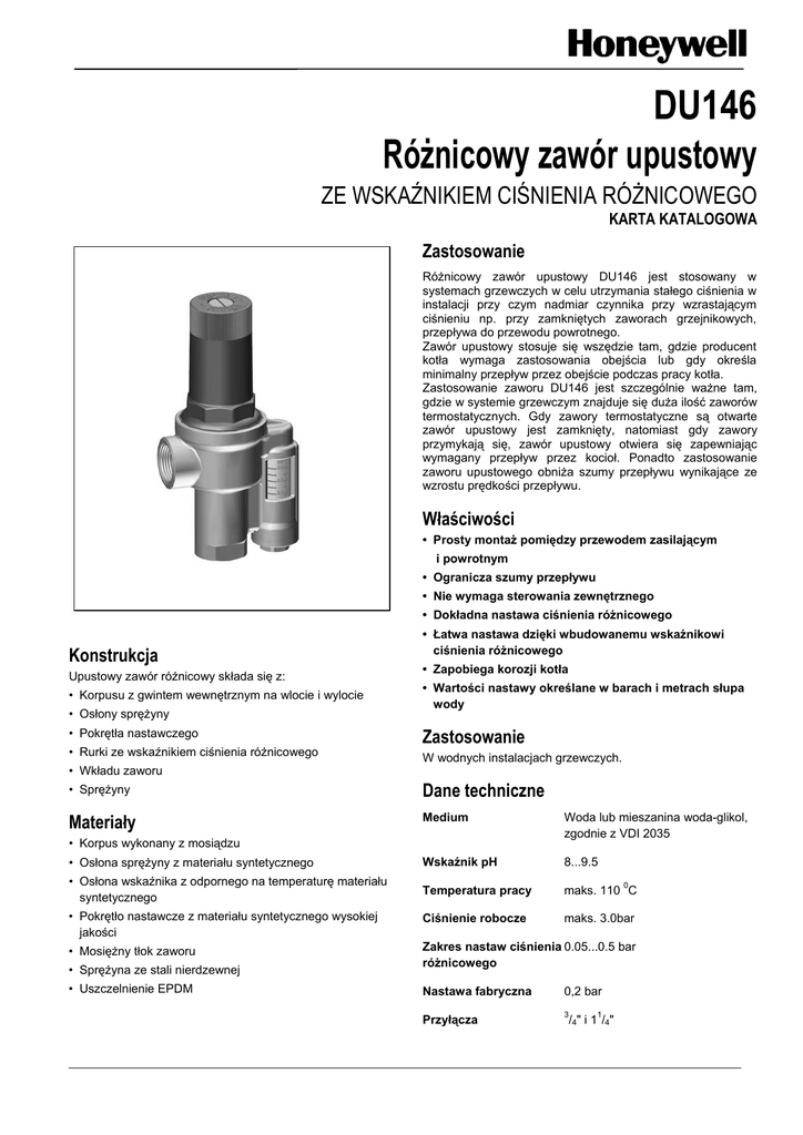 DU146 Różnicowy zawór upustowy ZE WSKAŹNIKIEM CIŚNIENIA RÓŻNICOWEGO KARTA KATALOGOWA Zastosowanie Różnicowy zawór upustowy DU146 jest stosowany w systemach grzewczych w celu utrzymania stałego ciśnienia w instalacji przy czym nadmiar czynnika przy wzrastającym ciśnieniu np. przy zamkniętych zaworach grzejnikowych, przepływa do przewodu powrotnego. Zawór upustowy stosuje się wszędzie tam, gdzie producent kotła wymaga zastosowania obejścia lub gdy określa minimalny przepływ przez obejście podczas pracy kotła. Zastosowanie zaworu DU146 jest szczególnie ważne tam, gdzie w systemie grzewczym znajduje się duża ilość zaworów termostatycznych. Gdy zawory termostatyczne są otwarte zawór upustowy jest zamknięty, natomiast gdy zawory przymykają się, zawór upustowy otwiera się zapewniając wymagany przepływ przez kocioł. Ponadto zastosowanie zaworu upustowego obniża szumy przepływu wynikające ze wzrostu prędkości przepływu. bar 0,5 0,3 0,1 Właściwości • Prosty montaż pomiędzy przewodem zasilającym i powrotnym • Ogranicza szumy przepływu • Nie wymaga sterowania zewnętrznego • Dokładna nastawa ciśnienia różnicowego Konstrukcja Upustowy zawór różnicowy składa się z: • Korpusu z gwintem wewnętrznym na wlocie i wylocie • Osłony sprężyny • Pokrętła nastawczego • Rurki ze wskaźnikiem ciśnienia różnicowego • Wkładu zaworu • Łatwa nastawa dzięki wbudowanemu wskaźnikowi ciśnienia różnicowego • Zapobiega korozji kotła • Wartości nastawy określane w barach i metrach słupa wody Zastosowanie W wodnych instalacjach grzewczych. • Sprężyny Dane techniczne Materiały Medium Woda lub mieszanina woda-glikol, zgodnie z VDI 2035 • Osłona sprężyny z materiału syntetycznego Wskaźnik pH 8...9.5 • Osłona wskaźnika z odpornego na temperaturę materiału syntetycznego Temperatura pracy 0 maks. 110 C • Pokrętło nastawcze z materiału syntetycznego wysokiej jakości Ciśnienie robocze maks. 3.0bar • Mosiężny tłok zaworu Zakres nastaw ciśnienia 0.05...0.5 bar różnicowego • Korpus wykonany z mosiądzu • Sprężyna ze stali nierdzewnej • Uszczelnienie EPDM Nastawa fabryczna 0,2 bar Przyłącza 3 /4" i 11/4" DU146 Różnicowy zawór upustowy Działanie Wymiary Przy równym ciśnieniu pomiędzy przewodem zasilającym a powrotnym zawór jest zamknięty. Grzyb zaworu pod wpływem nacisku sprężyny jest dociskany do gniazda zaworu. Jeśli pomiędzy przewodem zasilającym a powrotny powstanie ciśnienie różnicowe, to wytworzy siłę nacisku w kierunku sprężyny. Wraz ze wzrostem siły nacisku pokonującej siłę sprężyny następuje otwarcie zaworu i pojawi się stały przepływ przez obejście z przewodu zasilającego do powrotnego. W zależności od wielkości nastawy oraz ciśnienia różnicowego przepływ przez obejście pokreślony na diagramach w dalszej części karty. Oznaczenie DU146-...A =Wersja standardowa Specjalne wersje na specjalne zamówienie wielkość przyłącza Rys. 1. Wymiary Tabela 1. Oznaczenia katalogowe i wymiary Wymiary Przyłącze Dla instalacji 90/70 0C katalogowy L I H h kW kcal/godz. /4 " 50 36 160 100 do 70 ok. 60000 DU146-3/4A 1 1 /4 " 58 51 213 155 do 232 ok. 200000 DU146-11/4A 3 Akcesoria Części zamienne Kompletny wskaźnik Wkład zaworu Dla zaworów 3/4“ 0900311 Dla zaworu upustoworóżnicowego DU146. Dla zaworów 1 1/4“ 0900312 Zestaw zawiera: bar 0,5 0,3 0,1 2 Numer Tuleja ze wskaźnikiem, sprężyna, tłoczek wskaźnika i komplet 5 szt. uszczelnień typu O’ring DU146AH-A DU146 Różnicowy zawór upustowy Przykłady zastosowań Rys. 2. DU146 obiegu grzewczym z kotłem wiszącym Rys. 3. DU146 w instalacji grzewczej z zaworem 3-drogowym Rys. 4. DU146 w instalacji grzewczej z zaworem 4-drogowym Uwagi montażowe Zastosowanie • Prosty montaż pomiędzy zasilaniem a powrotem Automatyczne zawory upustowo-różnicowe stosowane są w instalacjach grzewczych do utrzymywania stałego ciśnienia różnicowego oraz do zmniejszenia szumów przepływu. • Bez sterowania zewnętrznego • Nie stosować w instalacjach z węzłami cieplnymi • W celach serwisowych zaleca się zastosowanie zaworów odcinający przed i za zaworem Zawór DU146 może być instalowany w: • instalacjach z 3-drogowym zaworem mieszającym • instalacjach z 4-drogowym zaworem mieszającym • w obiegach grzewczych z kotłami wiszącymi 4 DU146 Różnicowy zawór upustowy Nomogram przepływu p (bar) (m. sł. wody) Δp (bar) 0.6 6 0.5 5 Turns Obroty 14 12 0.4 10 4 8 3 6 0.2 2 4 2 min. 0.1 1 0 0 0.3 0 1 2 3 V (m/h) Rys. 5. DU146 Przepływ dla wielkości przyłącza R3/4 » Δp (bar) p (bar) (m sł. wody) 0.6 6 Turns Obroty 14 0.5 5 0.4 4 0.3 3 0.2 2 0.1 1 0 0 12 10 8 6 4 2 min. 9 10 V (m/h) Rys. 6. DU146 Przepływ dla wielkości przyłącza R11/4" Honeywell sp. z o.o. Ul. Domaniewska 39B 02-672 Warszawa Tel.: 22 6060900, faks 22 6060982 www.honeywell.com.pl/automatyka_domow 4 0 1 2 3 4 5 6 7 8 DU146-k-pl-1rMW0713