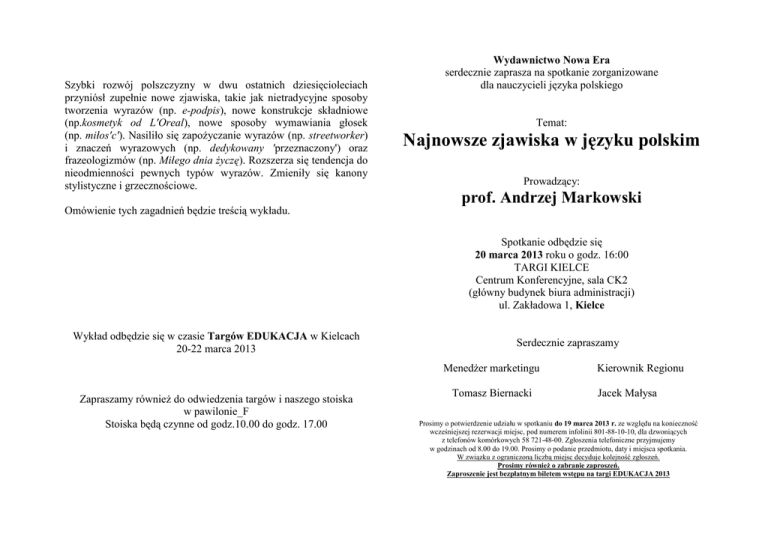 Szybki rozwój polszczyzny w dwu ostatnich dziesięcioleciach przyniósł zupełnie nowe zjawiska, takie jak nietradycyjne sposoby tworzenia wyrazów (np. e-podpis), nowe konstrukcje składniowe (np.kosmetyk od L'Oreal), nowe sposoby wymawiania głosek (np. miłos'c'). Nasiliło się zapożyczanie wyrazów (np. streetworker) i znaczeń wyrazowych (np. dedykowany 'przeznaczony') oraz frazeologizmów (np. Miłego dnia życzę). Rozszerza się tendencja do nieodmienności pewnych typów wyrazów. Zmieniły się kanony stylistyczne i grzecznościowe. Omówienie tych zagadnień będzie treścią wykładu. Wydawnictwo Nowa Era serdecznie zaprasza na spotkanie zorganizowane dla nauczycieli języka polskiego Temat: Najnowsze zjawiska w języku polskim Prowadzący: prof. Andrzej Markowski Spotkanie odbędzie się 20 marca 2013 roku o godz. 16:00 TARGI KIELCE Centrum Konferencyjne, sala CK2 (główny budynek biura administracji) ul. Zakładowa 1, Kielce Wykład odbędzie się w czasie Targów EDUKACJA w Kielcach 20-22 marca 2013 Serdecznie zapraszamy Menedżer marketingu Zapraszamy również do odwiedzenia targów i naszego stoiska w pawilonie_F Stoiska będą czynne od godz.10.00 do godz. 17.00 Tomasz Biernacki Kierownik Regionu Jacek Małysa Prosimy o potwierdzenie udziału w spotkaniu do 19 marca 2013 r. ze względu na konieczność wcześniejszej rezerwacji miejsc, pod numerem infolinii 801-88-10-10, dla dzwoniących z telefonów komórkowych 58 721-48-00. Zgłoszenia telefoniczne przyjmujemy w godzinach od 8.00 do 19.00. Prosimy o podanie przedmiotu, daty i miejsca spotkania. W związku z ograniczoną liczbą miejsc decyduje kolejność zgłoszeń. Prosimy również o zabranie zaproszeń. Zaproszenie jest bezpłatnym biletem wstępu na targi EDUKACJA 2013
