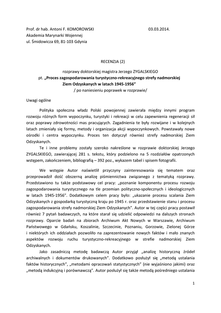 Prof. dr hab. Antoni F. KOMOROWSKI Akademia Marynarki Wojennej ul. Śmidowicza 69, 81-103 Gdynia 03.03.2014. RECENZJA (2) rozprawy doktorskiej magistra Jerzego ZYGALSKIEGO pt. „Proces zagospodarowania turystyczno-rekreacyjnego strefy nadmorskiej Ziem Odzyskanych w latach 1945-1956” / po naniesieniu poprawek w rozprawie/ Uwagi ogólne Polityka społeczna władz Polski powojennej zawierała między innymi program rozwoju różnych form wypoczynku, turystyki i rekreacji w celu zapewnienia regeneracji sił oraz poprawy zdrowotności mas pracujących. Zagadnienia te były rozwijane i w kolejnych latach zmieniały się formy, metody i organizacja akcji wypoczynkowych. Powstawały nowe ośrodki i centra wypoczynku. Proces ten dotyczył również strefy nadmorskiej Ziem Odzyskanych. Te i inne problemy zostały szeroko nakreślone w rozprawie doktorskiej Jerzego ZYGALSKIEGO, zawierającej 281 s. tekstu, który podzielono na 5 rozdziałów opatrzonych wstępem, zakończeniem, bibliografią – 392 poz., wykazem tabel i spisem fotografii. We wstępie Autor naświetlił przyczyny zainteresowania się tematem oraz przeprowadził dość obszerną analizę piśmiennictwa związanego z tematyką rozprawy. Przedstawiono tu także podstawowy cel pracy: „poznanie komponentu procesu rozwoju zagospodarowania turystycznego na tle przemian polityczno-społecznych i ideologicznych w latach 1945-1956”. Dodatkowym celem pracy było: „ukazanie procesu scalania Ziem Odzyskanych z gospodarką turystyczną kraju po 1945 r. oraz przedstawienie stanu i procesu zagospodarowania strefy nadmorskiej Ziem Odzyskanych”. Autor w tej części pracy postawił również 7 pytań badawczych, na które starał się udzielić odpowiedzi na dalszych stronach rozprawy. Oparcie badań na zbiorach Archiwum Akt Nowych w Warszawie, Archiwum Państwowego w Gdańsku, Koszalinie, Szczecinie, Poznaniu, Gorzowie, Zielonej Górze i niektórych ich oddziałach pozwoliło na zaprezentowanie nowych faktów i mało znanych aspektów rozwoju ruchu turystyczno-rekreacyjnego w strefie nadmorskiej Ziem Odzyskanych. Jako zasadniczą metodę badawczą Autor przyjął „analizę historyczną źródeł archiwalnych i dokumentów drukowanych”. Dodatkowo posłużył się „metodą ustalania faktów historycznych”, „metodami opracowań statystycznych” (nie wyjaśniono jakimi) oraz „metodą indukcyjną i porównawczą”. Autor posłużył się także metodą pośredniego ustalania 1 faktów i metodą geograficzną, o których jednak nie informuje wprost. Taki dobór metod badawczych z pewnością pozwolił na osiągnięcie zakładanego celu pracy. W rozdziale pierwszym przedstawiono charakterystykę strefy nadmorskiej Ziem Odzyskanych, gdzie wyjaśniono rys historyczny i zakres terytorialny strefy nadmorskiej oraz zaprezentowano walory klimatyczne, krajoznawcze i wypoczynkowe tej strefy. Rozważania rozdziału kończy dość głęboka analiza struktury ludności omawianej strefy. Autor w tym rozdziale przedstawia poszczególne kwestie szczegółowe cytując poglądy wielu badaczy ale nie zadał sobie trudu uogólnienia i podsumowania tych poglądów oraz nie zaprezentował własnych wniosków z tym związanych. Przykładem cytowań tekstów bez komentarzy są liczne strony pracy. Rozdział drugi, zatytułowany „Uwarunkowania rozwoju turystyki i rekreacji w Polsce po 1945 roku”, analizuje najbardziej istotne elementy, jakie miały wpływ na rozwój turystyki i rekreacji. Jest tu mowa o warunkach, zagrożeniach, wytycznych państwowych dot. zarządzania turystyką, a także o roli związków zawodowych i innych organizacji. W pierwszych dwóch podrozdziałach dokonano oceny zniszczeń wojennych bazy turystycznej, a także dewastacji, szabrownictwa i celowego wywozu wielu elementów tej bazy. Wśród przyczyn takiego stanu rzeczy Autor wymienia niedoskonałość i małą sprawność nowej administracji terenów, zakłopotanie osadników, a także szabrowniczą działalność oddziałów radzieckich, które długo okupowały tereny nadmorskie. Kolejne podrozdziały analizują powstający system zarządzania turystyką i rekreacją na szczeblu centralnym, jego zmiany oraz lokalne rozwiązania w tym zakresie. Autor ocenia, że jedną z przyczyn ograniczenia rozwoju turystyki w strefie nadmorskiej był dekret o ochronie granic państwowych i czasowym pobycie w strefie nadgranicznej, które to dokumenty wprowadziły specjalne zezwolenia na pobyt w konkretnej miejscowości strefy nadgranicznej. Dalsza część rozdziału jest poświęcona analizie rozwiązań „związkowych” w organizacji wypoczynku oraz roli FWP, Orbisu, PTTK w tym systemie. W rozdziale trzecim Autor dokonał oceny systemu odbudowy bazy turystycznorekreacyjnej strefy nadmorskiej Ziem Odzyskanych w latach 1945-1956, wskazując wpływ organizacji państwowych ( Wydziału Turystyki Ministerstwa Komunikacji, Ministerstwa Zdrowia i Ministerstwo Oświaty) i związkowych na organizację i rozwój wypoczynku i turystyki w Polsce. W dalszej części rozdziału przeanalizowano warunki rozwoju infrastruktury turystyczno-rekreacyjnej wskazując nakłady państwowe oraz statystykę wykorzystania bazy wypoczynkowej. Dalsze strony rozdziału pokazują rolę organizacji turystycznych i innych w organizowaniu ruchu turystycznego w strefie nadmorskiej. Rozdział czwarty jest zatytułowany „Zagospodarowanie turystyczne strefy nadmorskiej Ziem Odzyskanych w latach 1945-1956” i zawiera analizę bazy noclegowej, bazy gastronomicznej, systemu komunikacji i łączności, wybranych elementów infrastruktury turystycznej i zasobów ludzkich. Autor zwrócił też uwagę na rolę szkolnictwa różnych 2 poziomów w propagowaniu różnych form turystyki oraz w przygotowaniu kadr turystycznych. Zarówno zebrane dane, jak i przedstawione statystyki świadczą o dokonaniu głębokich analiz w zakresie rozpatrywanych problemów. Prezentowane dane liczbowe mają oparcie w wielu materiałach przytoc