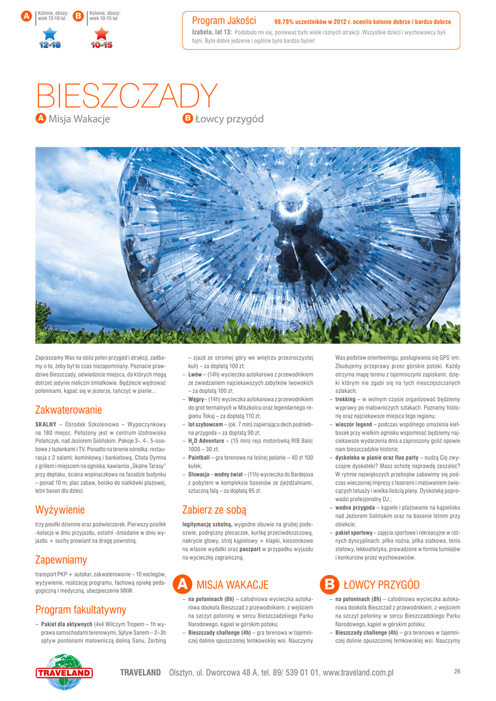 A Kolonie, obozy: wiek 12-18 lat B Kolonie, obozy: wiek 10-15 lat Program Jakości 98,79% uczestników w 2012 r. oceniło kolonie dobrze i bardzo dobrze Izabela, lat 13: Podobało mi się, ponieważ było wiele różnych atrakcji. Wszystkie dzieci i wychowawcy byli fajni. Było dobre jedzenie i ogólnie było bardzo fajnie! BIESZCZADY A B Misja Wakacje Zapraszamy Was na obóz pełen przygód i atrakcji, zadbamy o to, żeby był to czas niezapomniany. Poznacie prawdziwe Bieszczady, odwiedzicie miejsca, do których mogą dotrzeć jedynie nieliczni śmiałkowie. Będziecie wędrować połoninami, kąpać się w jeziorze, tańczyć w pianie... – – Zakwaterowanie Łowcy przygód – zjazd ze stromej góry we wnętrzu przezroczystej kuli) – za dopłatą 100 zł; Lwów – (14h) wycieczka autokarowa z przewodnikiem ze zwiedzaniem najciekawszych zabytków lwowskich – za dopłatą 100 zł; Węgry– (14h) wycieczka autokarowa z przewodnikiem do grot termalnych w Miszkolcu oraz legendarnego regionu Tokaj – za dopłatą 110 zł; lot szybowcem – (ok. 7 min) zapierająca dech podniebna przygoda – za dopłatą 90 zł; H2O Adventure – (15 min) rejs motorówką RIB Balic 1000 – 30 zł; Paintball – gra terenowa na leśnej polanie – 40 zł 100 kulek; Słowacja – wodny świat – (11h) wycieczka do Bardejova z pobytem w kompleksie basenów ze zjeżdżalniami, sztuczną falą – za dopłatą 95 zł. SKALNY – Ośrodek Szkoleniowo – Wypoczynkowy na 180 miejsc. Położony jest w centrum Uzdrowiska Polańczyk, nad Jeziorem Solińskim. Pokoje 3-, 4-, 5-osobowe z łazienkami i TV. Ponadto na terenie ośrodka: restauracja z 2 salami: kominkową i bankietową, Chata Dymna z grillem i miejscem na ogniska, kawiarnia „Skalne Tarasy” przy deptaku, ściana wspinaczkowa na fasadzie budynku – ponad 10 m, plac zabaw, boisko do siatkówki plażowej, letni basen dla dzieci. – Wyżywienie Zabierz ze sobą trzy posiłki dziennie oraz podwieczorek. Pierwszy posiłek -kolacja w dniu przyjazdu, ostatni -śniadanie w dniu wyjazdu + suchy prowiant na drogę powrotną. legitymację szkolną, wygodne obuwie na grubej podeszwie, podręczny plecaczek, kurtkę przeciwdeszczową, nakrycie głowy, strój kąpielowy + klapki, kieszonkowe na własne wydatki oraz paszport w przypadku wyjazdu na wycieczkę zagraniczną. Zapewniamy transport PKP + autokar, zakwaterowanie – 10 noclegów, wyżywienie, realizację programu, fachową opiekę pedagogiczną i medyczną, ubezpieczenie NNW. Program fakultatywny – Pakiet dla aktywnych (4x4 Wilczym Tropem – 1h wyprawa samochodami terenowymi, Spływ Sanem – 2–3h spływ pontonami malowniczą doliną Sanu, Zorbing TRAVELAND – – – A MISJA WAKACJE – na połoninach (8h) – całodniowa wycieczka autokarowa dookoła Bieszczad z przewodnikiem, z wejściem na szczyt połoniny w sercu Bieszczadzkiego Parku Narodowego, kąpiel w górskim potoku; – Bieszczady challenge (4h) – gra terenowa w tajemniczej dolinie opuszczonej łemkowskiej wsi. Nauczymy – – – – – Was podstaw orienteeringu, posługiwania się GPS`em. Zbudujemy przeprawy przez górskie potoki. Każdy otrzyma mapę terenu z tajemniczymi zapiskami, dzięki którym nie zgubi się na tych nieuczęszczanych szlakach; trekking – w wolnym czasie organizować będziemy wyprawy po malowniczych szlakach. Poznamy historię oraz najciekawsze miejsca tego regionu; wieczór legend – podczas wspólnego smażenia kiełbasek przy wielkim ognisku wspominać będziemy najciekawsze wydarzenia dnia a zaproszony gość opowie nam bieszczadzkie historie; dyskoteka w pianie oraz fluo party – nudzą Cię zwyczajne dyskoteki? Masz ochotę naprawdę zaszaleć? W rytmie największych przebojów zabawimy się podczas wieczornej imprezy z laserami i malowaniem świecących tatuaży i wielka ilością piany. Dyskotekę poprowadzi profesjonalny DJ.; wodna przygoda – kąpiele i plażowanie na kąpielisku nad Jeziorem Solińskim oraz na basenie letnim przy obiekcie; pakiet sportowy – zajęcia sportowe i rekreacyjne w różnych dyscyplinach: piłka nożna, piłka siatkowa, tenis stołowy, lekkoatletyka, prowadzone w formie turniejów i konkursów przez wychowawców. B ŁOWCY PRZYGÓD – na połoninach (8h) – całodniowa wycieczka autokarowa dookoła Bieszczad z przewodnikiem, z wejściem na szczyt połoniny w sercu Bieszczadzkiego Parku Narodowego, kąpiel w górskim potoku; – Bieszczady challenge (4h) – gra terenowa w tajemniczej dolinie opuszczonej łemkowskiej wsi. Nauczymy Olsztyn, ul. Dworcowa 48 A, tel. 89/ 539 01 01, www.traveland.com.pl 26