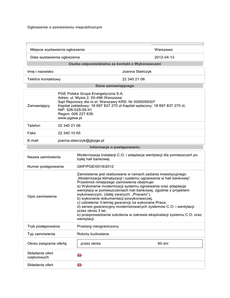 Ogłoszenie o zamówieniu niepublicznym Miejsce wystawienia ogłoszenia Warszawa Data wystawienia ogłoszenia 2012-04-13 Osoba odpowiedzialna za kontakt z Wykonawcami Imię i nazwisko Joanna Stańczyk Telefon kontaktowy 22 340 21 06 Dane zamawiającego Zamawiający PGE Polska Grupa Energetyczna S.A. Adres: ul. Mysia 2, 00-496 Warszawa Sąd Rejonowy dla m.st. Warszawy KRS: Nr 0000059307 Kapitał zakładowy: 18 697 837 270 zł Kapitał wpłacony: 18 697 837 270 zł, NIP: 526-025-05-41 Regon: 006 227 638. www.pgesa.pl Telefon 22 340 21 06 Faks 22 340 10 65 E-mail [email protected] Informacje o postępowaniu Nazwa zamówienia Modernizacja instalacji C.O. i adaptacja wentylacji dla pomieszczeń po byłej hali bankowej Numer postępowania GKP/PGE/0018/2012 Opis zamówienia Zamówienie jest realizowane w ramach zadania inwestycyjnego „Modernizacja klimatyzacji i systemu ogrzewania w hali bankowej”. Przedmiot niniejszego zamówienia obejmuje: a) Wykonanie modernizacji systemu ogrzewania oraz adaptacja wentylacji w pomieszczeniach hali bankowej, zgodnie z projektem wykonawczym, (dalej zwanych: „Pracami”), b) wykonanie dokumentacji powykonawczej, c) udzielenie 3-letniej gwarancji na wykonane Prace, d) serwis gwarancyjny modernizowanych systemów C.O. i wentylacji przez okres 3 lat, e) przeprowadzenie szkolenia w zakresie eksploatacji systemu C.O. oraz wentylacji Tryb postępowania Przetarg nieograniczony Typ zamówienia Roboty budowlane Okres związania ofertą Składanie ofert częściowych Składanie ofert przez okres 60 dni wariantowych W postępowaniu mogą wziąć udział wykonawcy, którzy: a. posiadają uprawnienie do wykonywania określonej działalności lub czynności, jeżeli ustawy nakładają obowiązek posiadania takich uprawnień; b. posiadają niezbędną wiedzę i doświadczenie oraz dysponują potencjałem technicznym i osobami zdolnymi do wykonania zamówienia; c. znajdują się w sytuacji ekonomicznej i finansowej zapewniającej wykonanie zamówienia; d. nie podlegają wykluczeniu z postępowania. Ocena warunków udziału w postępowaniu dokonana zostanie według formuły spełnia-nie spełnia na podstawie dokumentów dostarczonych przez Wykonawcę zgodnie z wykazem określonym w SIWZ. Wymagania: Modernizacja klimatyzacji i systemu ogrzewania w hali bankowej.: KRS - 100,00% US - 100,00% ZUS - 100,00% uprawnienia konstrukcyjno- budowlane - 100,00% uprawnienia elektryczne - 100,00% świadectwo SPE D+E - 100,00% uprawnienia wod-kan - 100,00% doświadczenie - 100,00% ubezpieczenie - 100,00% Informacje o wadium Wadium można wnieść: - pieniądzu na rachunek nr 98 1240 1066 1111 0010 1438 0441 - poręczeniach bankowych lub poręczeniach spółdzielczej kasy oszczędnościowo-kredytowej - gwarancjach bankowych - gwarancjach ubezpieczeniowych - poręczeniach udzielanych przez podmioty, o których mowa w art. 6b ust. 5 pkt. 2 w Ustawie z dnia 09.11.2000 r. o utworzeniu Polskiej Agencji Rozwoju Przedsiębiorczości Kwota wadium: - Modernizacja klimatyzacji i systemu ogrzewania w hali bankowej. 10 000,00 [PLN] Kryteria oceny ofert Modernizacja klimatyzacji i systemu ogrzewania w hali bankowej.: Cena - 85,00% doświadczenie - 15,00% Miejsce składania ofert Ofertę należy złożyć do dnia 08.05.2012r. godz. 14.00 w Kancelarii Głównej (pok. 1) pod adresem ul. Mysia 2, 00-496 Warszawa. Termin składania ofert (dzień, godzina) 2012-05-08 14:00 Miejsce realizacji zamówienia Warszawa Termin wykonania zamówienia 3 miesiące od daty zawarcia umowy Zamawiający przewiduje możliwość zastosowania aukcji Umowa ramowa Dynamiczny system zakupów Informacje o SIWZ Miejsce pobrania SIWZ od poniedziałku do poniedziałku Dni pobrania SIWZ Godziny pobrania SIWZ Opłata za SIWZ Uwagi SIWZ zamieszczony na stronie http://www.pgesa.pl/pl/BIP/Przetargi/Strony/default.aspx
