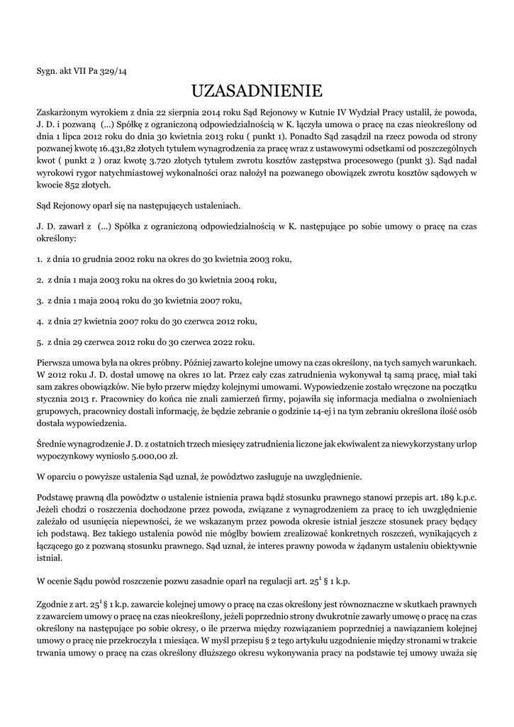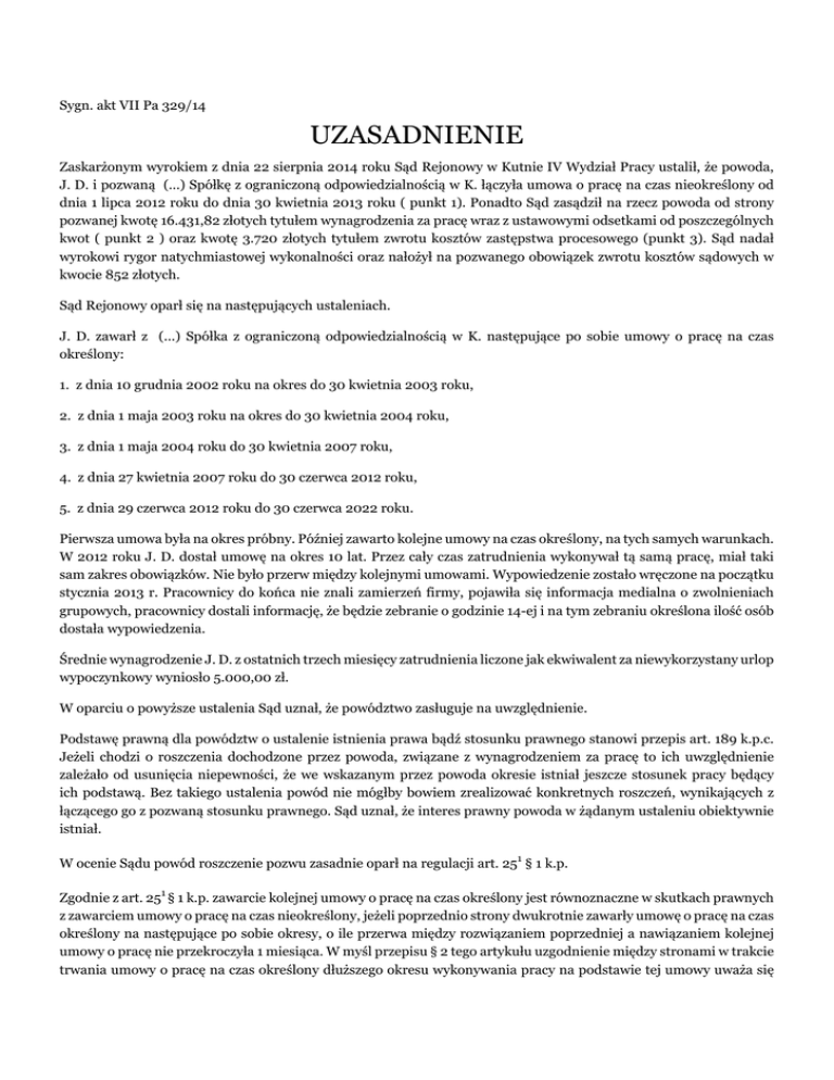Sygn. akt VII Pa 329/14 UZASADNIENIE Zaskarżonym wyrokiem z dnia 22 sierpnia 2014 roku Sąd Rejonowy w Kutnie IV Wydział Pracy ustalił, że powoda, J. D. i pozwaną (...) Spółkę z ograniczoną odpowiedzialnością w K. łączyła umowa o pracę na czas nieokreślony od dnia 1 lipca 2012 roku do dnia 30 kwietnia 2013 roku ( punkt 1). Ponadto Sąd zasądził na rzecz powoda od strony pozwanej kwotę 16.431,82 złotych tytułem wynagrodzenia za pracę wraz z ustawowymi odsetkami od poszczególnych kwot ( punkt 2 ) oraz kwotę 3.720 złotych tytułem zwrotu kosztów zastępstwa procesowego (punkt 3). Sąd nadał wyrokowi rygor natychmiastowej wykonalności oraz nałożył na pozwanego obowiązek zwrotu kosztów sądowych w kwocie 852 złotych. Sąd Rejonowy oparł się na następujących ustaleniach. J. D. zawarł z (...) Spółka z ograniczoną odpowiedzialnością w K. następujące po sobie umowy o pracę na czas określony: 1. z dnia 10 grudnia 2002 roku na okres do 30 kwietnia 2003 roku, 2. z dnia 1 maja 2003 roku na okres do 30 kwietnia 2004 roku, 3. z dnia 1 maja 2004 roku do 30 kwietnia 2007 roku, 4. z dnia 27 kwietnia 2007 roku do 30 czerwca 2012 roku, 5. z dnia 29 czerwca 2012 roku do 30 czerwca 2022 roku. Pierwsza umowa była na okres próbny. Później zawarto kolejne umowy na czas określony, na tych samych warunkach. W 2012 roku J. D. dostał umowę na okres 10 lat. Przez cały czas zatrudnienia wykonywał tą samą pracę, miał taki sam zakres obowiązków. Nie było przerw między kolejnymi umowami. Wypowiedzenie zostało wręczone na początku stycznia 2013 r. Pracownicy do końca nie znali zamierzeń firmy, pojawiła się informacja medialna o zwolnieniach grupowych, pracownicy dostali informację, że będzie zebranie o godzinie 14-ej i na tym zebraniu określona ilość osób dostała wypowiedzenia. Średnie wynagrodzenie J. D. z ostatnich trzech miesięcy zatrudnienia liczone jak ekwiwalent za niewykorzystany urlop wypoczynkowy wyniosło 5.000,00 zł. W oparciu o powyższe ustalenia Sąd uznał, że powództwo zasługuje na uwzględnienie. Podstawę prawną dla powództw o ustalenie istnienia prawa bądź stosunku prawnego stanowi przepis art. 189 k.p.c. Jeżeli chodzi o roszczenia dochodzone przez powoda, związane z wynagrodzeniem za pracę to ich uwzględnienie zależało od usunięcia niepewności, że we wskazanym przez powoda okresie istniał jeszcze stosunek pracy będący ich podstawą. Bez takiego ustalenia powód nie mógłby bowiem zrealizować konkretnych roszczeń, wynikających z łączącego go z pozwaną stosunku prawnego. Sąd uznał, że interes prawny powoda w żądanym ustaleniu obiektywnie istniał. W ocenie Sądu powód roszczenie pozwu zasadnie oparł na regulacji art. 251 § 1 k.p. Zgodnie z art. 251 § 1 k.p. zawarcie kolejnej umowy o pracę na czas określony jest równoznaczne w skutkach prawnych z zawarciem umowy o pracę na czas nieokreślony, jeżeli poprzednio strony dwukrotnie zawarły umowę o pracę na czas określony na następujące po sobie okresy, o ile przerwa między rozwiązaniem poprzedniej a nawiązaniem kolejnej umowy o pracę nie przekroczyła 1 miesiąca. W myśl przepisu § 2 tego artykułu uzgodnienie między stronami w trakcie trwania umowy o pracę na czas określony dłuższego okresu wykonywania pracy na podstawie tej umowy uważa się za zawarcie, od dnia następującego po jej rozwiązaniu, kolejnej umowy o pracę na czas określony w rozumieniu § 1. Przepis art. 251 k.p. zaczął ponownie obowiązywać po okresie zawieszenia z dniem 1 maja 2004 r. Biorąc pod uwagę problemy intertemporalne, występujące w orzecznictwie i podnoszone w piśmiennictwie, w okresie pierwszego funkcjonowania tego przepisu, co do daty początkowej, od której liczone są kolejne umowy na czas określony, z których trzecia jest uważana za umowę zawartą na czas nieokreślony, w art. 15 ustawy nowelizacyjnej z dnia 14 listopada 2003 r. (Dz.U.2003, Nr 213, poz. 2081) postanowiono, że art. 251 k.p. ma zastosowanie do umów o pracę zawartych lub zmienionych od dnia przystąpienia Polski do Unii Europejskiej. W niniejszej sprawie strony zawarły w dniu 10 grudnia 2002 r. i 1 maja 2003 r. dwie kolejne umowy o pracę na czas określony. W związku z powyższym wskazanych umów o pracę nie można brać pod uwagę w zakresie analizy przekształcenia stosunku pracy powoda w umowę o pracę na czas nieokreślony. Pierwsza z umów, jaka podlegała zaliczeniu, to umowa z dnia 1 maja 2004 roku oraz następna umowa z dnia 27 kwietnia 2007 roku, która obowiązywała do dnia 30 czerwca 2012 roku. W dniu 29 czerwca 2012 roku strony zawarły kolejną trzecią umowę na czas określony. Pozwana podniosła, że zawarta z powodem umowa o pracę na czas określony z dnia 29 czerwca 2012 r., wobec istnienia poprzedzającej ją bezpośrednio umowy o pracę na czas określony z dnia 27 kwietnia 2007 r., a objętej działaniem ustawy antykryzysowej, w świetle art. 251 k.p. w zw. z art. 35 ust. 1 i 3 i art. 34 ust. 2 ustawy antykryzysowej, jest drugą umową na czas określony zawartą przez pozwanego z powodem i nie skutkuje przekształceniem się tej umowy w umowę na czas nieokreślony. Zdaniem Sądu argumentacja ta nie zasługiwała na uwzględnienie. Z przepisu art. 35 ust. 1 i 2 ustawy z dnia 1 lipca 2009 r. o łagodzeniu skutków kryzysu ekonomicznego dla pracowników i przedsiębiorców (tzw. ustawa antykryzysowa) (Dz. U. 2009 r., Nr 125, poz. 1035 z późn. zm.) wynika, że do umów o pracę zawartych na czas określony, trwających w dniu wejścia w życie niniejszej ustawy nie stosuje się przepisów art. 251 ustawy z dnia 26 czerwca 1974 r. - Kodeks pracy, lecz przepisy art. 13 tej ustawy. Wskazana regulacja oznaczała, że ustawodawca w odniesieniu do trwających stosunków pracy zawartych na czas określony zawiesił czasowo (w okresie od 22 sierpnia 2009 r. do 31 grudnia 2011 r.) stosowanie art. 251 k.p., przewidującego mechanizm bezpo